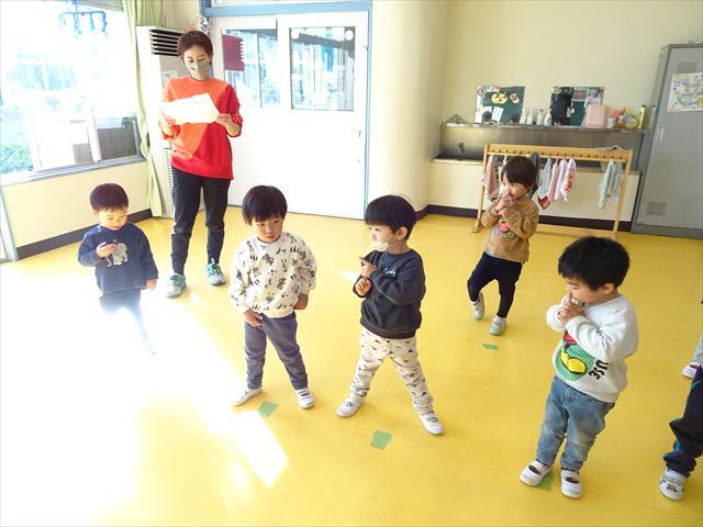 午後は、満3歳児さんは発表会の練習をしました。本番に向けてみんな気合いバッチリ!細かいところも確認しながら、元気に練習してくれました(