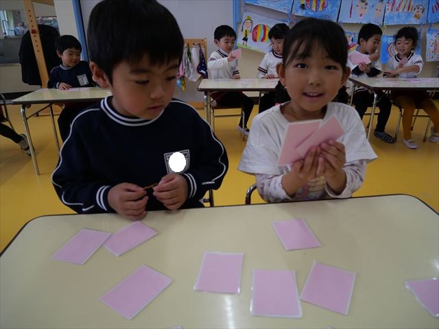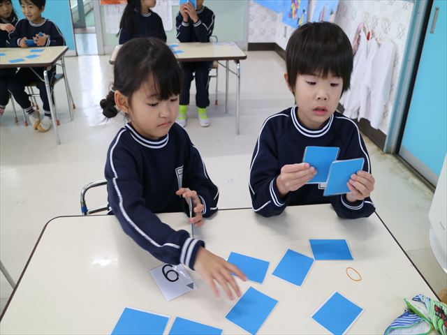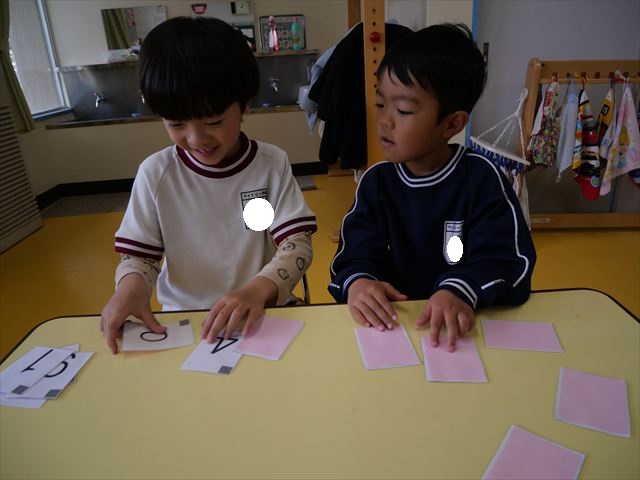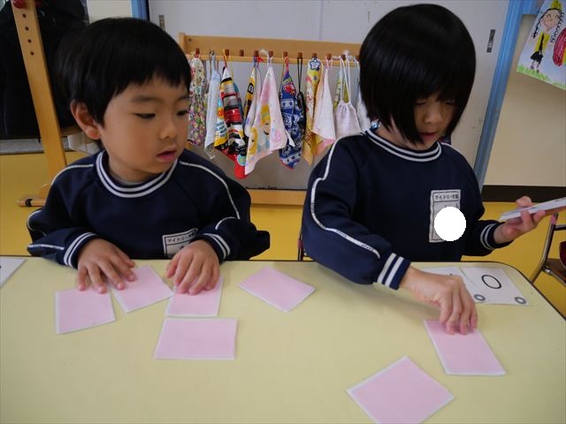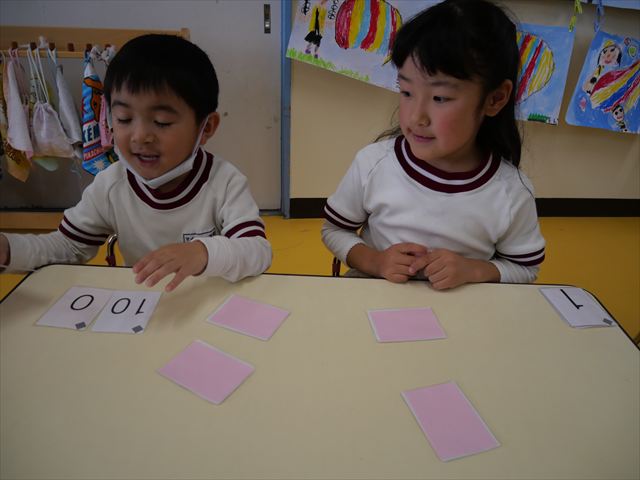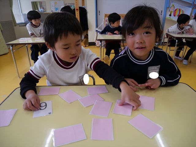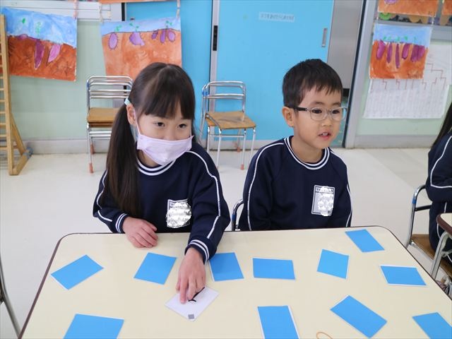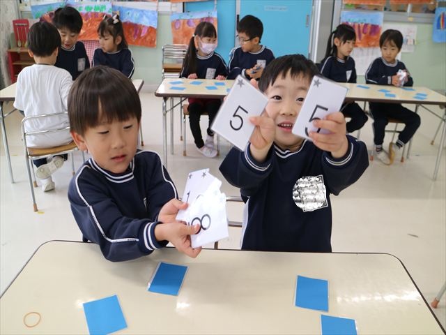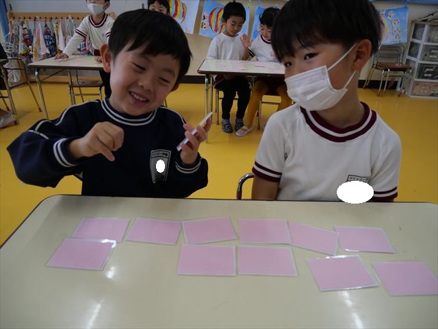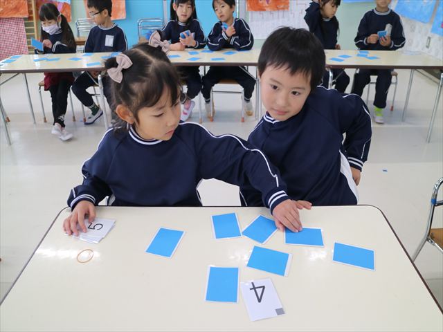 算数の時間では、数字のカードを使って神経衰弱をしました!前回やった「〇と〇で10になる」の応用として2つのカードを足して10になったらゲットできるというルールで行いました!足してなんの数字になるのかを考えながら楽しめました!