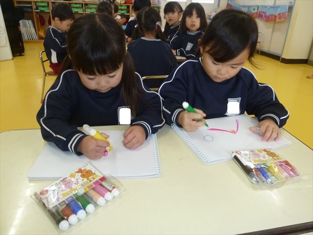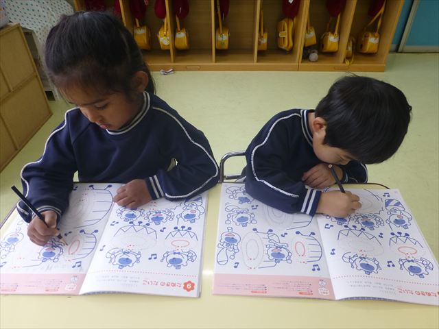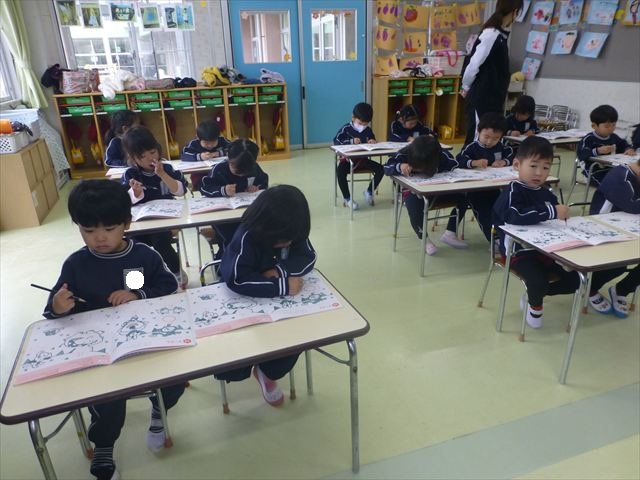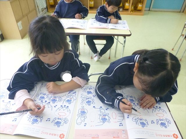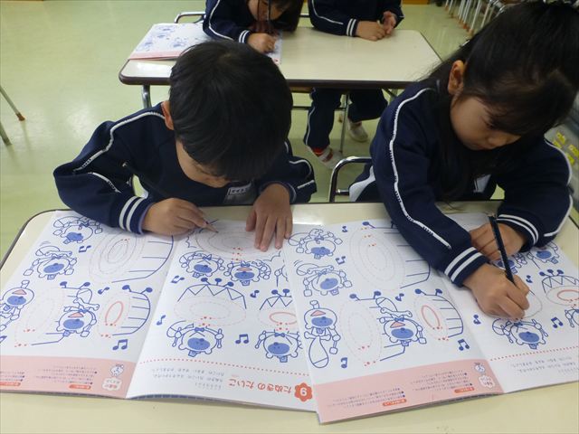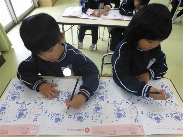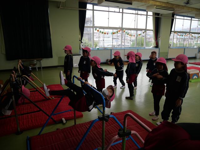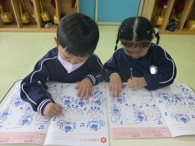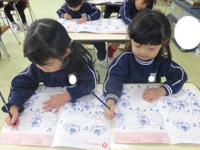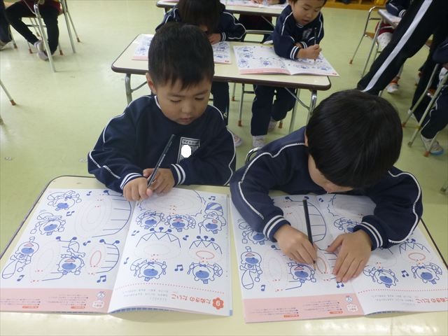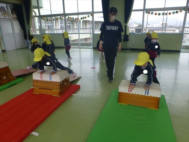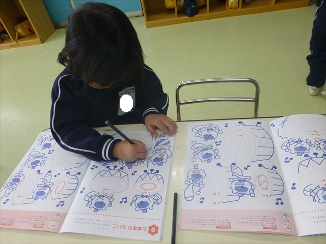 今日の運動教室は、合同で行ないました!(^^)!跳び箱、なわとび、鉄棒を頑張りました。飛び箱の3段が跳べるようになった子が増えてきました。出来るようにと何度も練習を頑張る様子が見られました。その後は、国語の時間として「せんあそび」をしました。今回のテーマは「楕円と丸」。丁寧に取り組むことができました。午後は、発表会の練習をしました。良い表情で踊れる子も増えました。