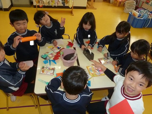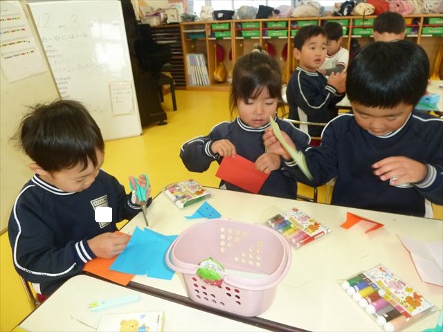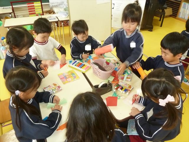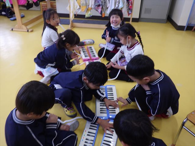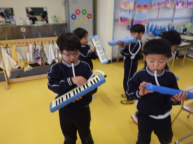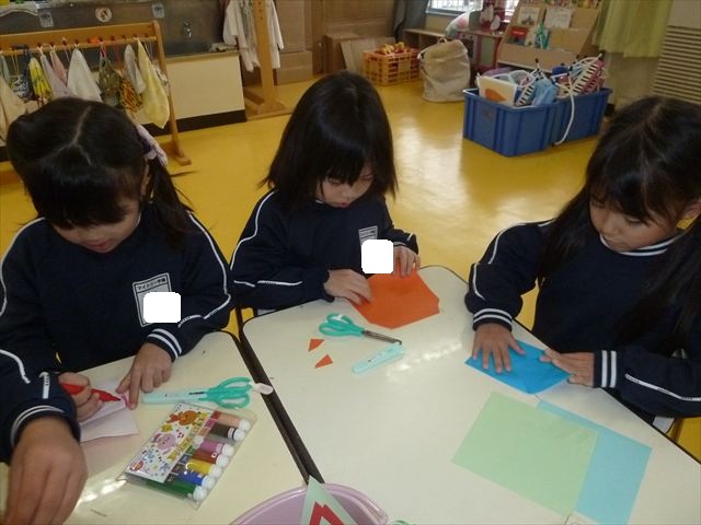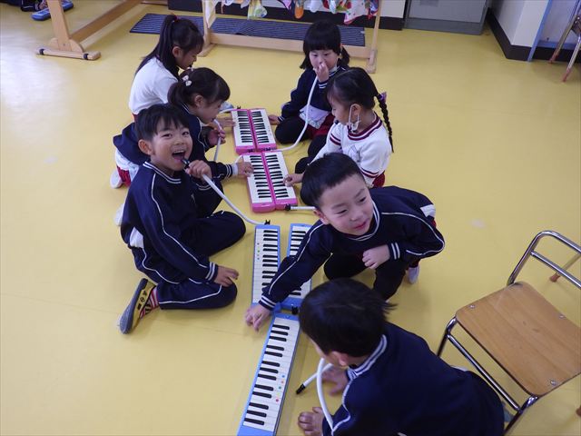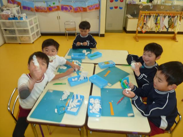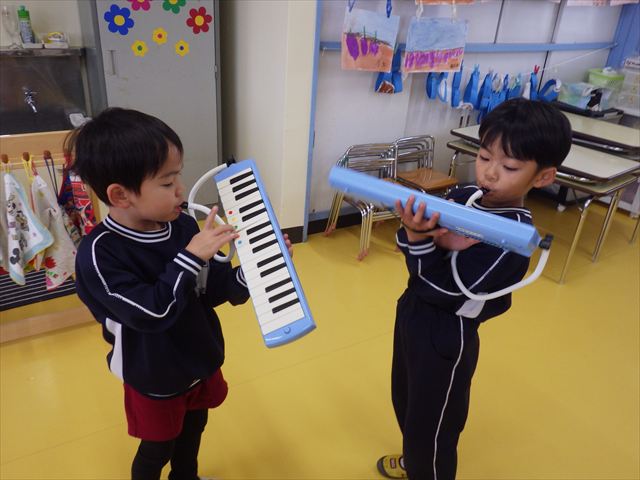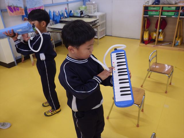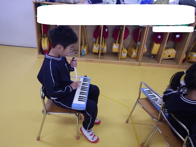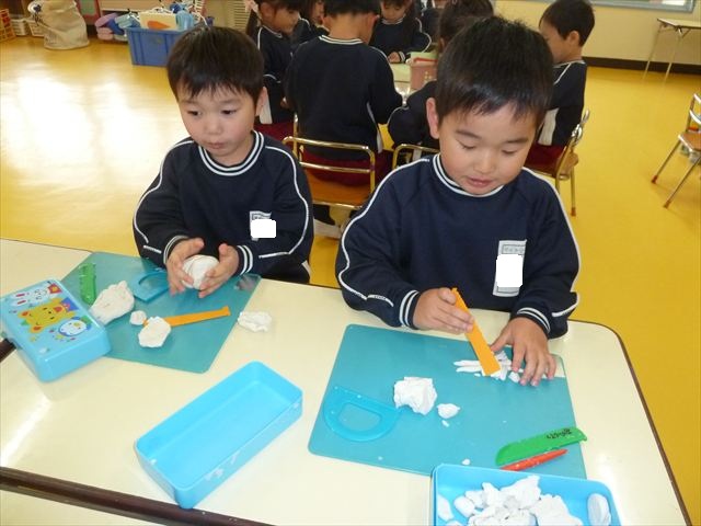 入室して朝の活動&鍵盤ハーモニカ、その後、折り紙や、粘土遊びをしたりしました。