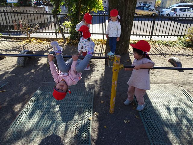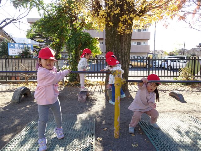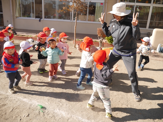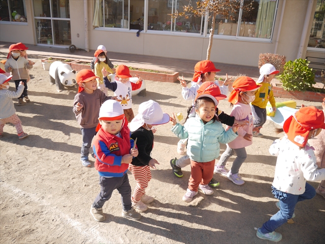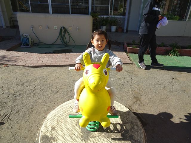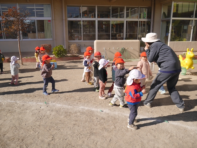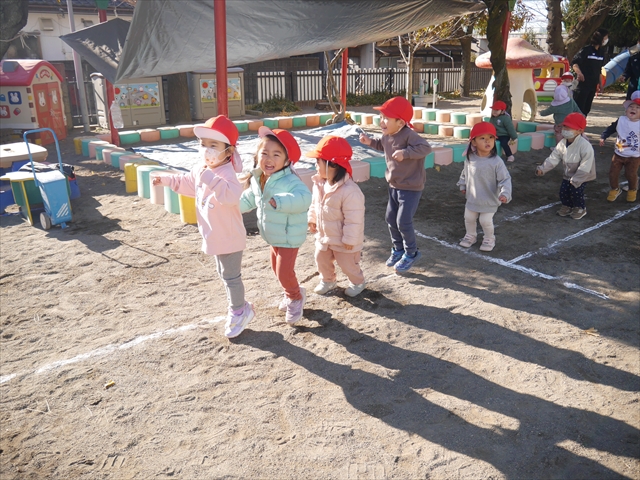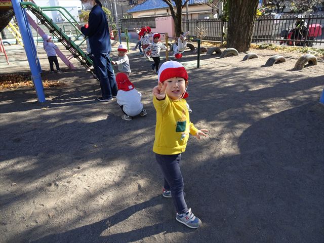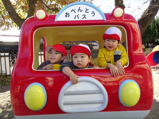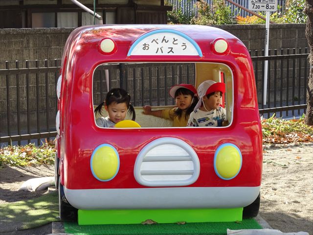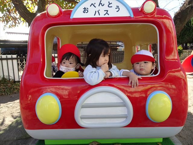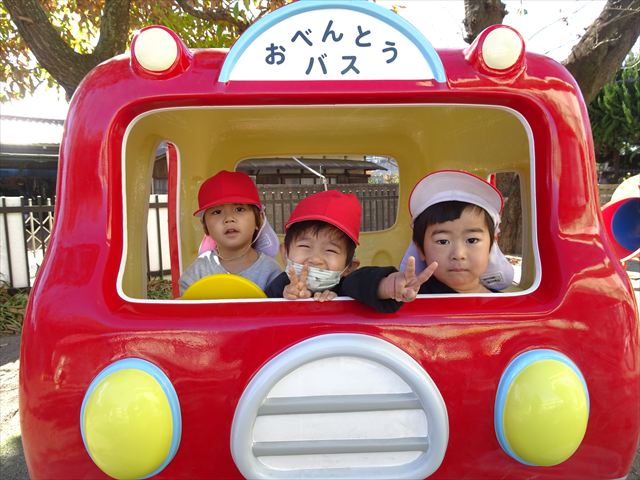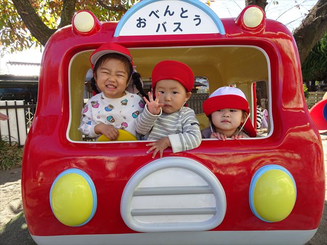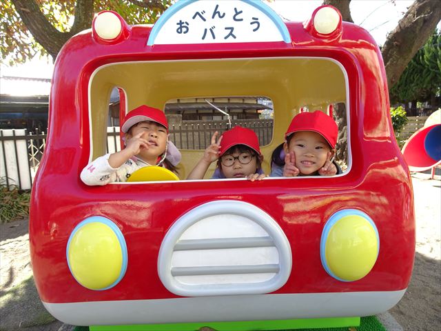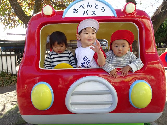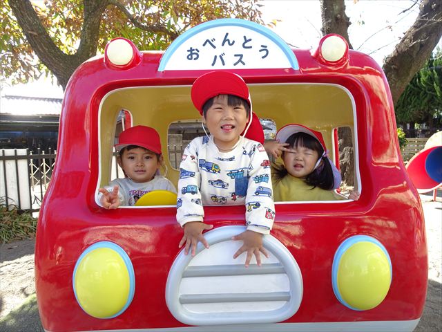 なわとび教室の後は戸外遊びをしました。まずは、大人気の“おべんとうバス”に乗ってハイポーズ!そのあとは、好きな遊びを楽しみました。