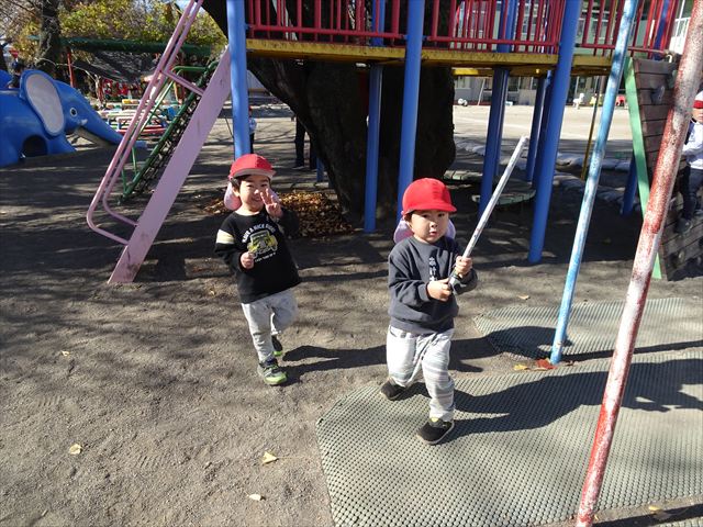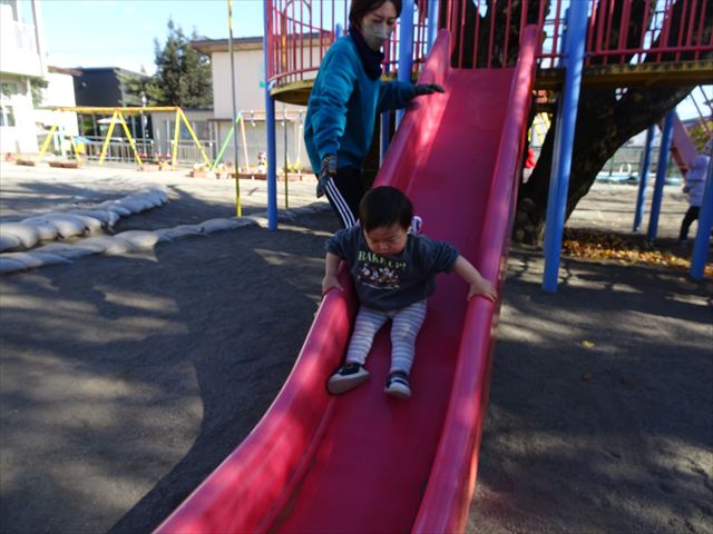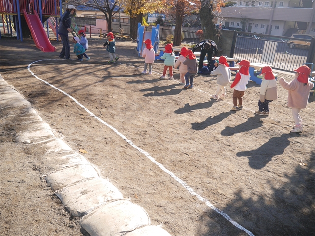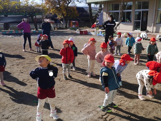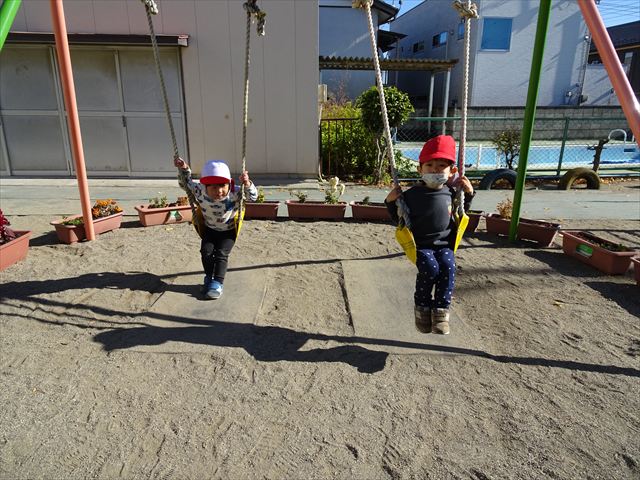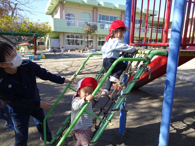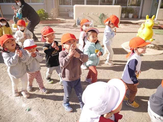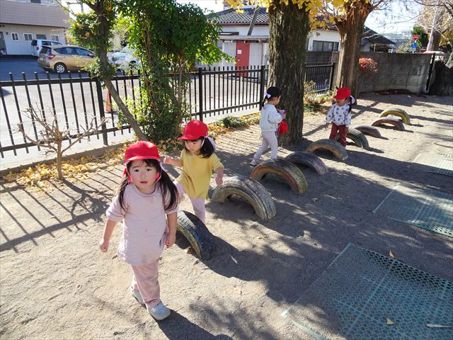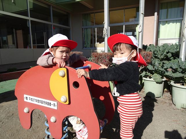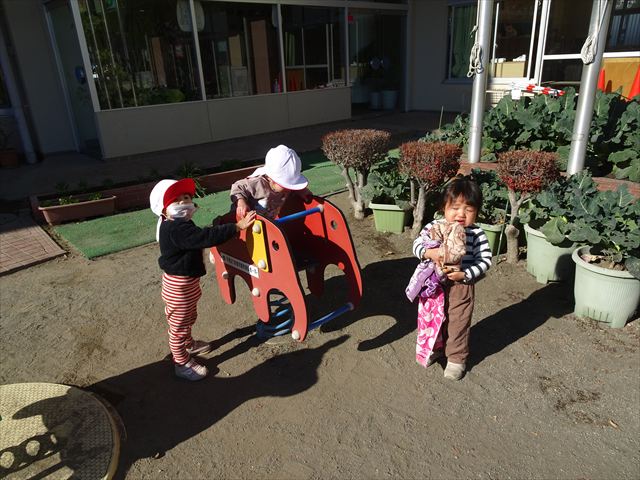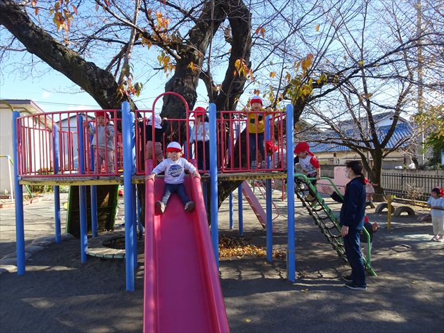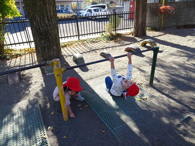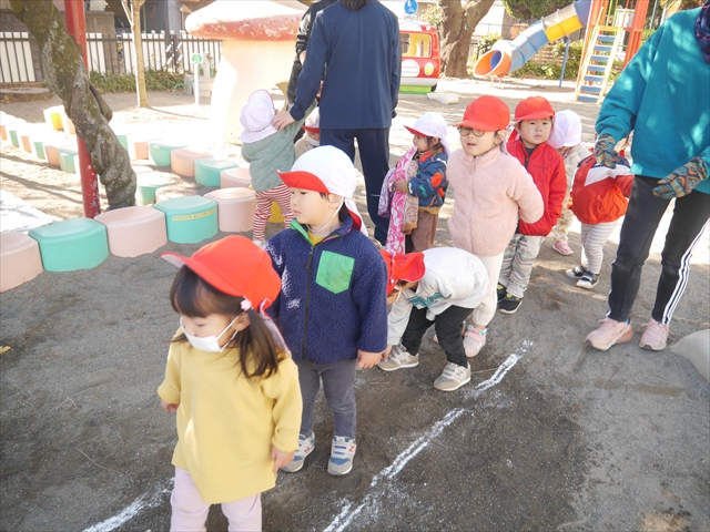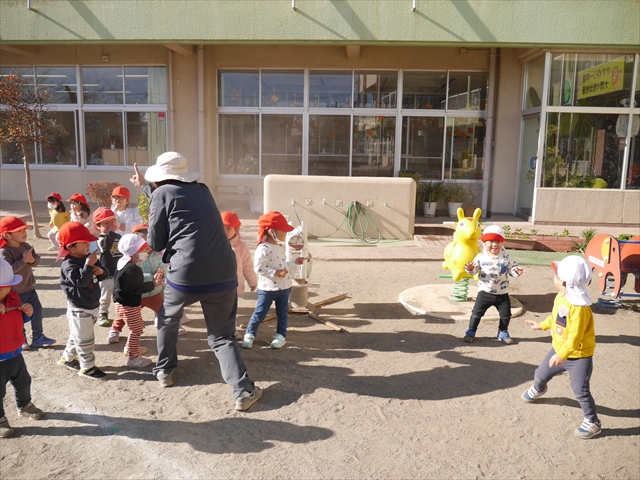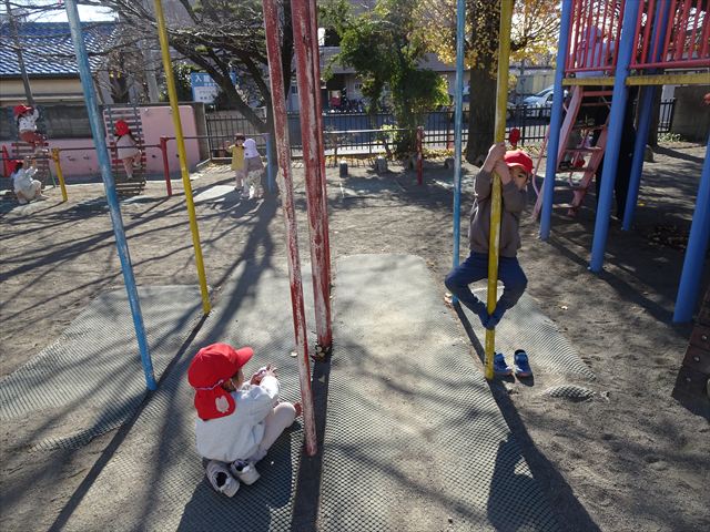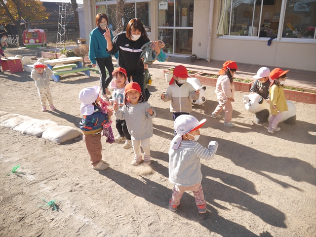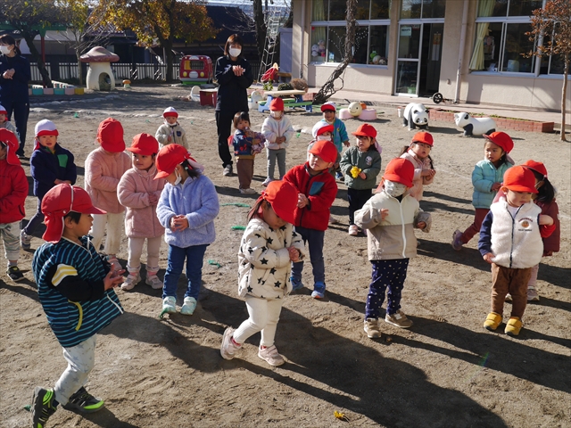 なわとび教室の後は戸外遊びをしました。まずは、大人気の“おべんとうバス”に乗ってハイポーズ!そのあとは、好きな遊びを楽しみました。