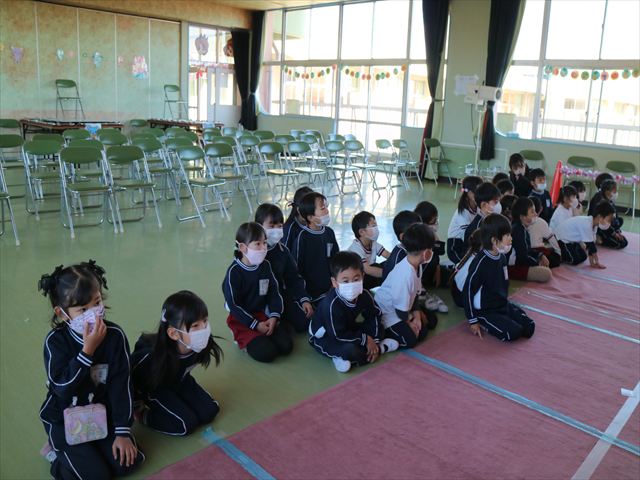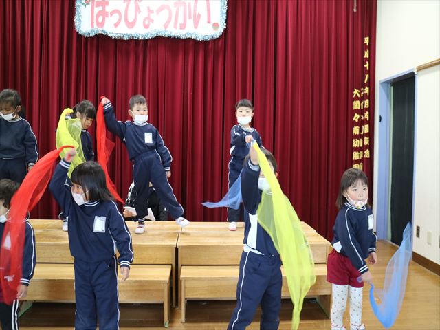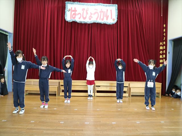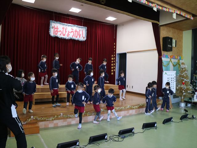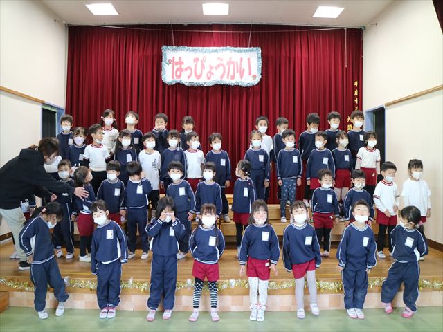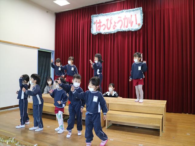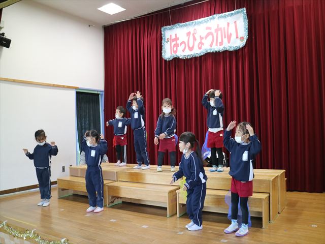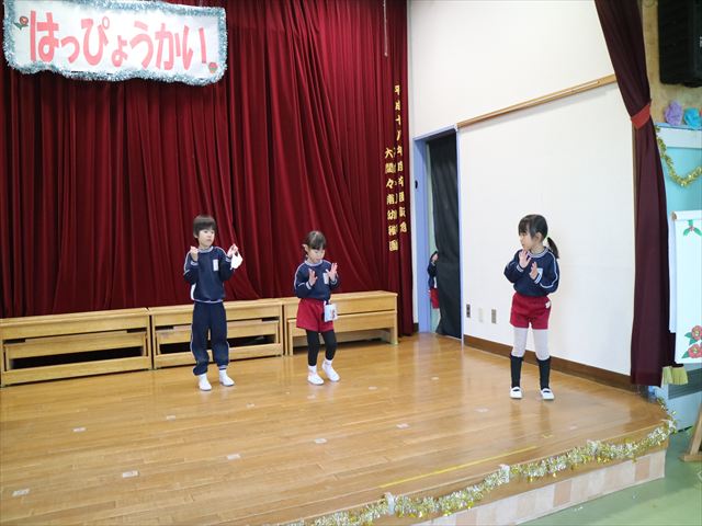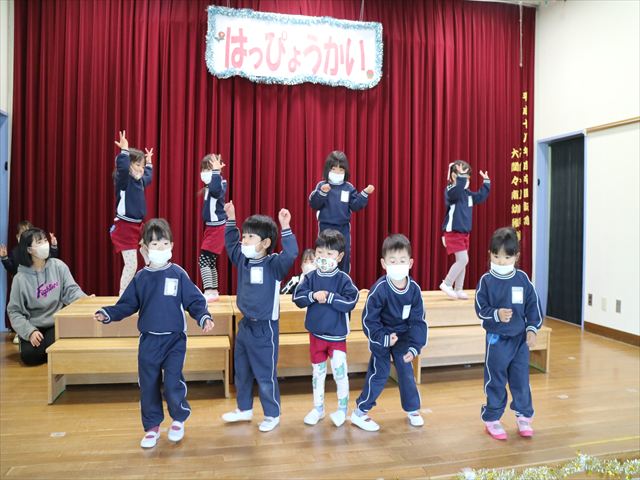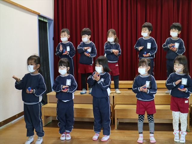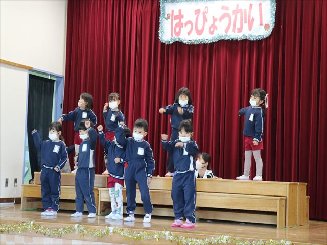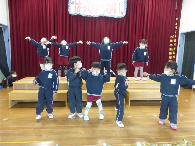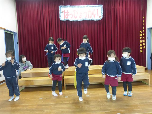 今日は、なわとび教室の後、発表会の練習をしました。今日は年長さんがお客さんになってくれたので張り切って踊って歌った年少さんでした\(^o^)/