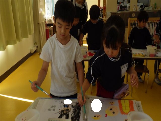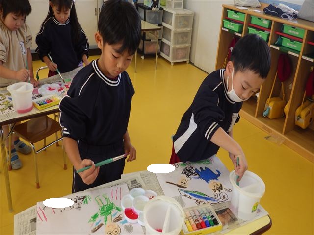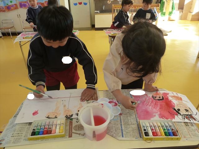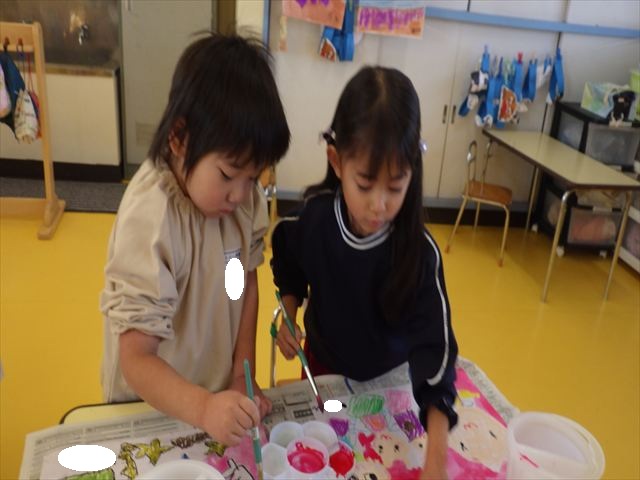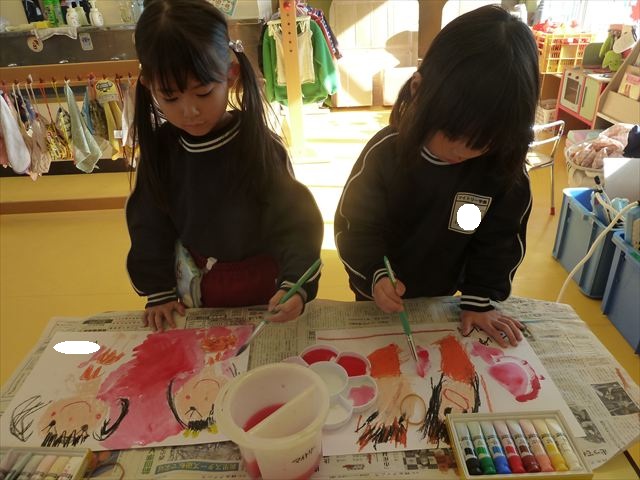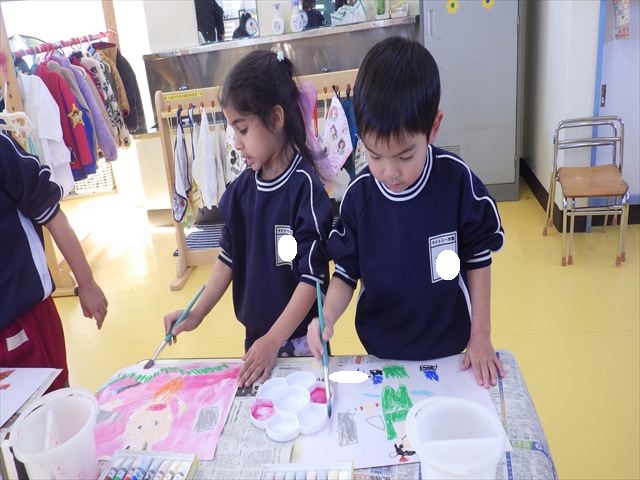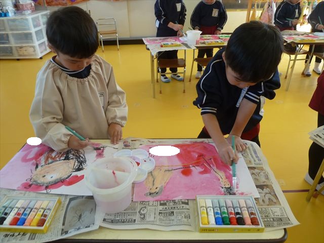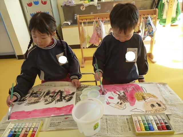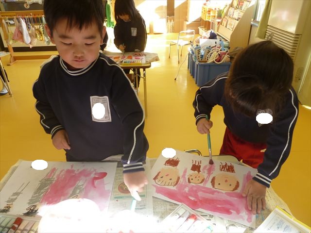 今日は、先日行った発表会の絵を描きました。みんなとっても上手に発表が出来ましたよね!子どもたちも「お家の人にたくさん褒めてもらったよ。」と話をしてくれて、自信を持って絵を描く姿が見られました。クレパスで衣装姿の自分を描く子が多かったかなと思います。バックの色塗りは絵の具を使いました。