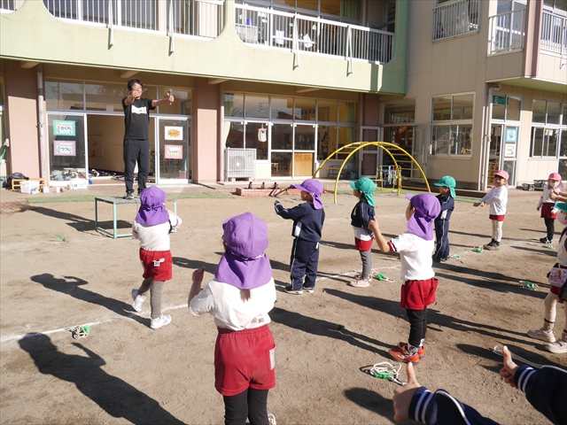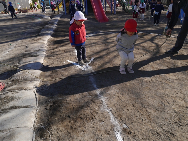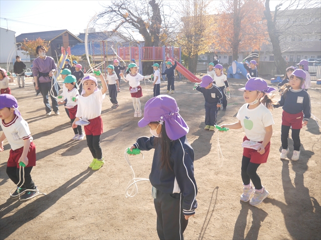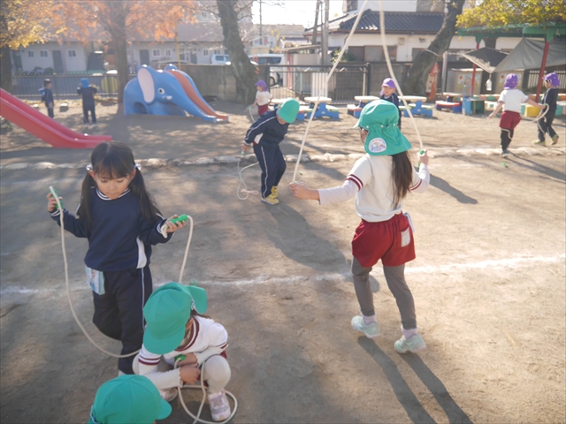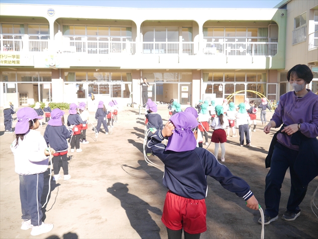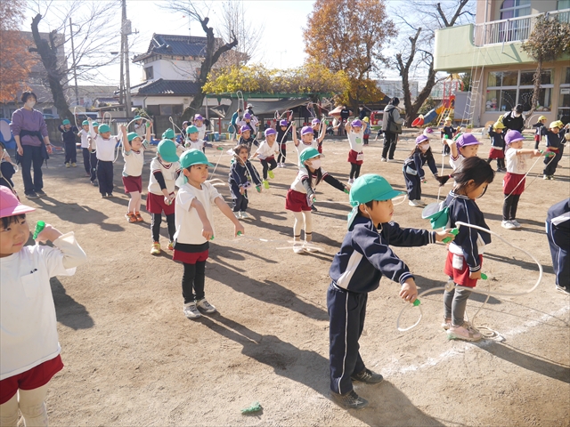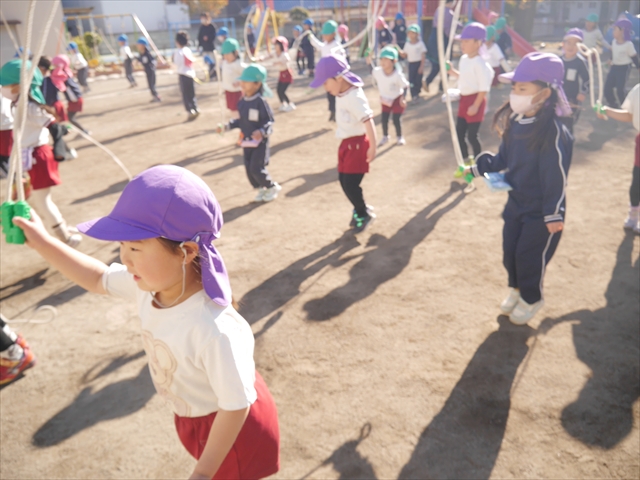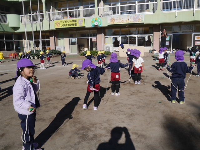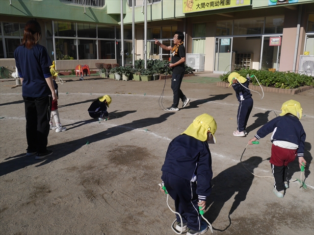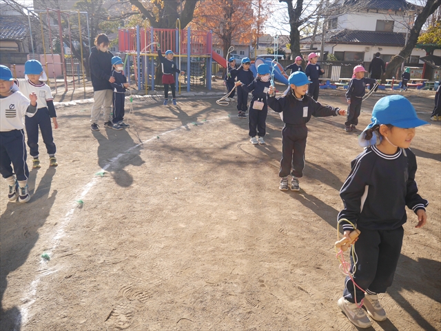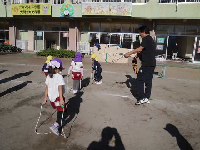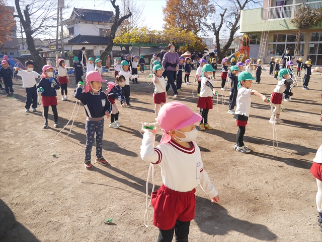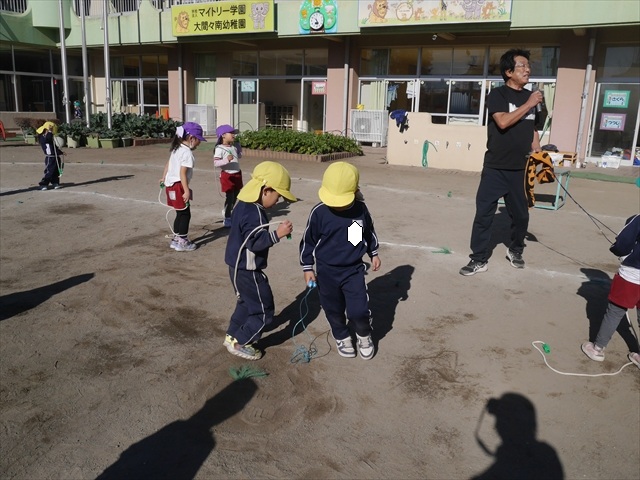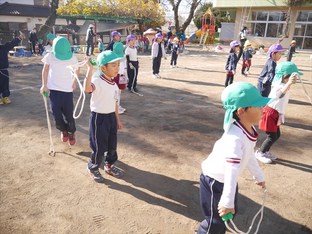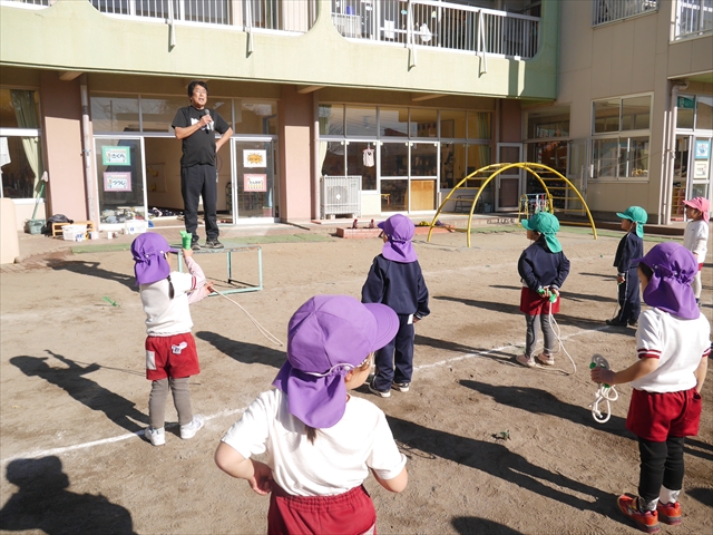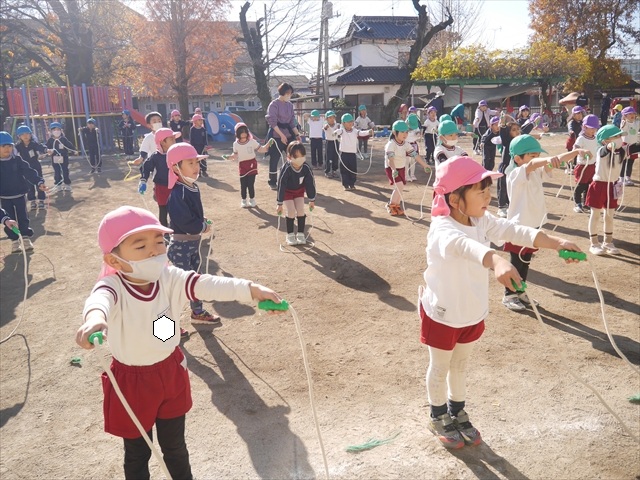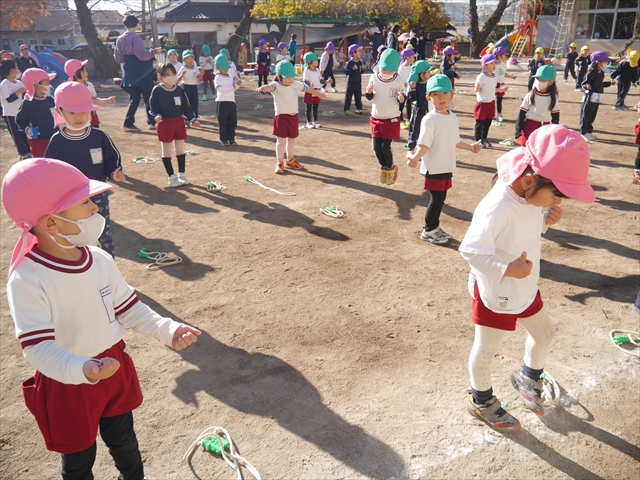 今日は、年長さんから年少さんまでの園長先生の「なわとび教室」を行いました。園長先生が「なわとび」の前跳びが1回でもできるように一番初歩から段階的に教えてくれました。縄を持たずに跳ぶリズムや肩・腕・手首の回し方、親指を上に向けながら縄を回すやり方から始まり、片手に縄を持って肩・腕を回しながらリズム良く跳ぶ方法を学び、最後に両手に縄を持って、肩・腕を回し手首のスナップ・回転をきかせて回す方法を学び、全員が1回以上は跳べるように頑張りました。年長さんや年中さんは、上手な子も多いので、さらに上手に回数も多く跳べるように頑張りました。また、年少さんは1回でも跳べるように一人一人が一生懸命頑張りました。