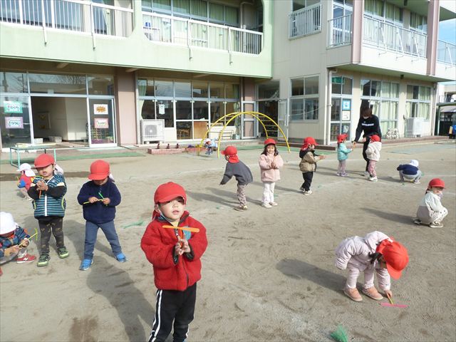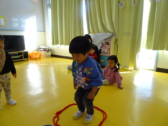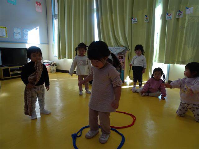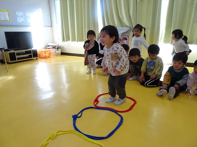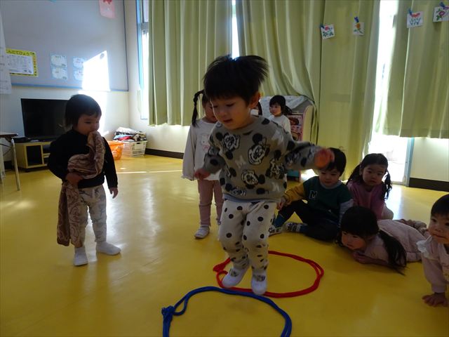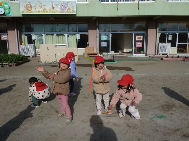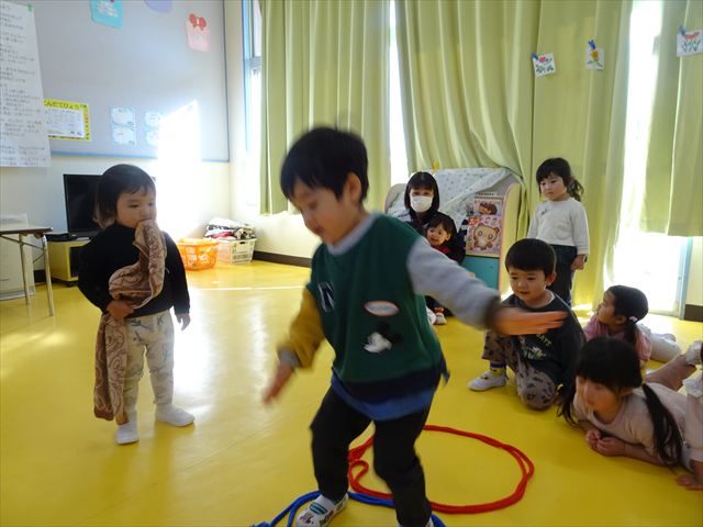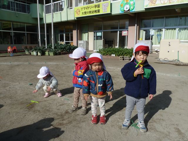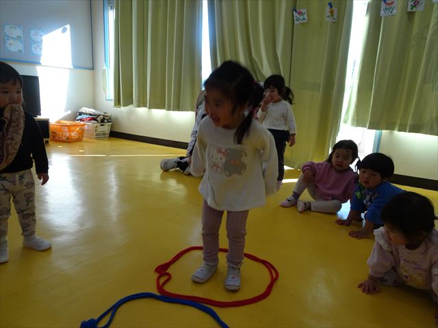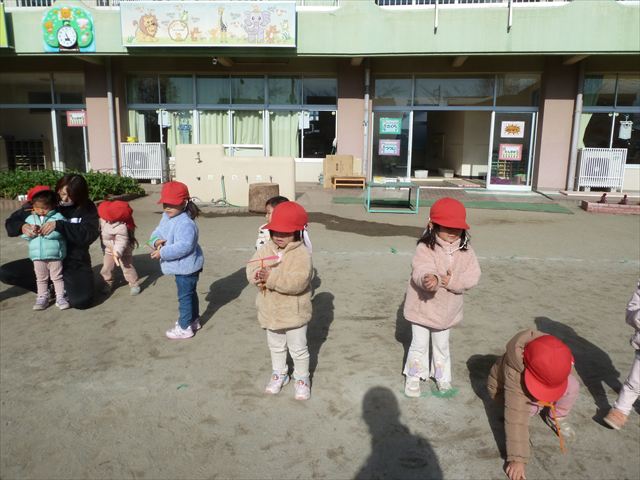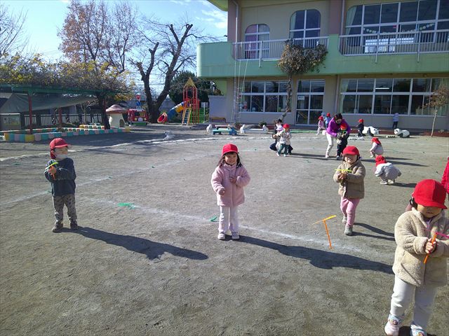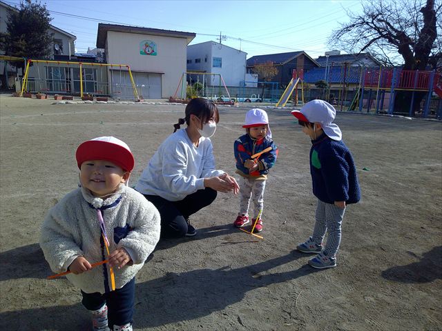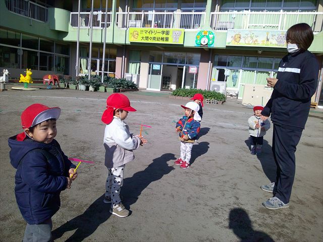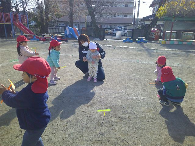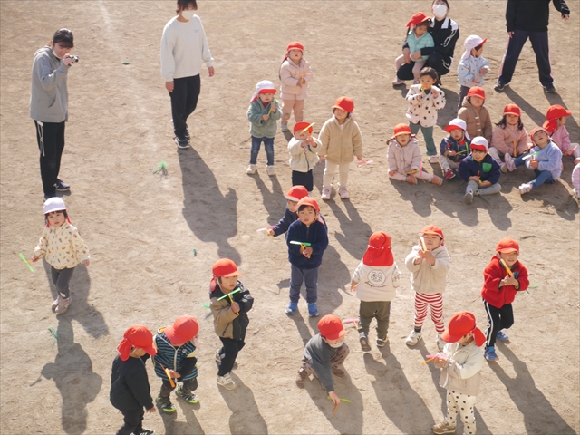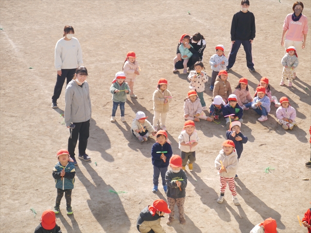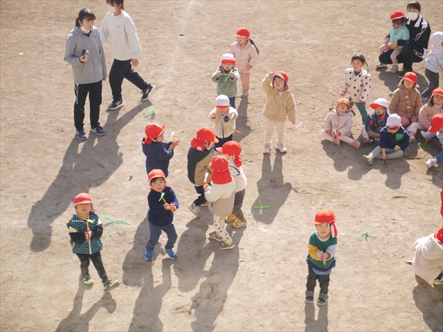 今日は、主体性の時間で竹とんぼ遊びをしました!「竹とんぼって知ってる?」「しらなーい」「ドラえもんのタケコプターみたいなやつだよ」「しってる~!」さすがみんな大好きドラえもんです!タケコプターは頭に付ければみんなも飛べるけど、竹とんぼは竹とんぼだけで飛ばすことを説明しました。飛ばし方を説明していざ実践。初めのうちは「先生どうやるの~」と苦戦していましたが、コツを掴むとあっという間に飛ばせるようになりました!飛ばせると「先生見て!飛んだ!」と嬉しそうなたんぽぽさん。2歳児さん、3歳児の男の子、女の子に分かれて飛ばしてみました。最後はみんなでせーの!でお空に向かってビューン!飛んでいる竹とんぼを追いかけるみんなの目はキラキラしていて、とても楽しそうなたんぽぽさんでした!(^^)! 午後は、B組さんがリトミックをしました。まずはみんな大好き「おおきく3つ」。その後はハチさんと一緒に、お部屋に隠れているお花を探しに行き、B組さんも6つのお花を見つけられました(^O^)そして、ロープで輪っかを作って両足ジャンプ。やはり両足ジャンプは難しそうな子もいたので、またみんなで練習してみましょう!ともえ先生、ありがとうございました☆