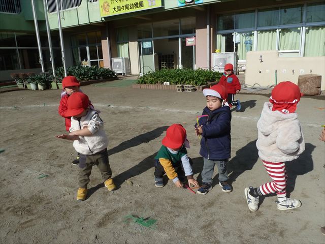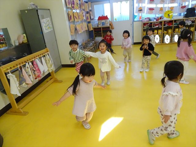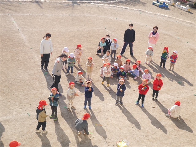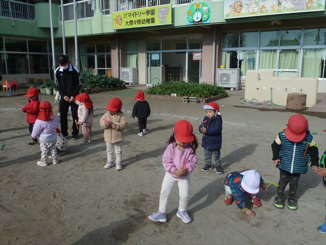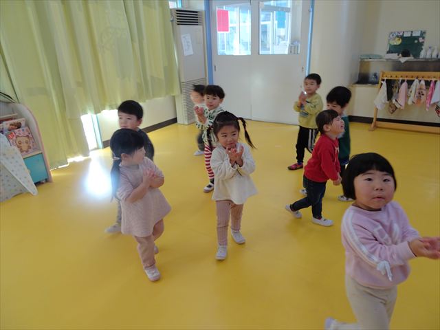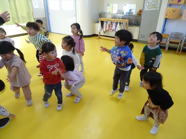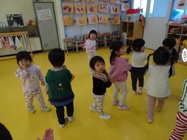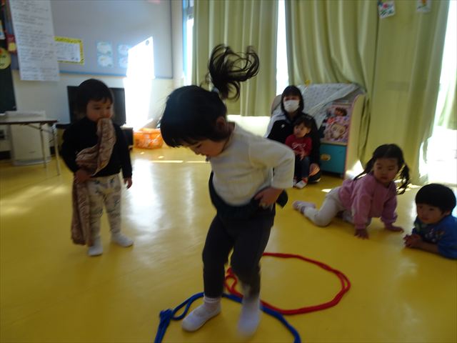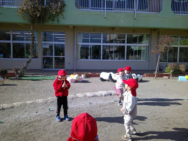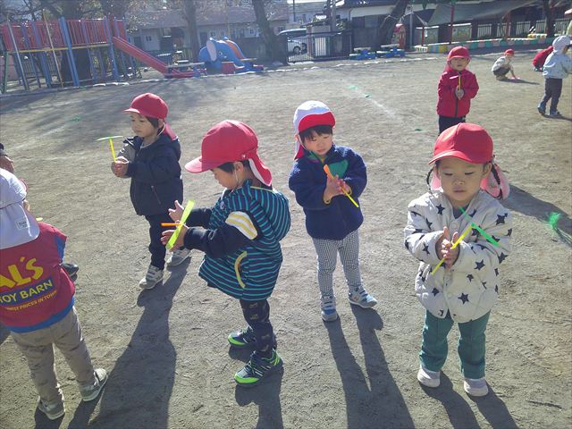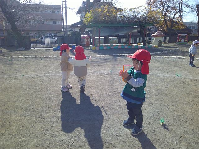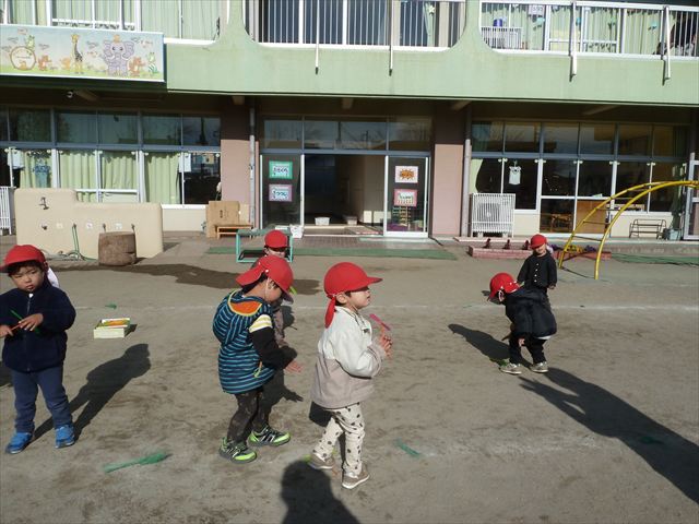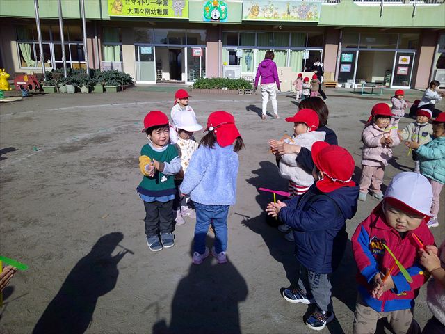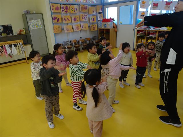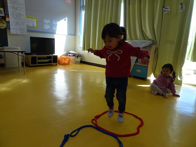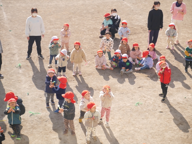 今日は、主体性の時間で竹とんぼ遊びをしました!「竹とんぼって知ってる?」「しらなーい」「ドラえもんのタケコプターみたいなやつだよ」「しってる~!」さすがみんな大好きドラえもんです!タケコプターは頭に付ければみんなも飛べるけど、竹とんぼは竹とんぼだけで飛ばすことを説明しました。飛ばし方を説明していざ実践。初めのうちは「先生どうやるの~」と苦戦していましたが、コツを掴むとあっという間に飛ばせるようになりました!飛ばせると「先生見て!飛んだ!」と嬉しそうなたんぽぽさん。2歳児さん、3歳児の男の子、女の子に分かれて飛ばしてみました。最後はみんなでせーの!でお空に向かってビューン!飛んでいる竹とんぼを追いかけるみんなの目はキラキラしていて、とても楽しそうなたんぽぽさんでした!(^^)! 午後は、B組さんがリトミックをしました。まずはみんな大好き「おおきく3つ」。その後はハチさんと一緒に、お部屋に隠れているお花を探しに行き、B組さんも6つのお花を見つけられました(^O^)そして、ロープで輪っかを作って両足ジャンプ。やはり両足ジャンプは難しそうな子もいたので、またみんなで練習してみましょう!ともえ先生、ありがとうございました☆