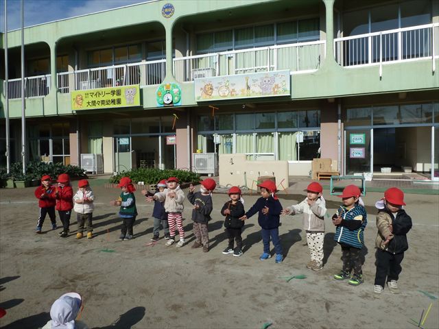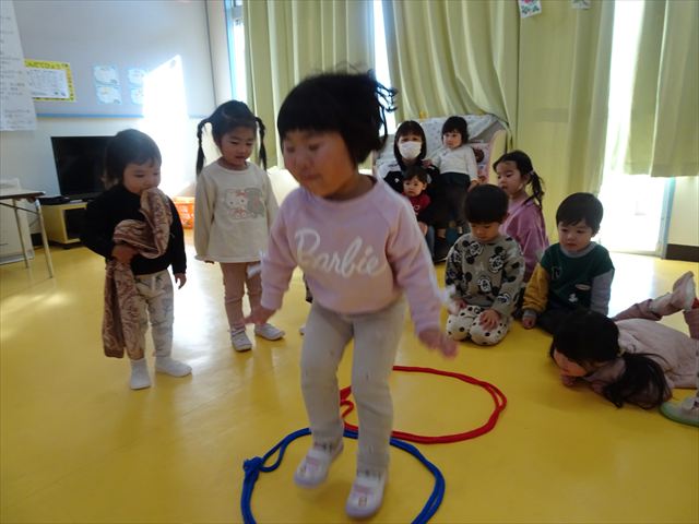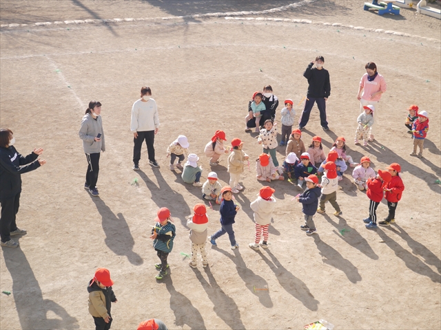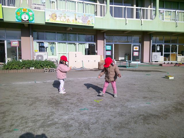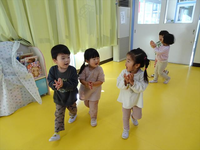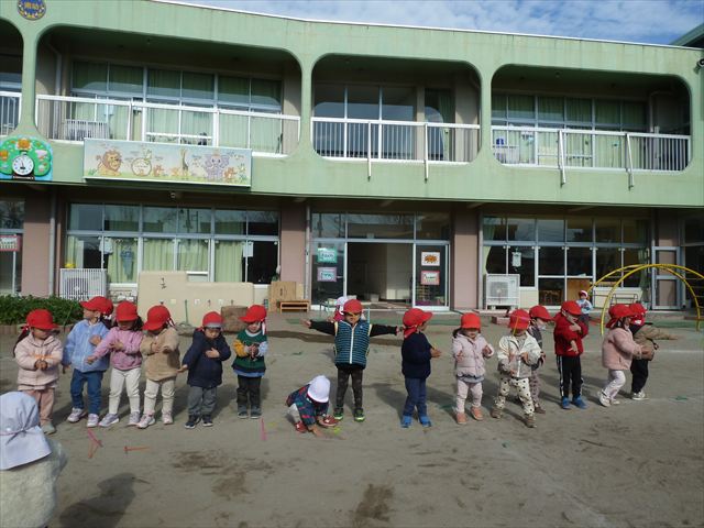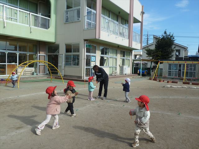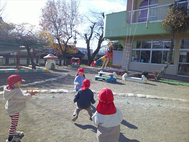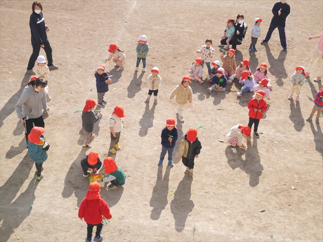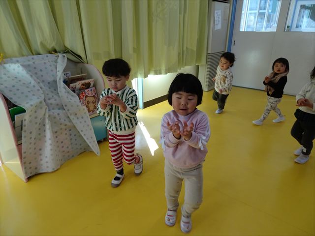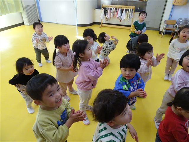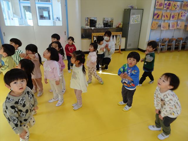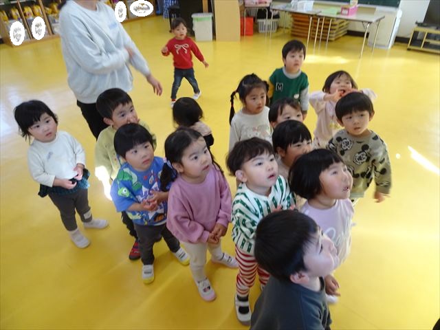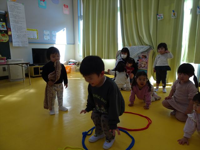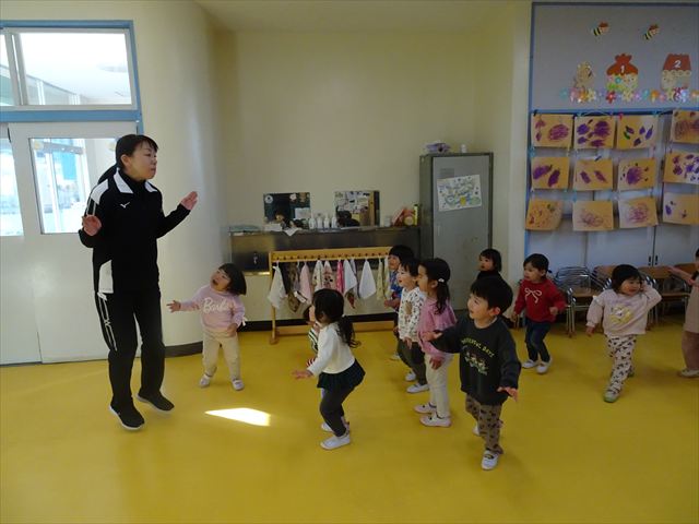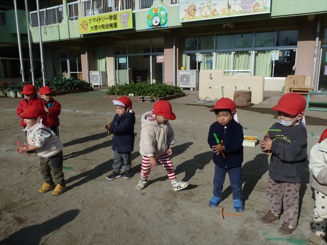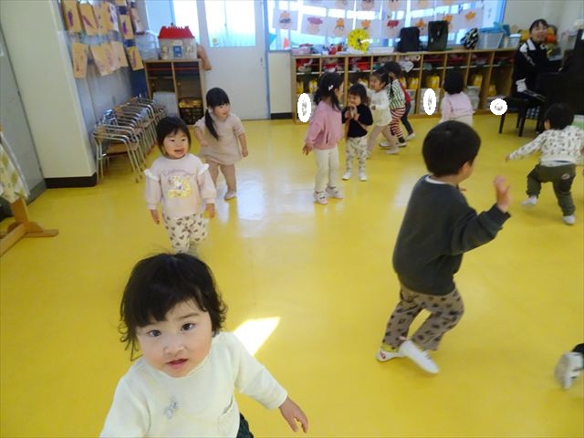 今日は、主体性の時間で竹とんぼ遊びをしました!「竹とんぼって知ってる?」「しらなーい」「ドラえもんのタケコプターみたいなやつだよ」「しってる~!」さすがみんな大好きドラえもんです!タケコプターは頭に付ければみんなも飛べるけど、竹とんぼは竹とんぼだけで飛ばすことを説明しました。飛ばし方を説明していざ実践。初めのうちは「先生どうやるの~」と苦戦していましたが、コツを掴むとあっという間に飛ばせるようになりました!飛ばせると「先生見て!飛んだ!」と嬉しそうなたんぽぽさん。2歳児さん、3歳児の男の子、女の子に分かれて飛ばしてみました。最後はみんなでせーの!でお空に向かってビューン!飛んでいる竹とんぼを追いかけるみんなの目はキラキラしていて、とても楽しそうなたんぽぽさんでした!(^^)! 午後は、B組さんがリトミックをしました。まずはみんな大好き「おおきく3つ」。その後はハチさんと一緒に、お部屋に隠れているお花を探しに行き、B組さんも6つのお花を見つけられました(^O^)そして、ロープで輪っかを作って両足ジャンプ。やはり両足ジャンプは難しそうな子もいたので、またみんなで練習してみましょう!ともえ先生、ありがとうございました☆