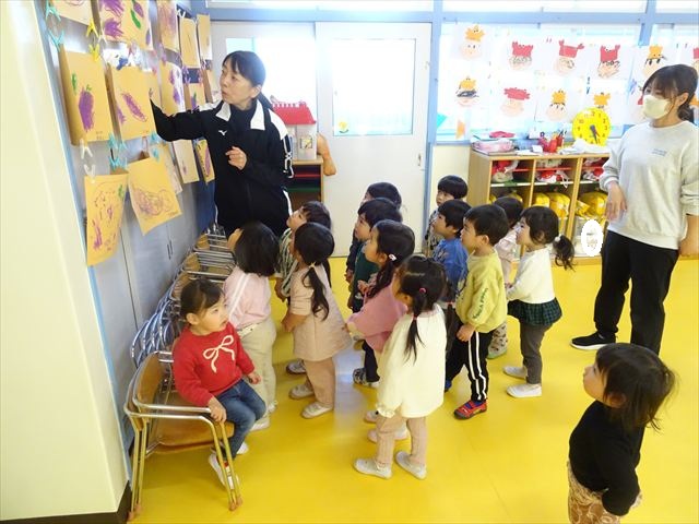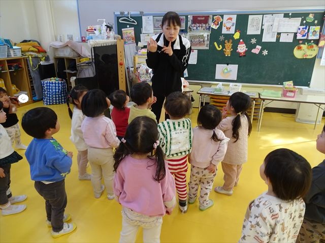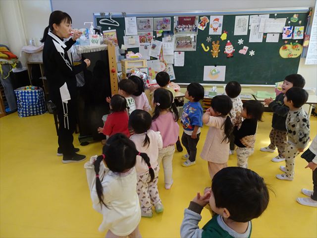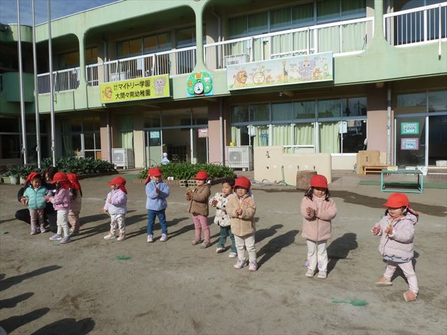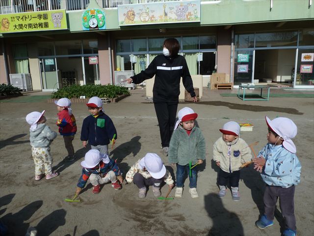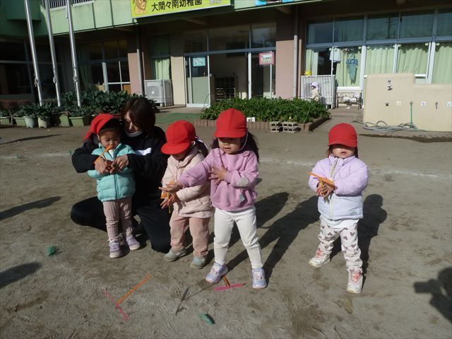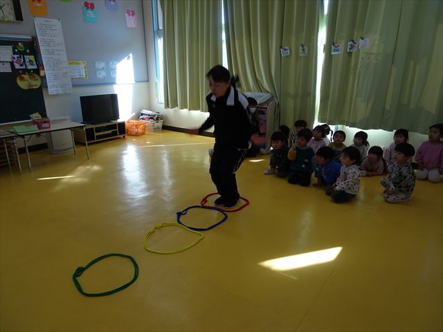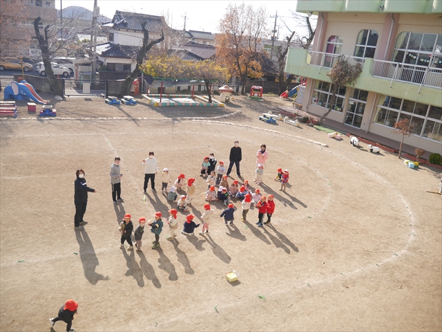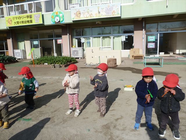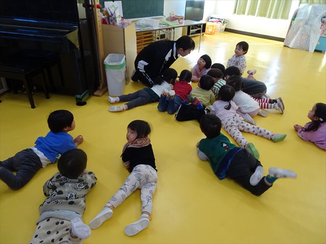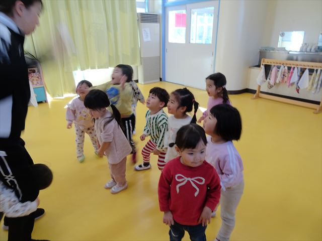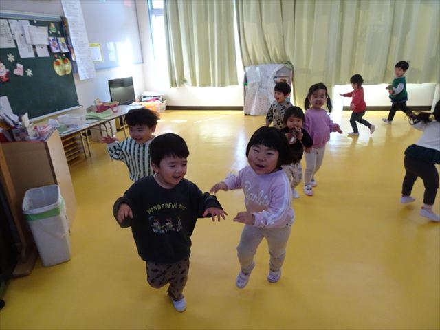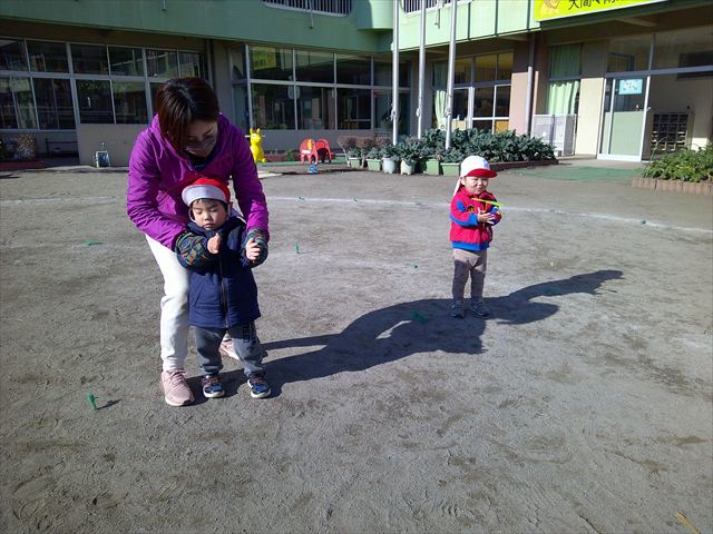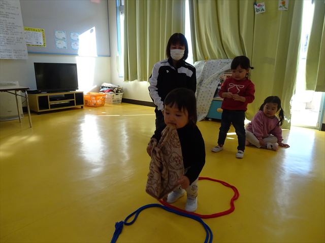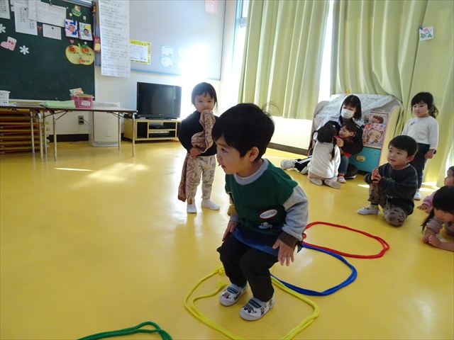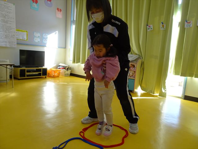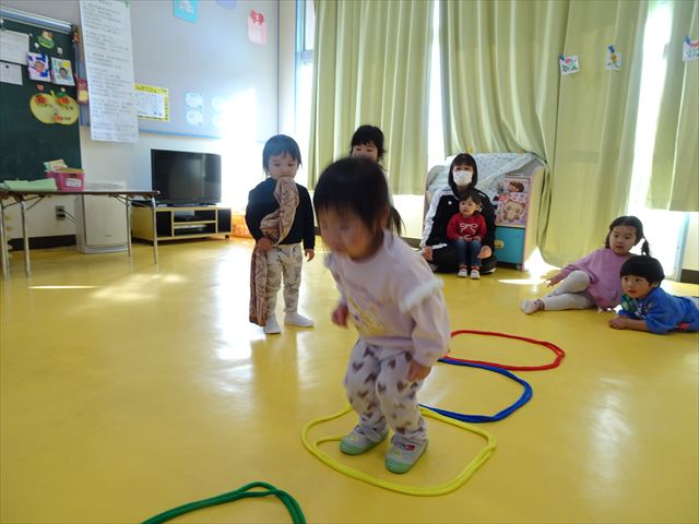 今日は、主体性の時間で竹とんぼ遊びをしました!「竹とんぼって知ってる?」「しらなーい」「ドラえもんのタケコプターみたいなやつだよ」「しってる~!」さすがみんな大好きドラえもんです!タケコプターは頭に付ければみんなも飛べるけど、竹とんぼは竹とんぼだけで飛ばすことを説明しました。飛ばし方を説明していざ実践。初めのうちは「先生どうやるの~」と苦戦していましたが、コツを掴むとあっという間に飛ばせるようになりました!飛ばせると「先生見て!飛んだ!」と嬉しそうなたんぽぽさん。2歳児さん、3歳児の男の子、女の子に分かれて飛ばしてみました。最後はみんなでせーの!でお空に向かってビューン!飛んでいる竹とんぼを追いかけるみんなの目はキラキラしていて、とても楽しそうなたんぽぽさんでした!(^^)! 午後は、B組さんがリトミックをしました。まずはみんな大好き「おおきく3つ」。その後はハチさんと一緒に、お部屋に隠れているお花を探しに行き、B組さんも6つのお花を見つけられました(^O^)そして、ロープで輪っかを作って両足ジャンプ。やはり両足ジャンプは難しそうな子もいたので、またみんなで練習してみましょう!ともえ先生、ありがとうございました☆