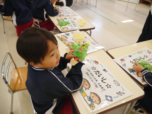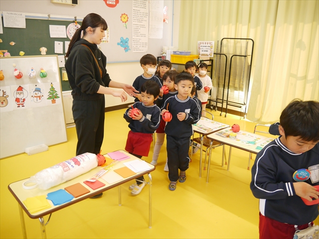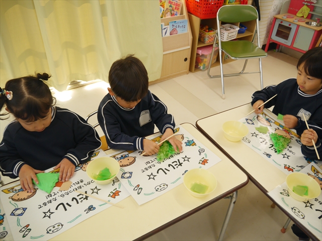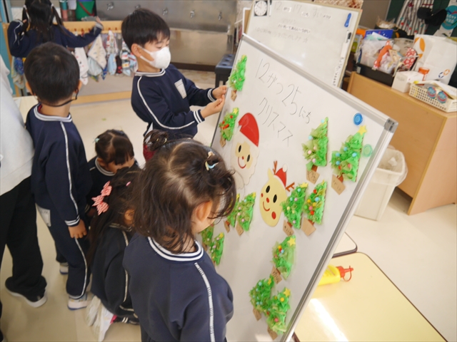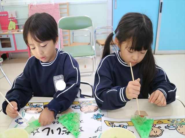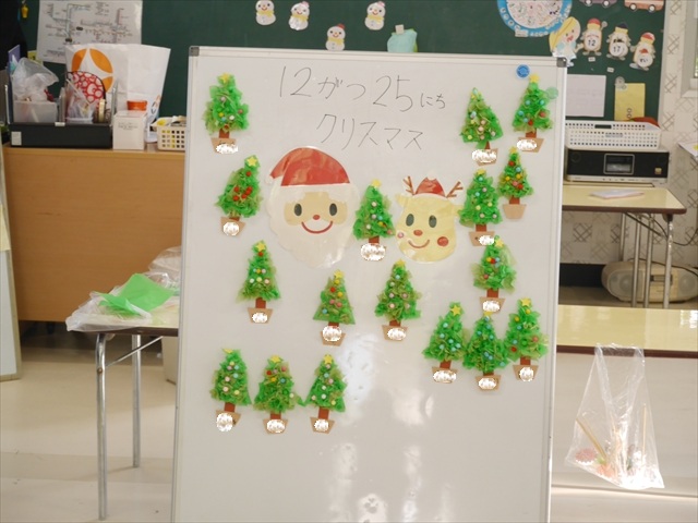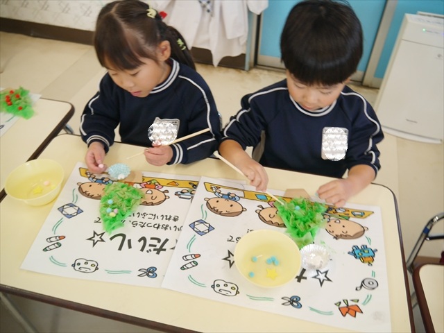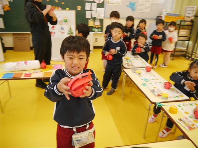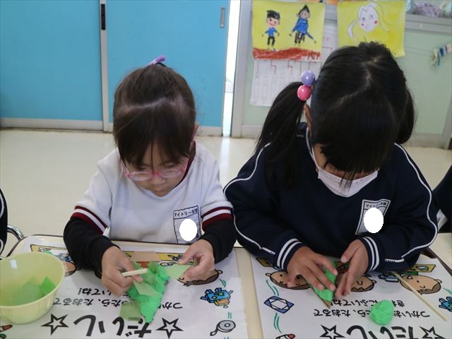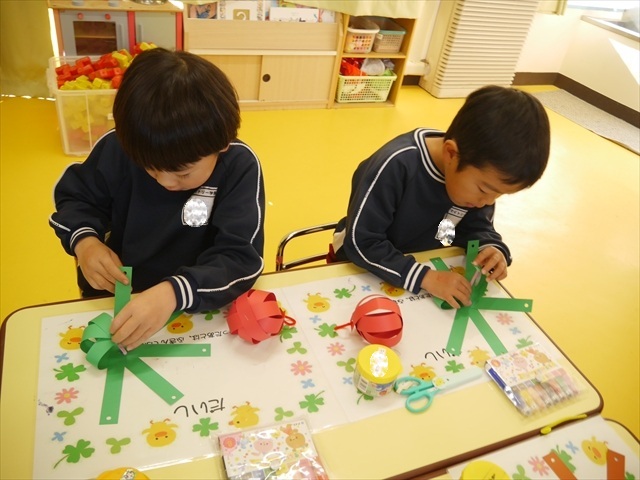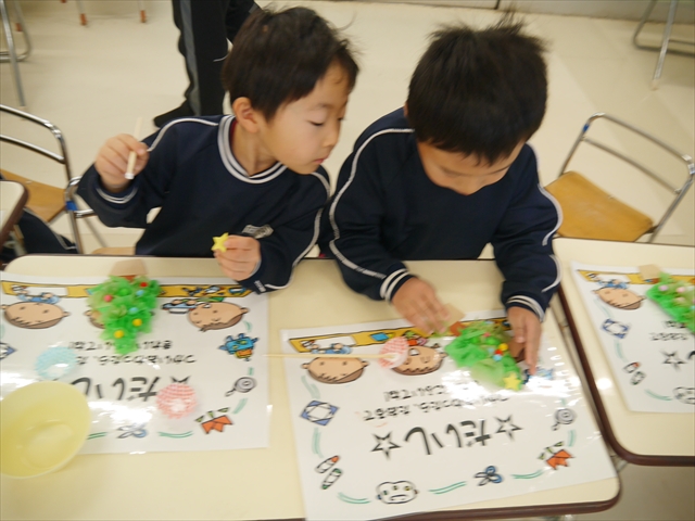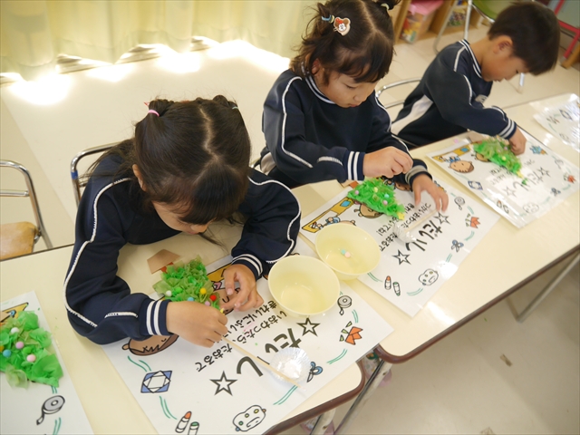 造形活動&自由保育の時間を行ないました。うみ組は、クリスマスを楽しみに出来るように「クリスマスツリー製作」をしました。今回は紙粘土に割り箸を使ってお花紙を刺して、ふわふわのツリーを表現し、ボンドで星やポンポンの飾りを付けました!お花紙を刺す技法は初めての経験で楽しみながら、集中して行うことができました(^-^)お部屋に飾って、後日持ち帰りますので楽しみにしていてください☆ たいよう組は、「クリスマスオーナメント作り」をしました!細長く切った画用紙とモールを使って丸いオーナメントを作ってサンタやトナカイ、雪だるまの顔を自分たちで作って張り付けて完成させました!色々な材料を好きに使ってオリジナルの飾りが作れて楽しめたようでした♡ 午後は、12月19日のさくらんぼクラブに年長組が参加する予定なので歌やダンスを練習しました!年長組みんなでクリスマスパーティーを盛り上げられるように頑張りたいと思います(^^)