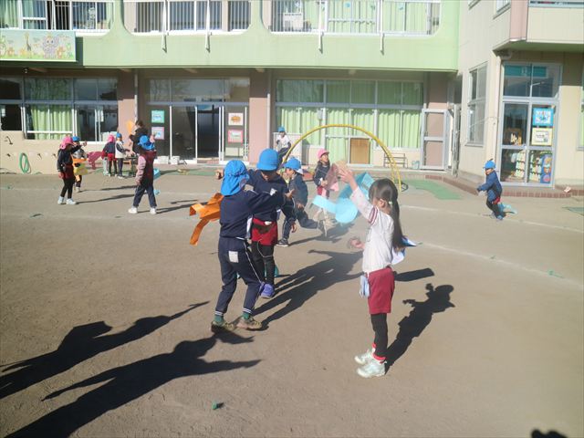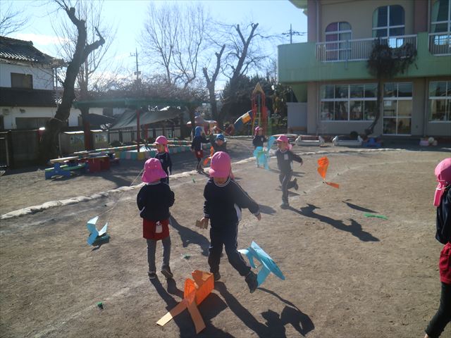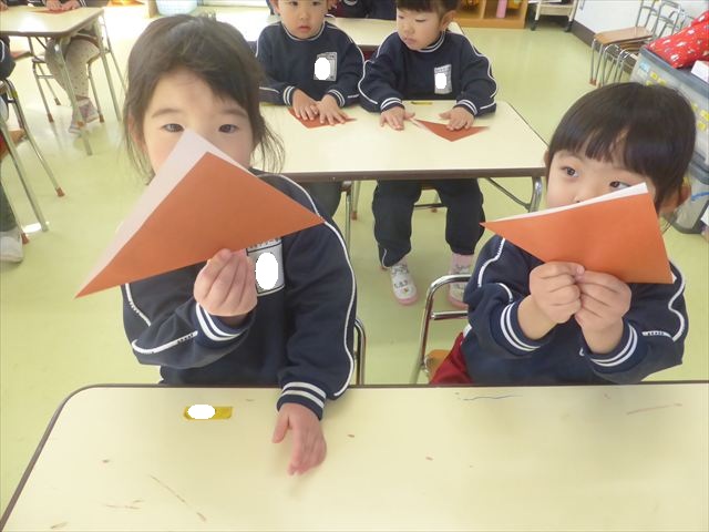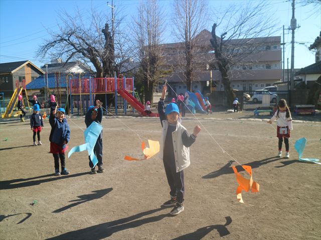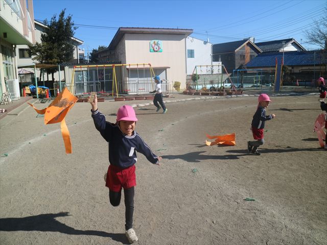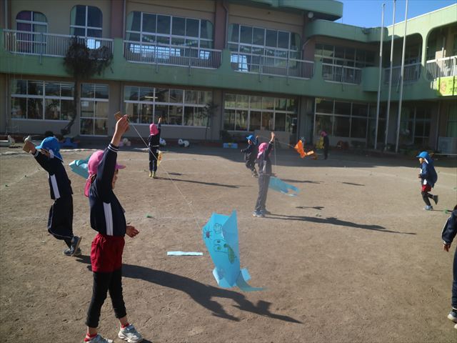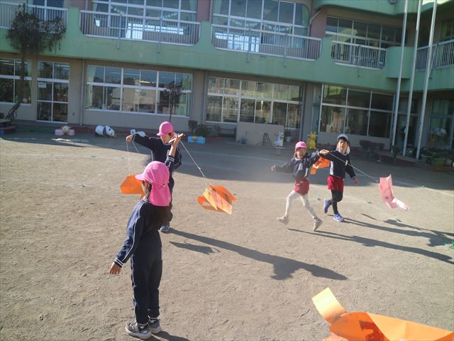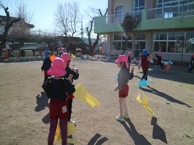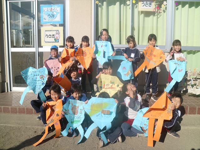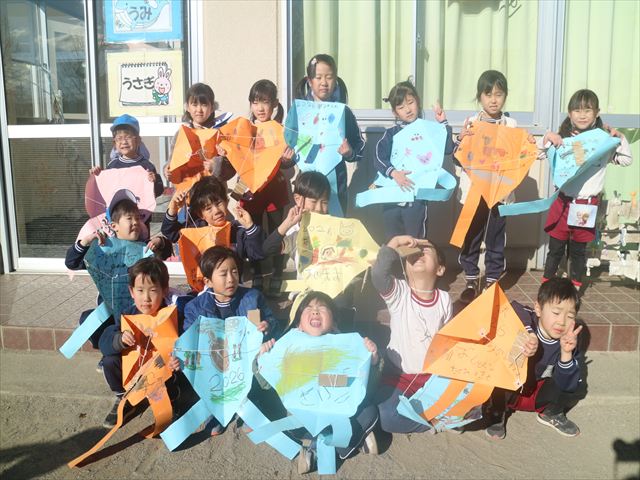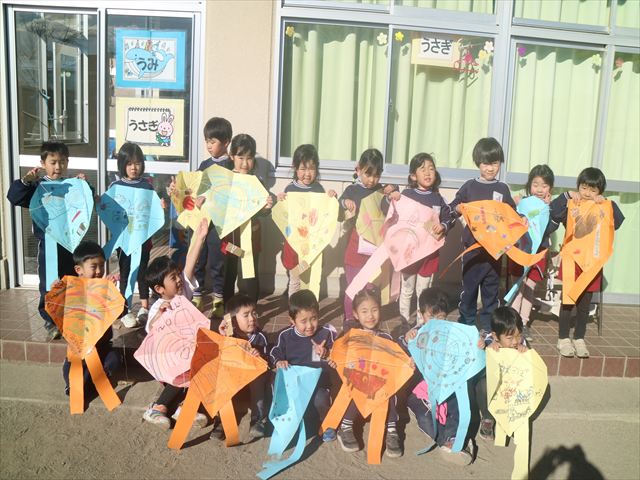 凧作りをしました!大きな画用紙を折ったり切ったりして、好きな絵を書いて凧を作りました!作った凧を持って午後に外で凧あげをしました!ちょうどよく風もふいていて楽しめました!