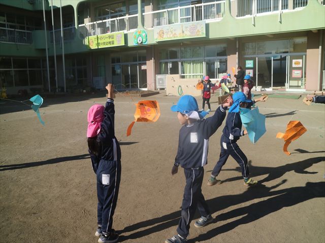 今日はみんなでたこ作りをしました!他の学年のお兄さんお姉さんたちがあげているのを見ていたので、楽しみにしていたようでした(