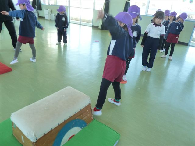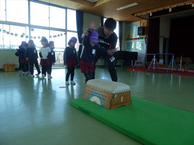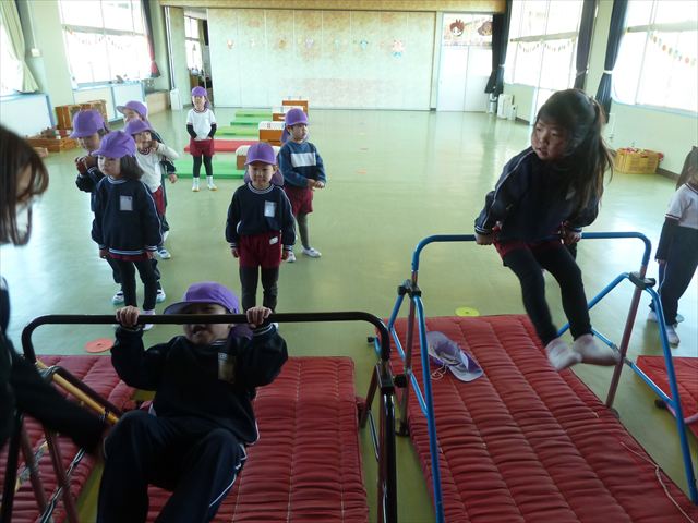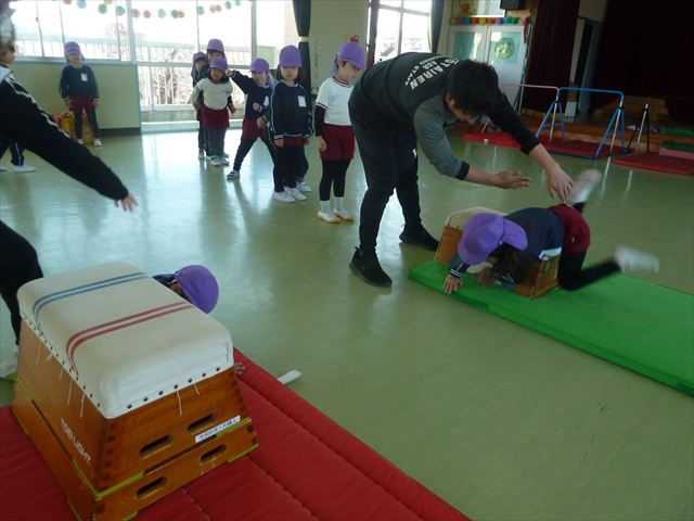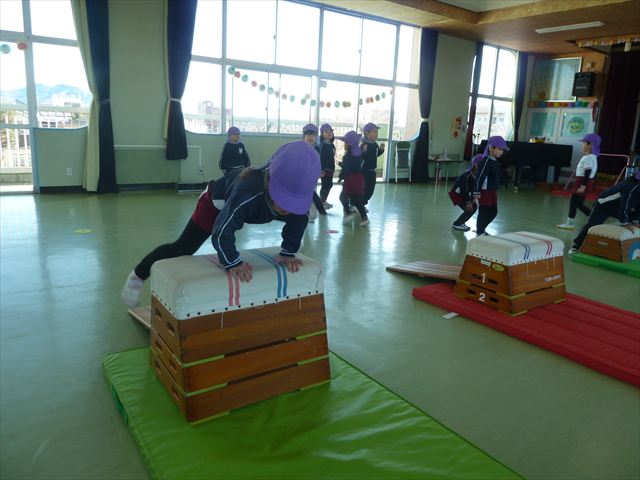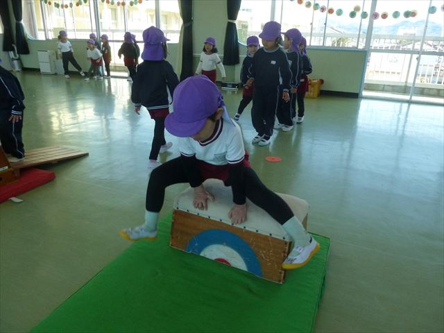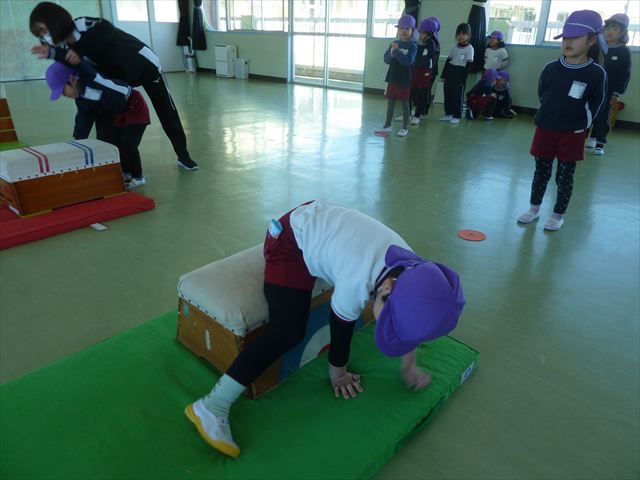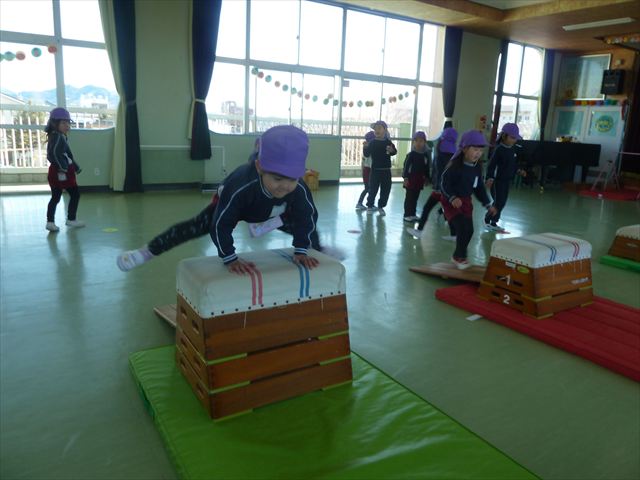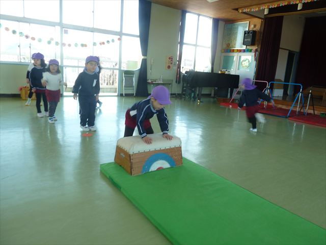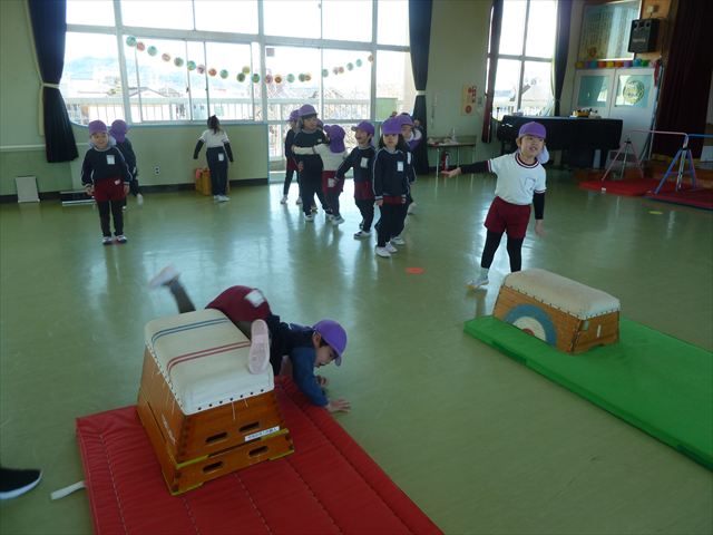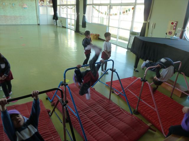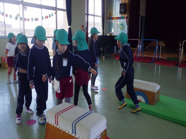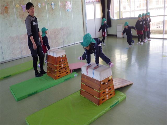 今日は、3学期最初の運動教室でした。準備体操の後,さくら組は側転の練習をしました。つつじ組は跳び箱から取り組みました。両クラスとも側転は難しくみんな苦戦していました。鈴木先生の方から卒園までには出来るようになる様頑張ろうと話をしてもらっていました。鉄棒は自分がまだ出来ない種目を中心に練習していきました。少し間が空いたのでやり方を忘れている子もいましたが、楽しく取り組めていました。今学期も色々な運動に挑戦していきたいと思います。