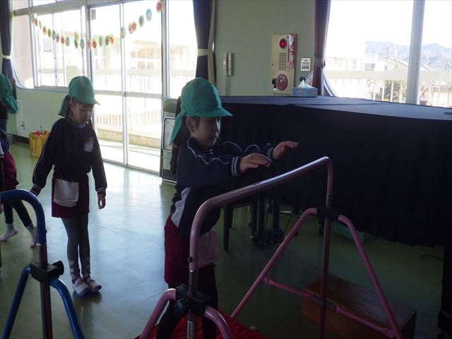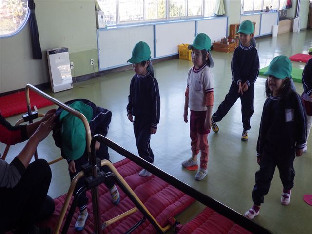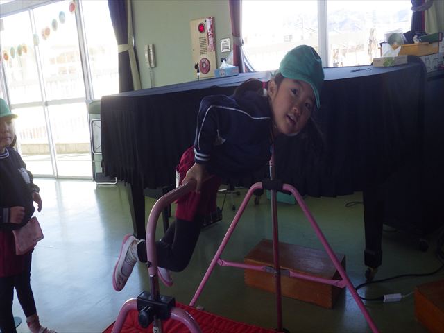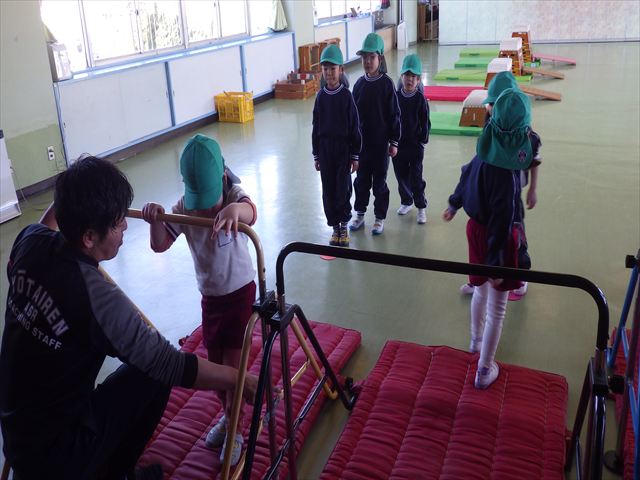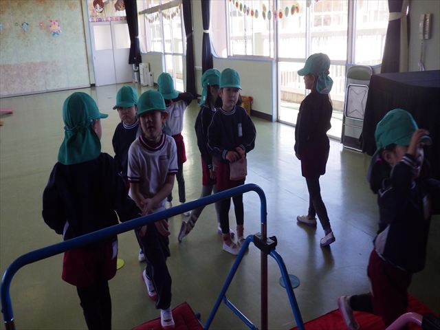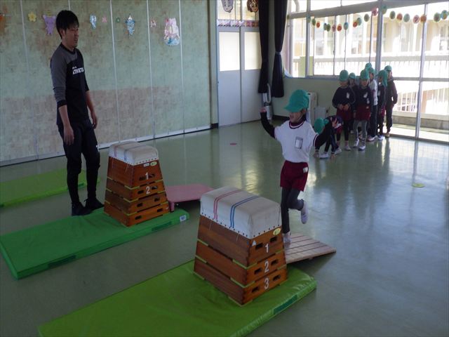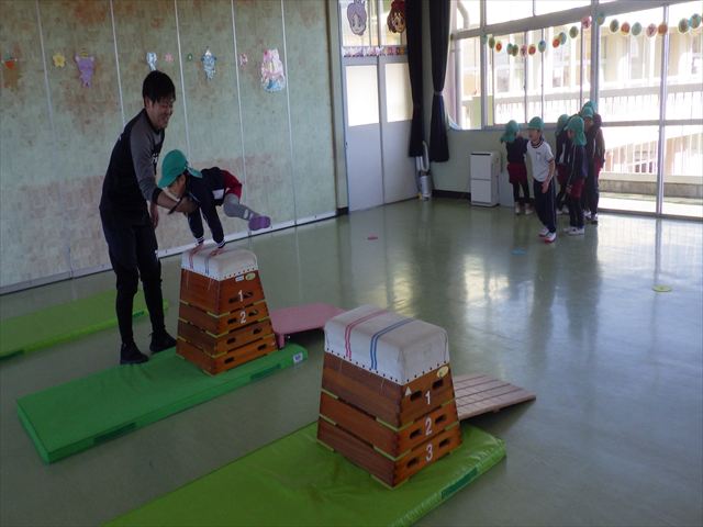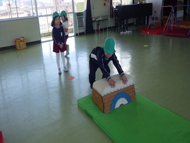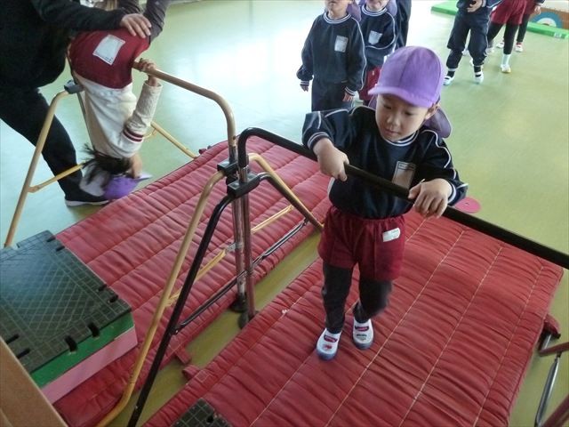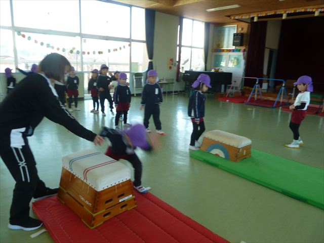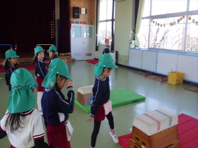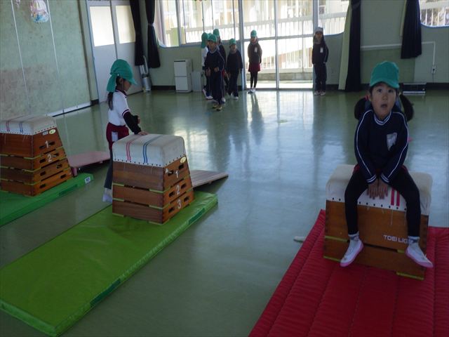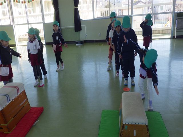今日は、3学期最初の運動教室でした。準備体操の後,さくら組は側転の練習をしました。つつじ組は跳び箱から取り組みました。両クラスとも側転は難しくみんな苦戦していました。鈴木先生の方から卒園までには出来るようになる様頑張ろうと話をしてもらっていました。鉄棒は自分がまだ出来ない種目を中心に練習していきました。少し間が空いたのでやり方を忘れている子もいましたが、楽しく取り組めていました。今学期も色々な運動に挑戦していきたいと思います。