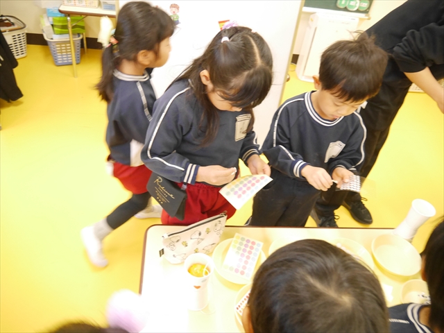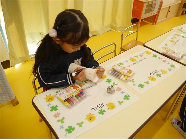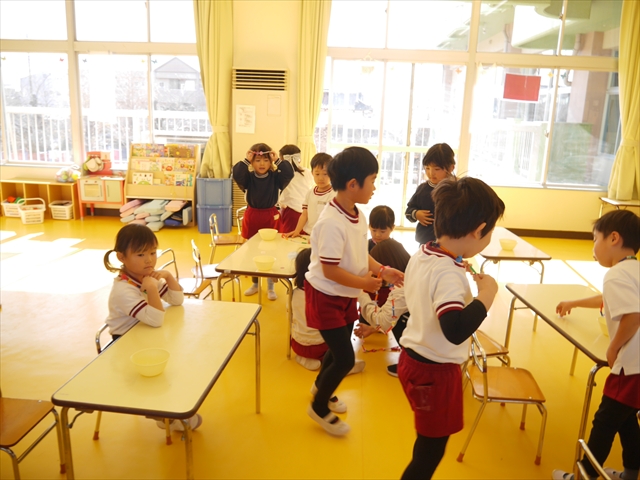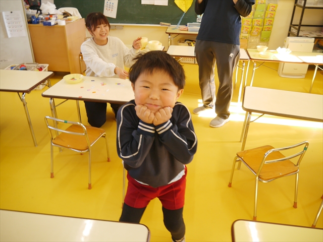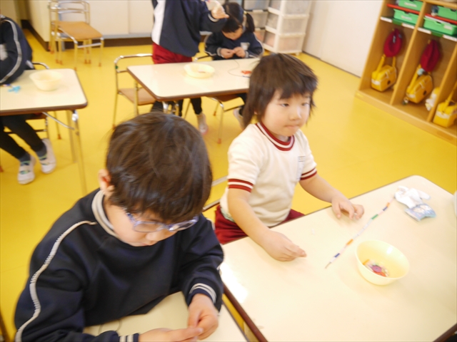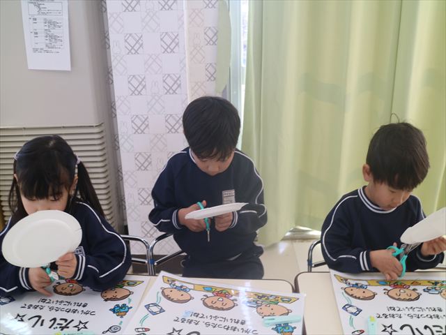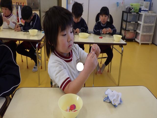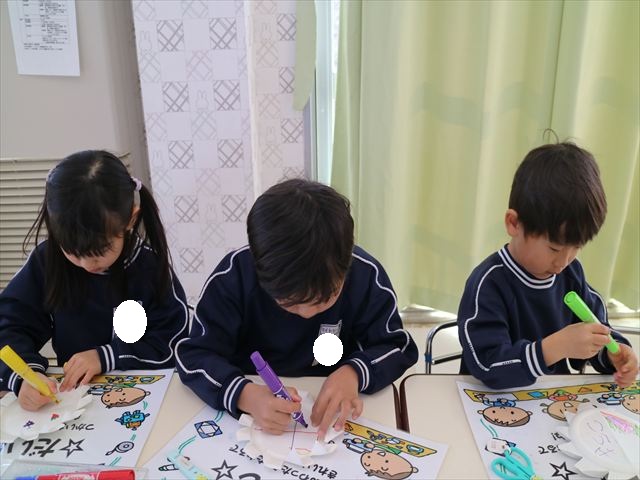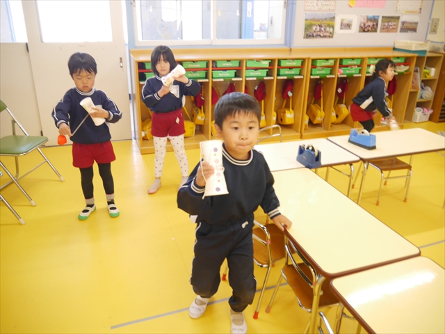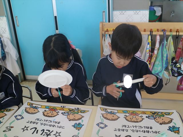 午前中は、廊下壁面製作で「福笑い」をしました!満2歳児さんはゾウさん、満3歳児の男の子はひょっとこ、女の子はおかめを作りました。福笑いは目を瞑ってやることを伝え、先生が実際にやってみるとやっぱりへんてこりんな顔になり、「おもしろーい!」と大爆笑でした!(^^)!満2歳児さんは、ゾウの目・ほっぺ・鼻を付けました。満3歳児さんは、眉毛・目・鼻・ほっぺ・口を付けました。出来上がった顔を「あれ~?」「へんなの~!」と面白そうに見ていました!早速廊下に飾り、他学年のお兄さんお姉さんからも「面白い顔だね!」と大好評でした♪