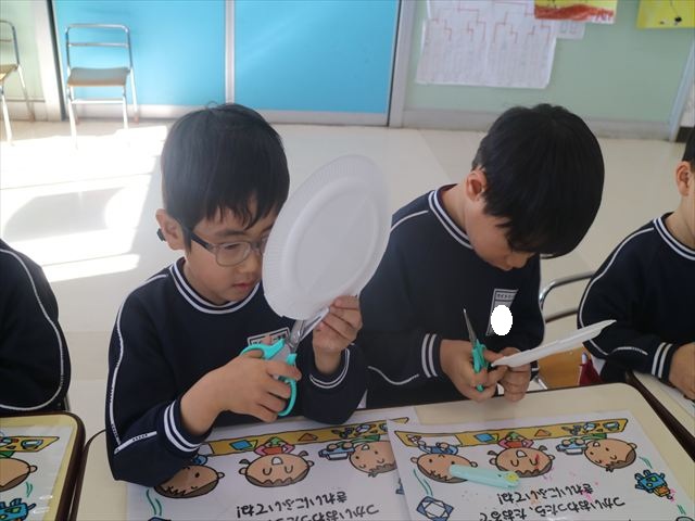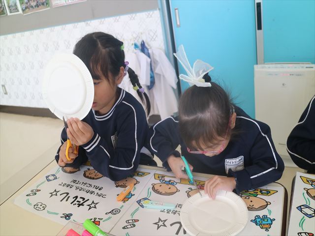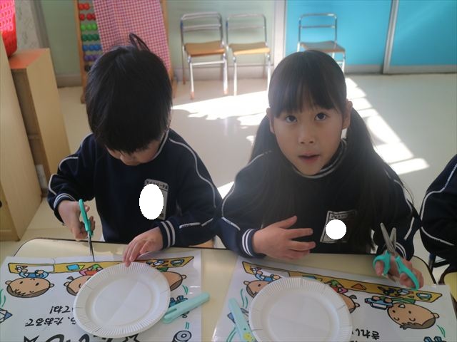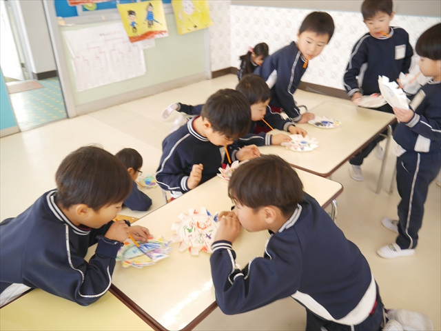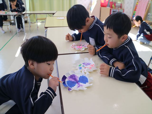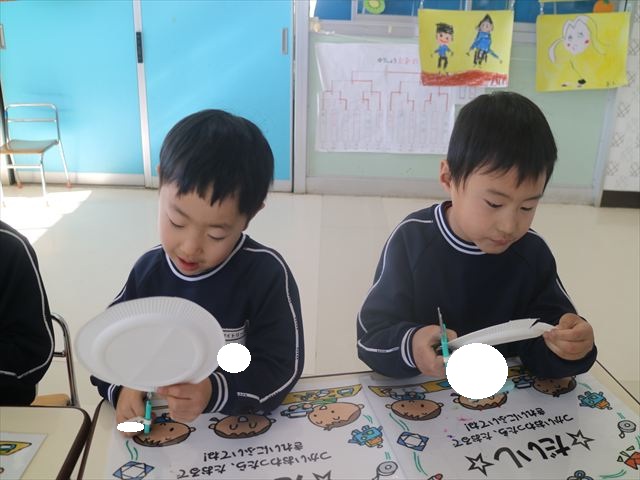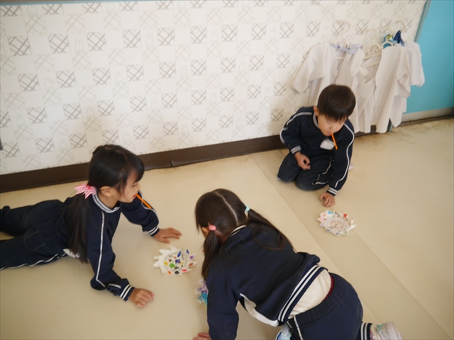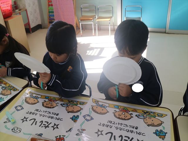 今回の造形活動&自由保育の時間では遊べるお正月のおもちゃを作りました。うみ組は「紙皿コマ」を作りました。紙皿に切ってその部分を三角に折り曲げて、ペンで好きな絵や模様を描いて完成させました!今まで遊んできたコマは手を使っていたけど、これは手を使わずに回すけどどうやって回す?と尋ねると、「フーってする!」「空気!」とみんなすぐに答えが分かったようでした☆ストローを使ってくるくると回るコマを楽しむことができました(^○^)