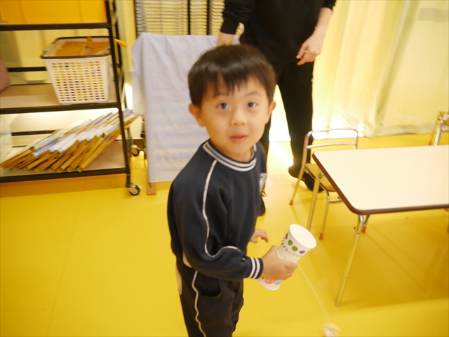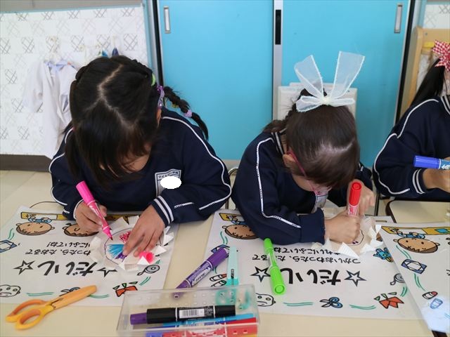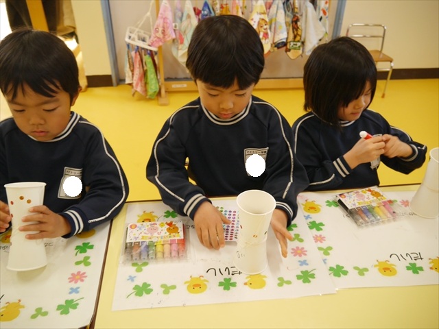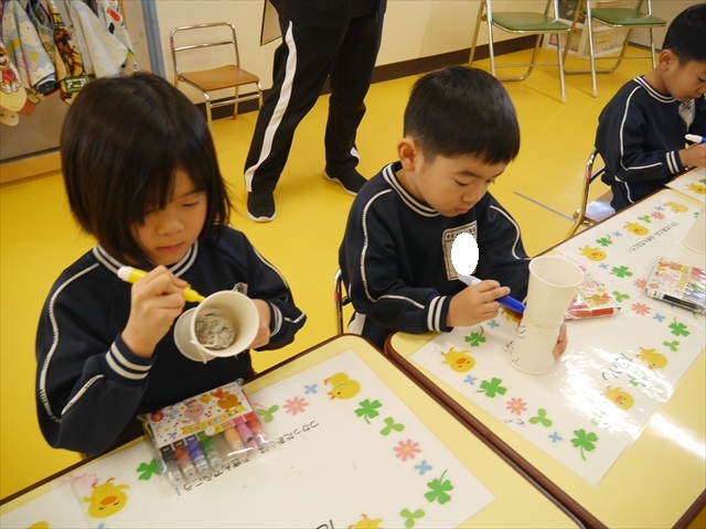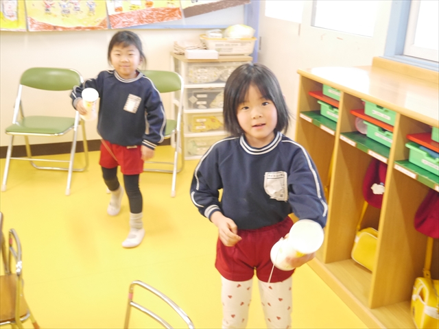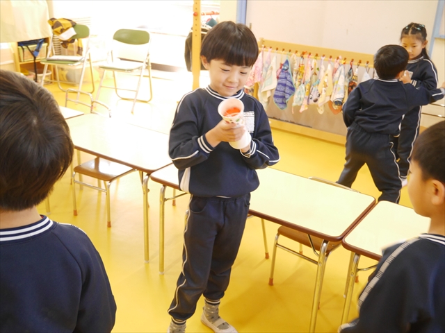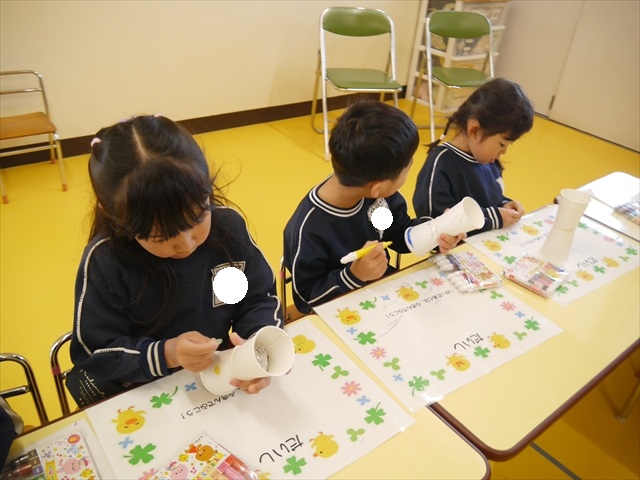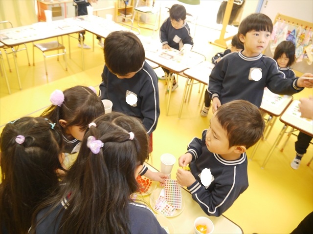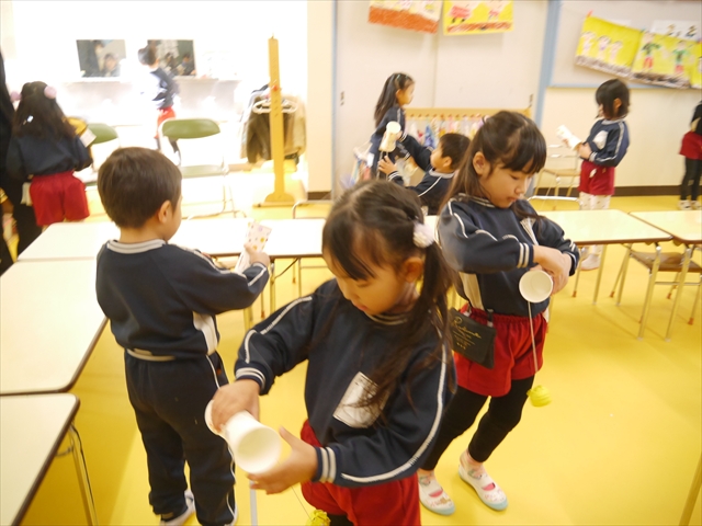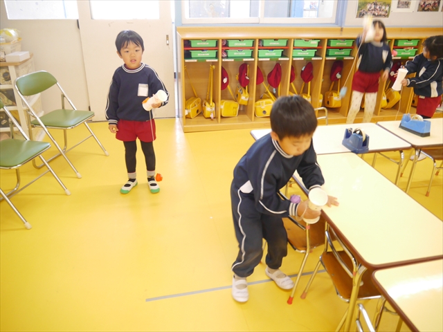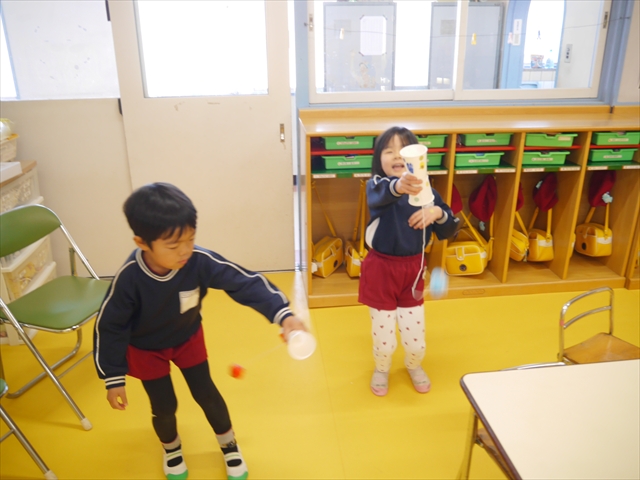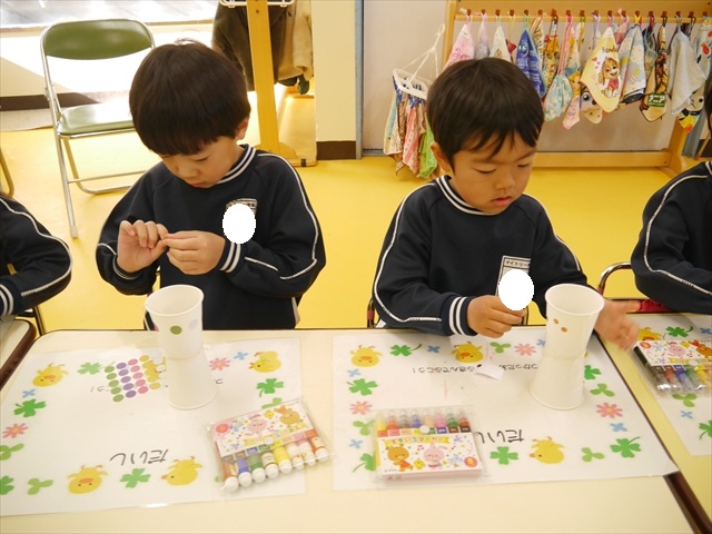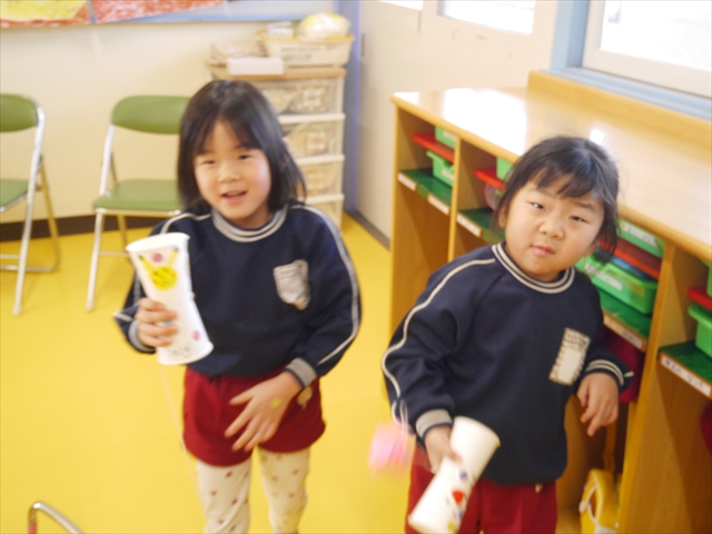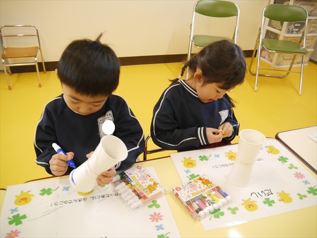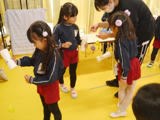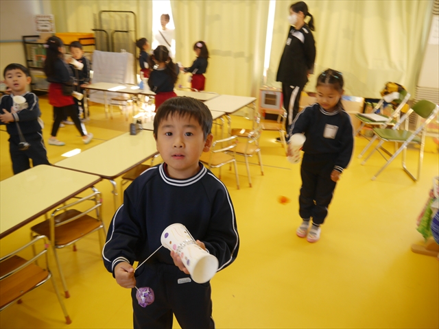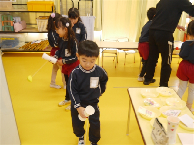 たいよう組は「手作りけん玉」を作りました。2つのつながった紙コップに絵を描いたり、シールを貼ったりしてオリジナルのけん玉を作りました!玉も好きな色の折り紙を新聞紙の上から丸めて作ったのでカラフルな可愛らしいけん玉が完成しました☆「入った!」「惜しい!」とお友だちと言い合いながら楽しめました!本日持ち帰りましたのでお家でもぜひ遊んでみて下さい!
