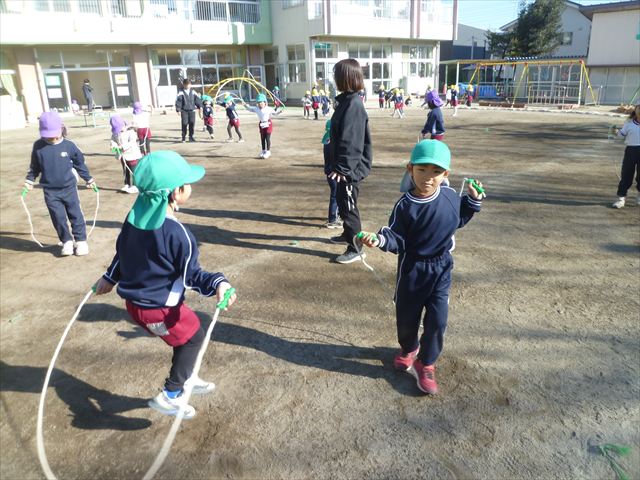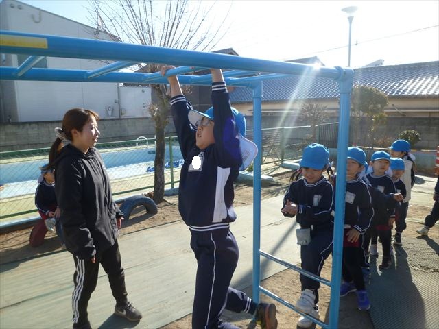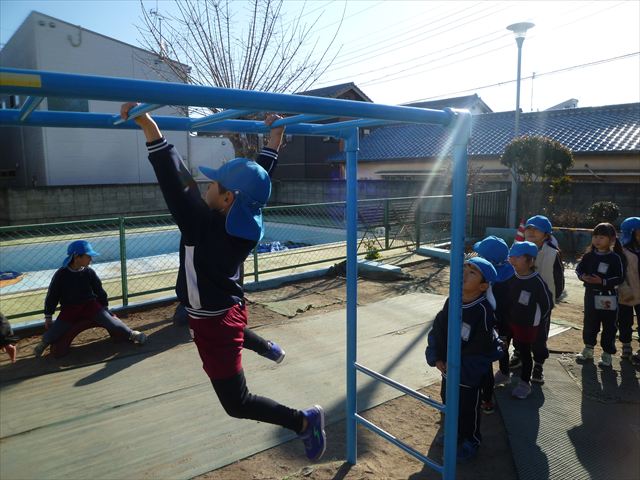 今日も朝から元気に体操とサーキットトレーニング2を行いました!ドラえもんのラジオ体操も前に立っている体操リーダーの子を見ながら頑張りました!サーキット2では、年長組は鉄棒・雲梯、年中組と年少組はなわとび、たんぽぽ組はなわとび遊びをしました!
