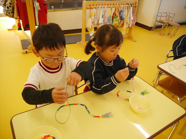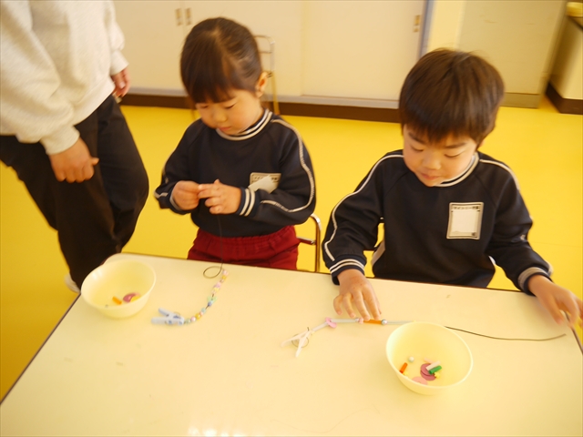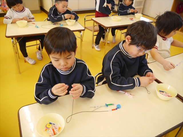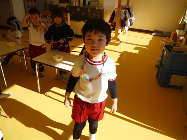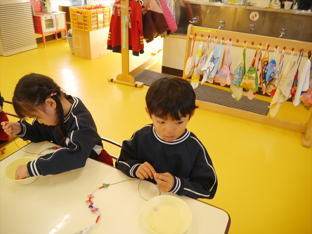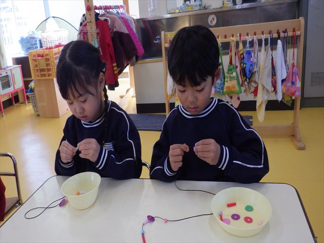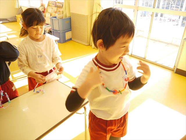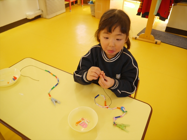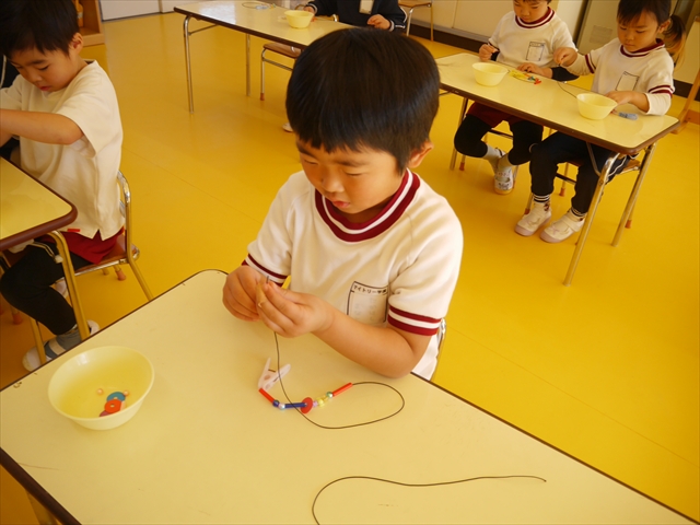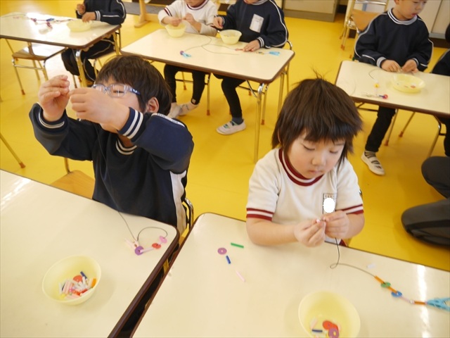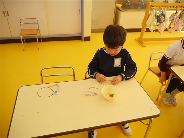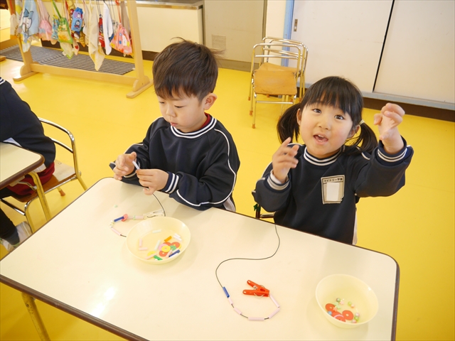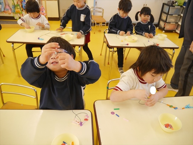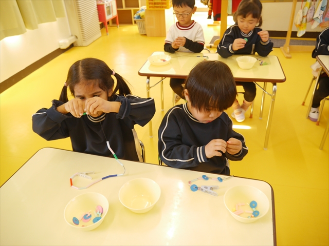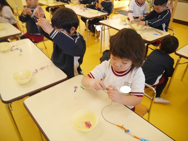 今日の年中組の「主体性の時間」の活動は「アクセサリー作り」を行いました。先生が先に作ったアクセサリー(ネックレス)を見て、自分たちも作りたい!と気持ちが高まった子どもたち。自由に材料を選びゴム紐に通してオリジナルアクセサリーを作りました。みんなとっても楽しそうに作る姿が印象的でした。完成すると友だちと見せ合っていました!ママにあげようかなー、パパにあげようかなーと嬉しそうに持ち帰りました。