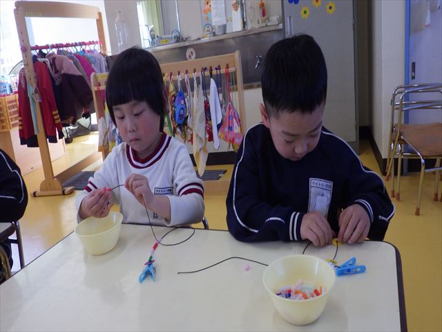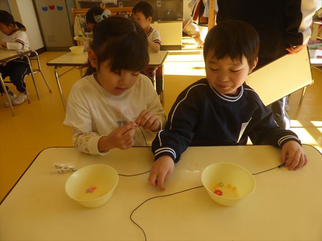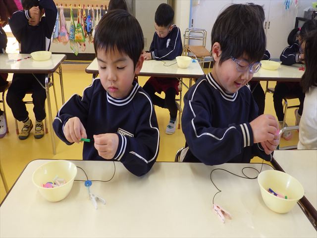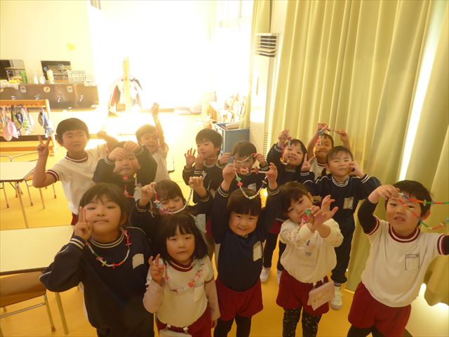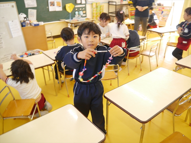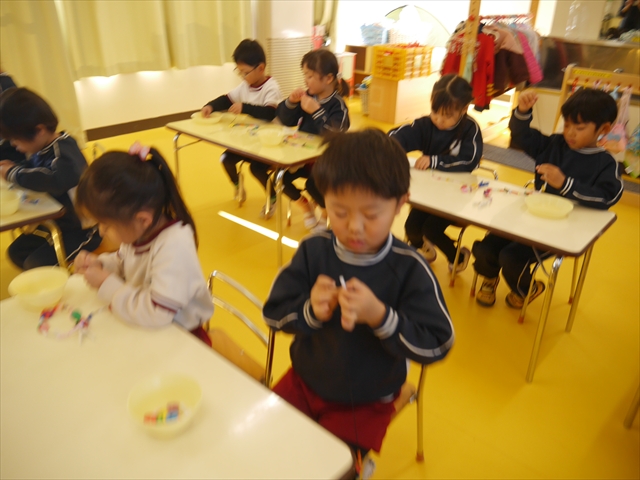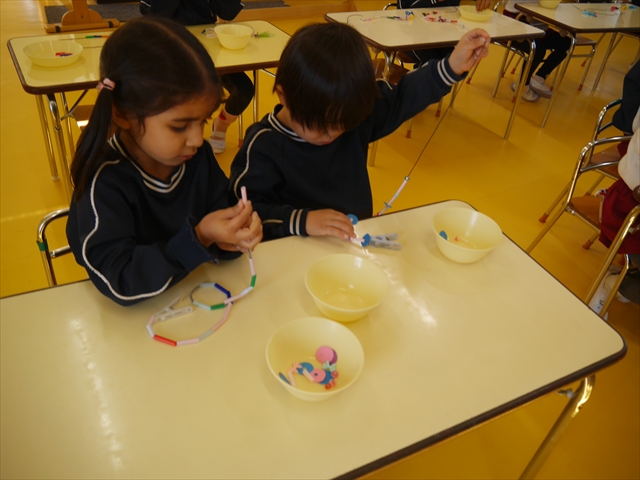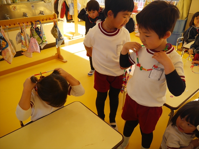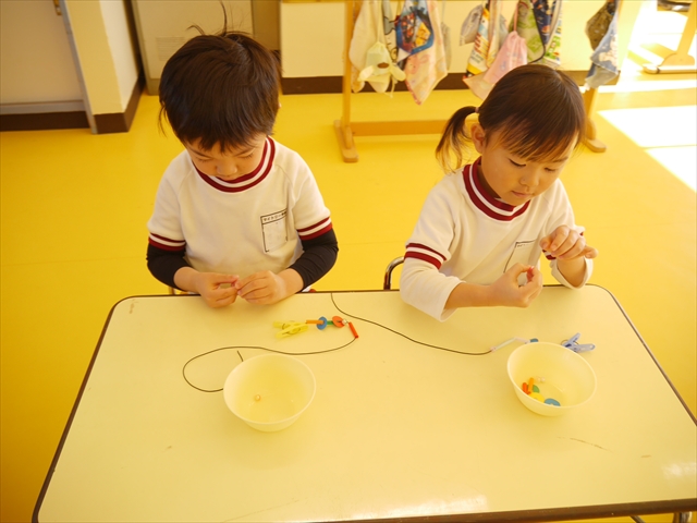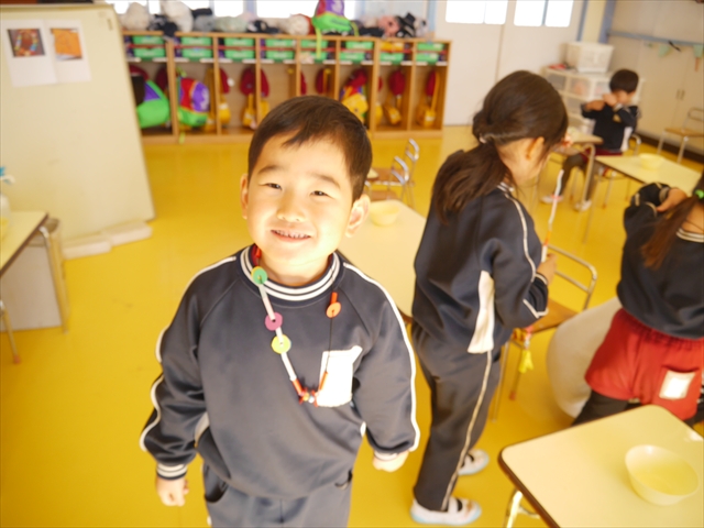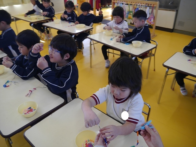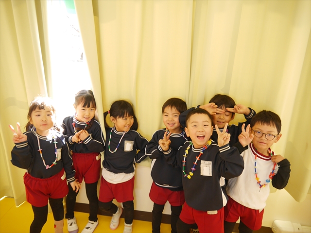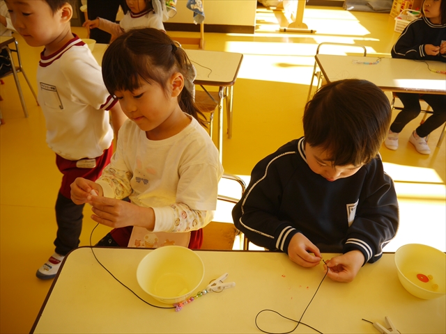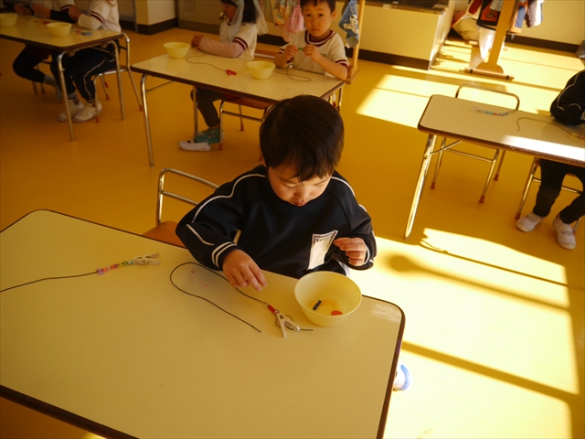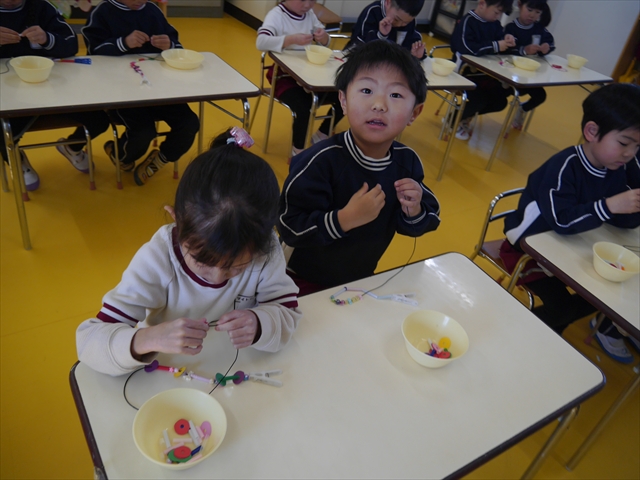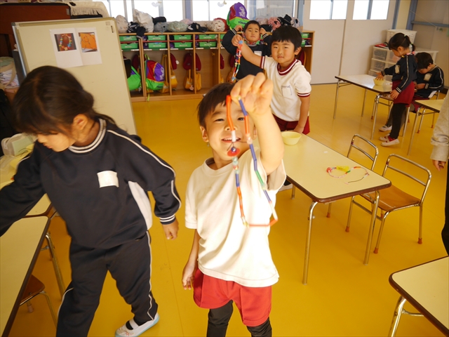今日の年中組の「主体性の時間」の活動は「アクセサリー作り」を行いました。先生が先に作ったアクセサリー(ネックレス)を見て、自分たちも作りたい!と気持ちが高まった子どもたち。自由に材料を選びゴム紐に通してオリジナルアクセサリーを作りました。みんなとっても楽しそうに作る姿が印象的でした。完成すると友だちと見せ合っていました!ママにあげようかなー、パパにあげようかなーと嬉しそうに持ち帰りました。