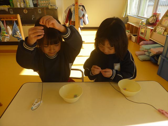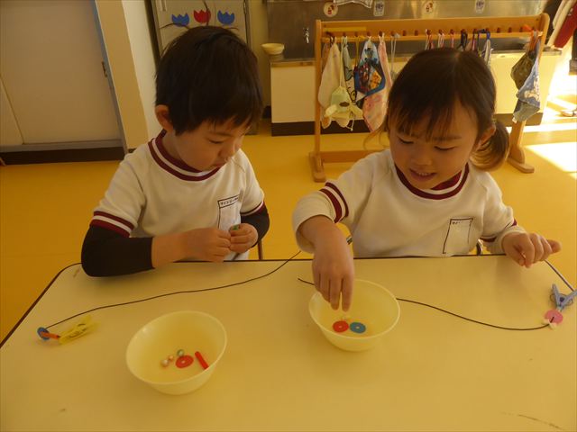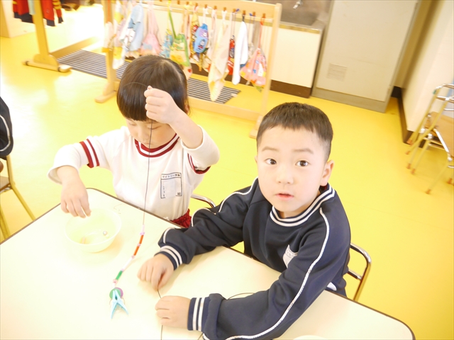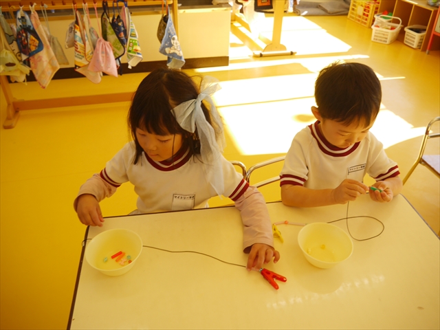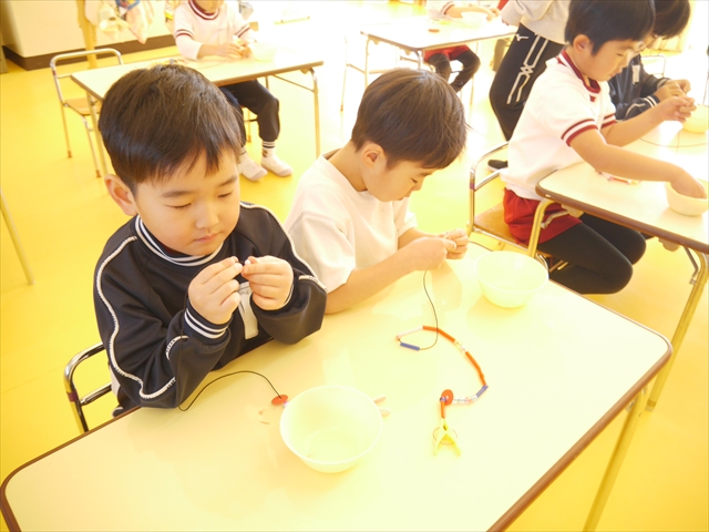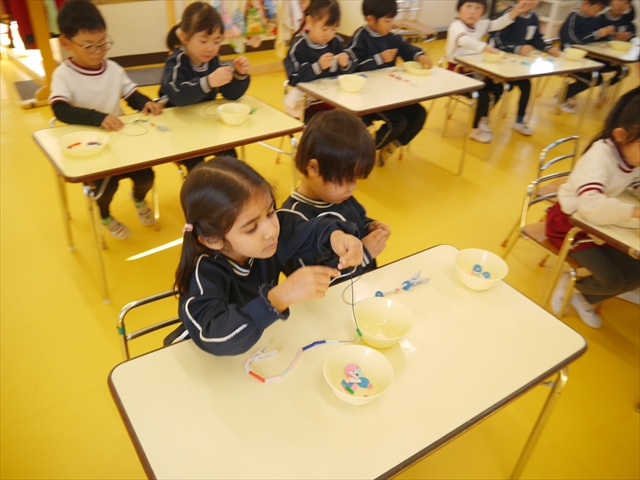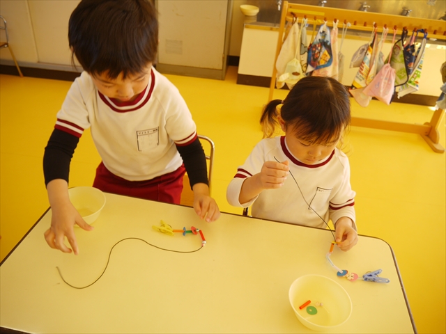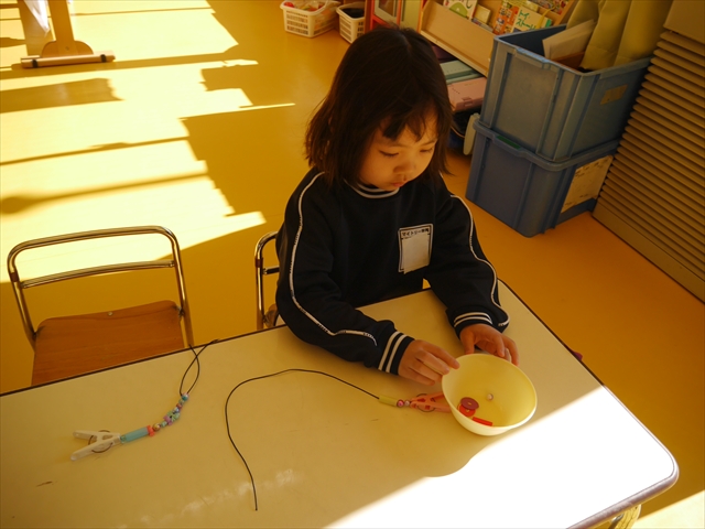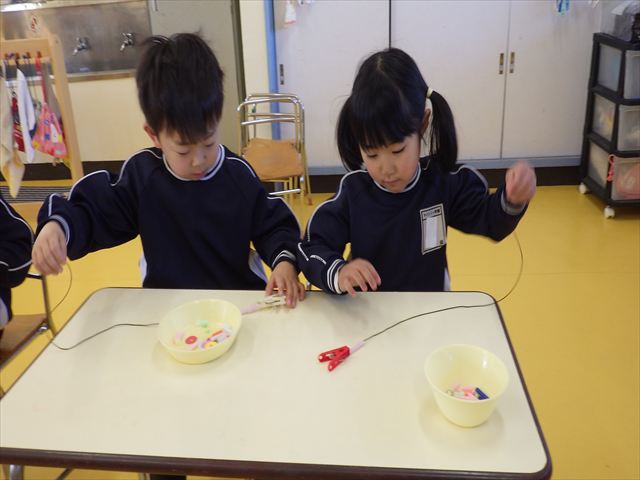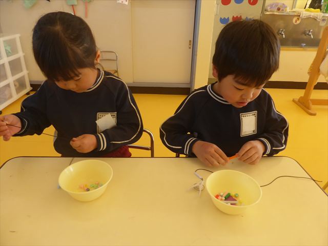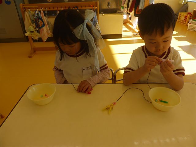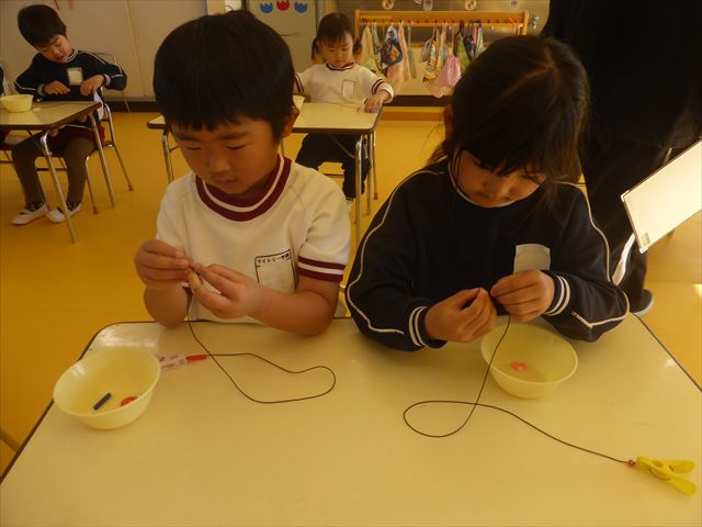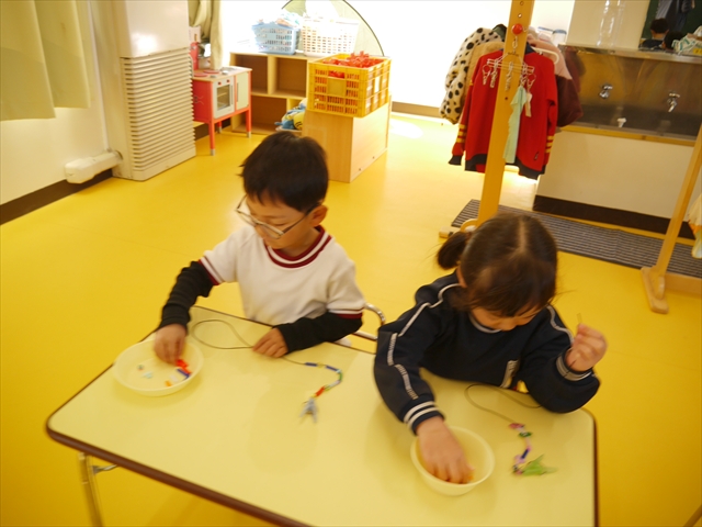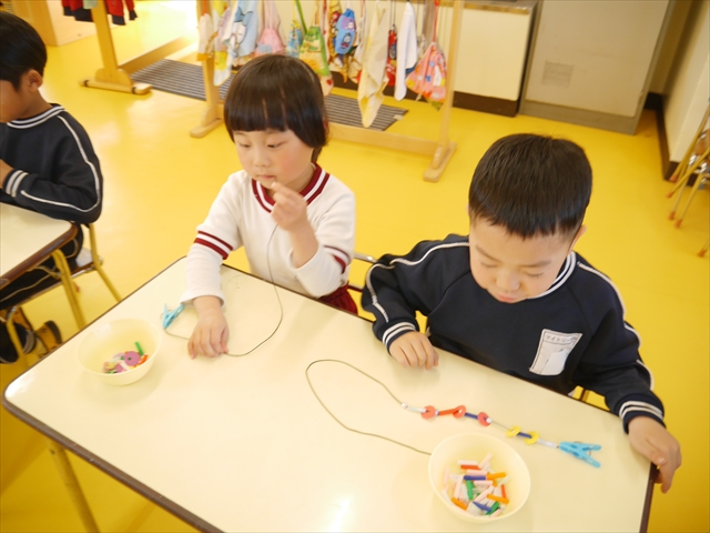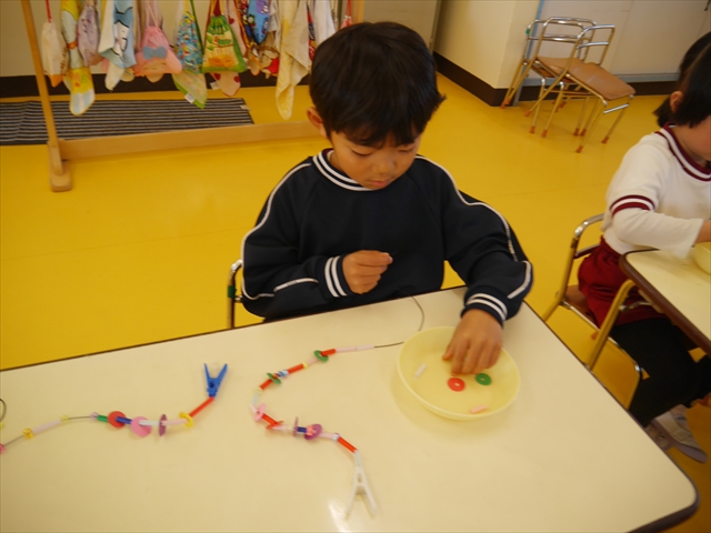 今日の年中組の「主体性の時間」の活動は「アクセサリー作り」を行いました。先生が先に作ったアクセサリー(ネックレス)を見て、自分たちも作りたい!と気持ちが高まった子どもたち。自由に材料を選びゴム紐に通してオリジナルアクセサリーを作りました。みんなとっても楽しそうに作る姿が印象的でした。完成すると友だちと見せ合っていました!ママにあげようかなー、パパにあげようかなーと嬉しそうに持ち帰りました。