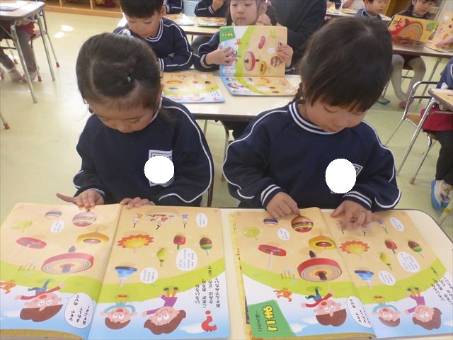 【満2歳児】午後は、こま遊びをしました。満2歳児さんたちも、先生が回すこまに目が釘付けでキラキラした目でこまを見つめていました。そしてみんなでこま回しにチャレンジ!手のひら同士をこすり合わせるのは上手にできましたが、いざこまを持つと思わず手を離してしまい…(笑)こまを回すのはまだ少し難しかったようでした(^^;来年に期待ですね☆彡
