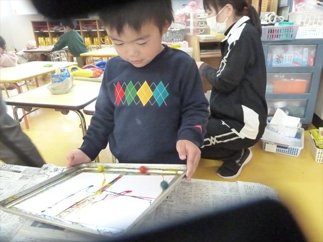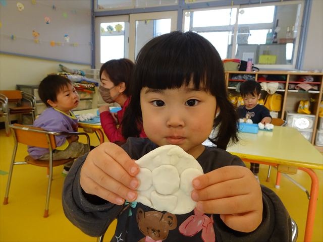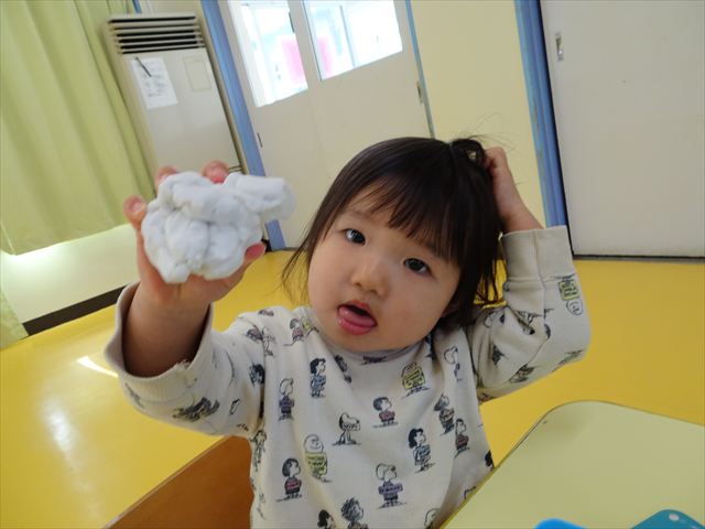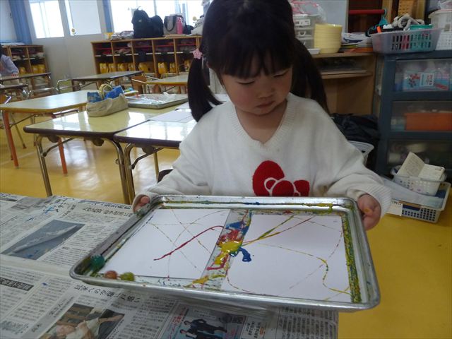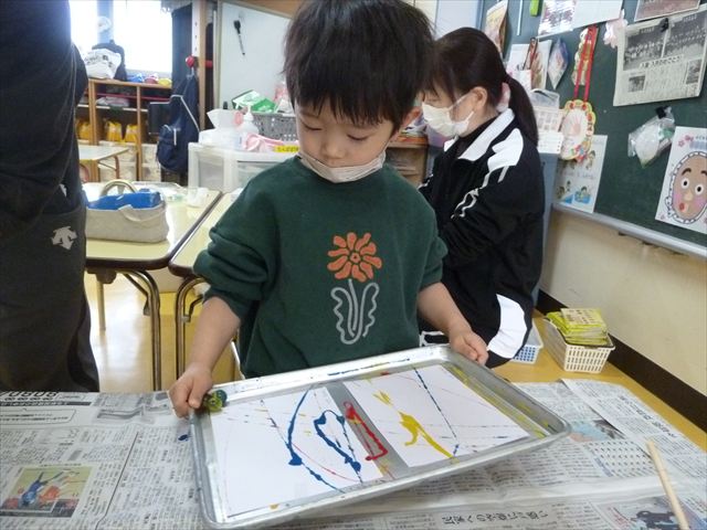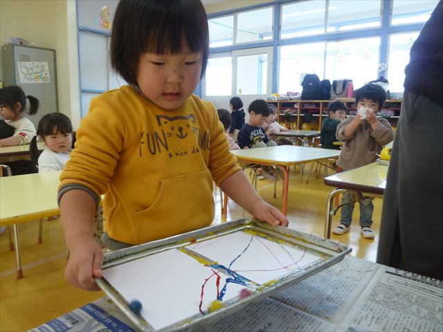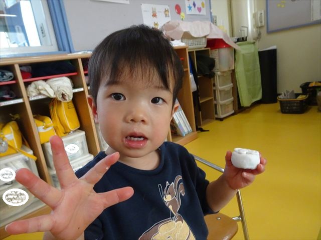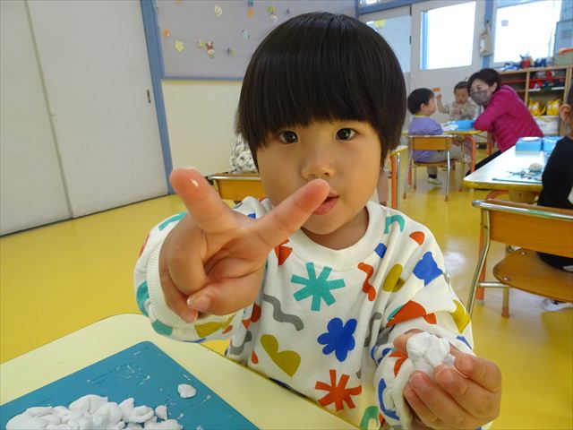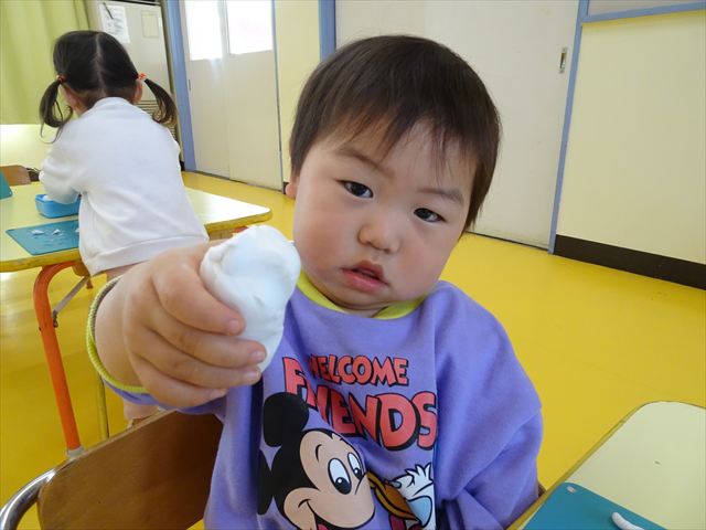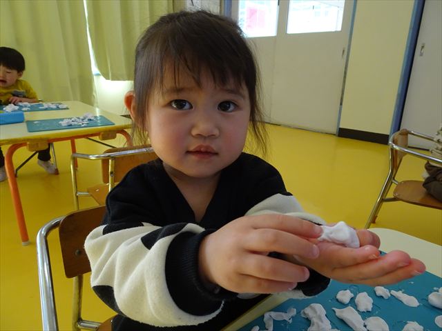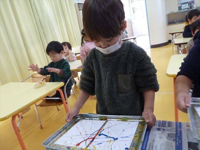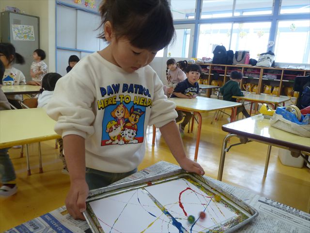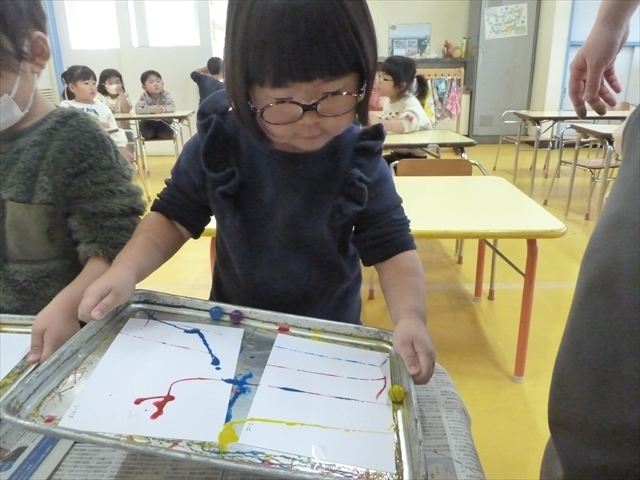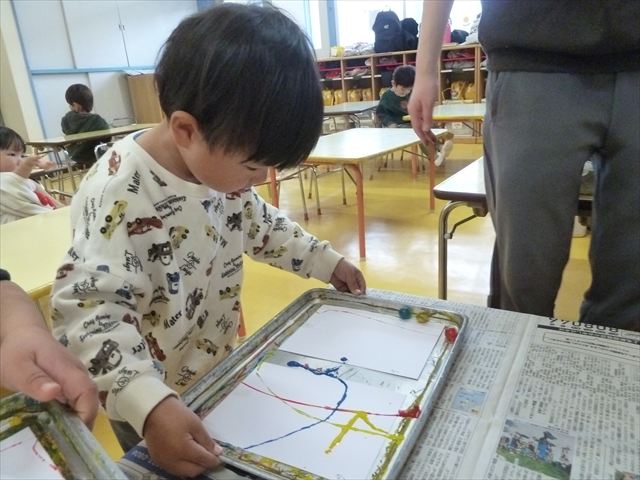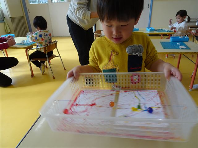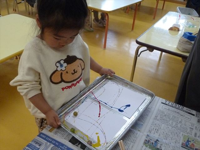 今日は、造形活動の時間で絵の具遊びをしました!ビー玉を赤・青・黄色の3色の絵の具に付けて、白画用紙の上でコロコロ転がして遊びました。転がしていくと絵の具の道ができて、集中して転がしていました!(^^)!また、3色が混ざると違う色になることにも気づく子もいて、「いろがちがうね~!」と面白そうに教えてくれました。順番待ちの間は、満3歳児さんは手を洗ったあとに”座って待つ”の練習をして、満2歳児さんは粘土遊びをして楽しみました♪