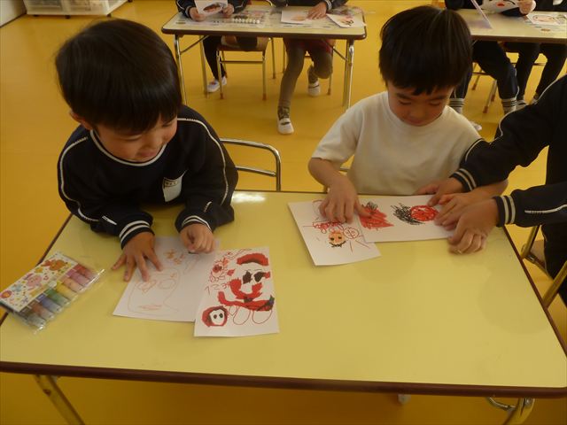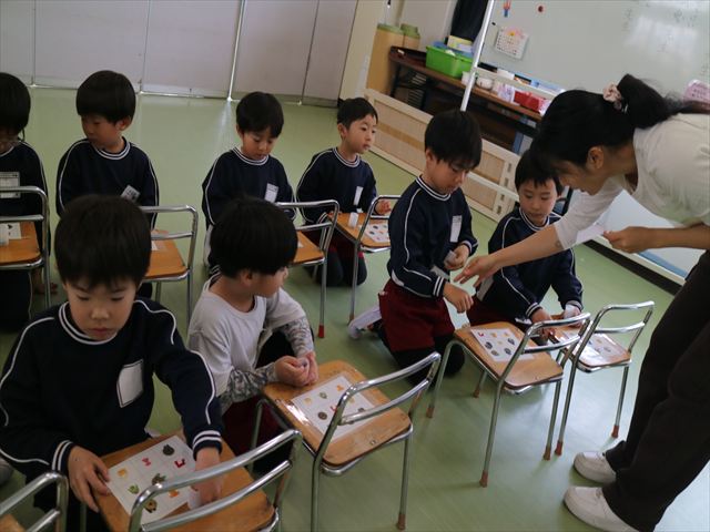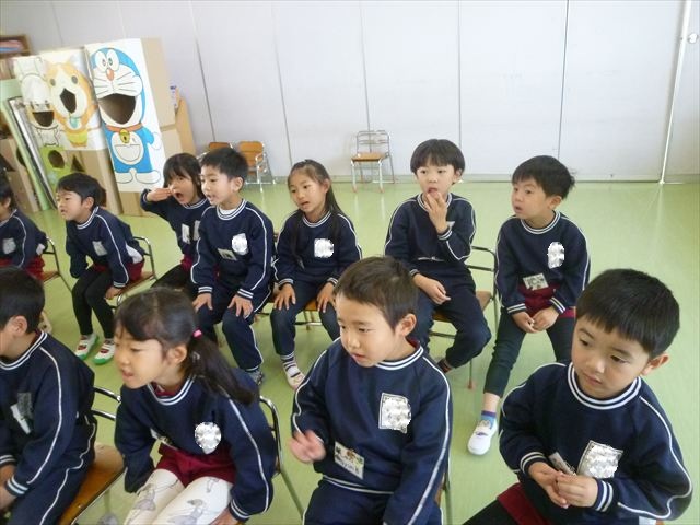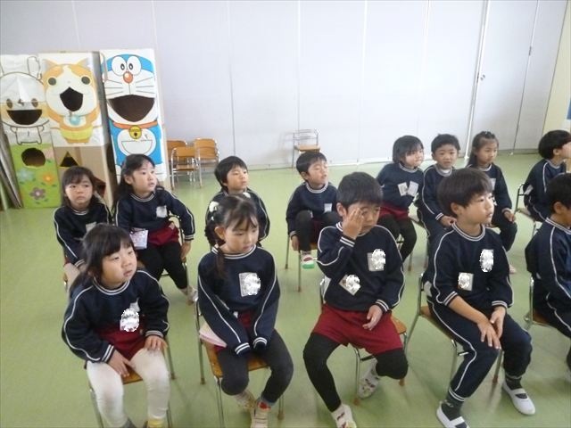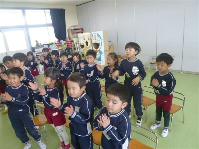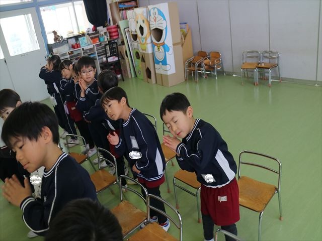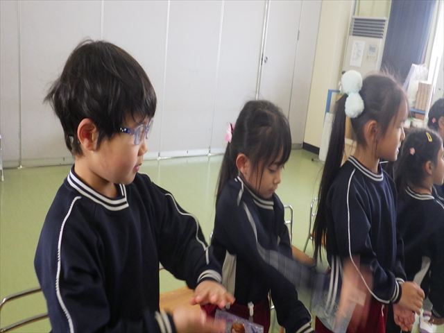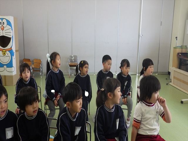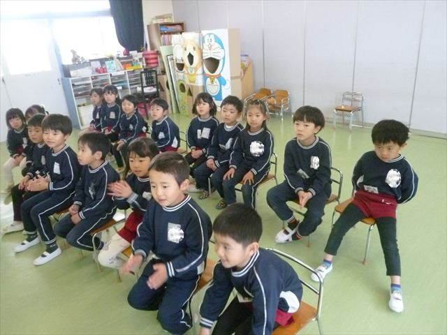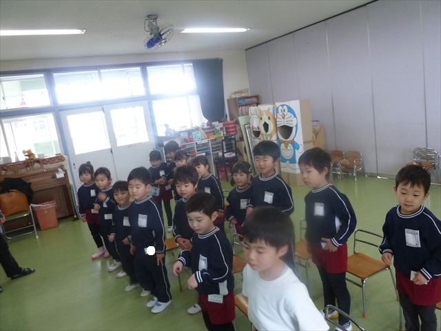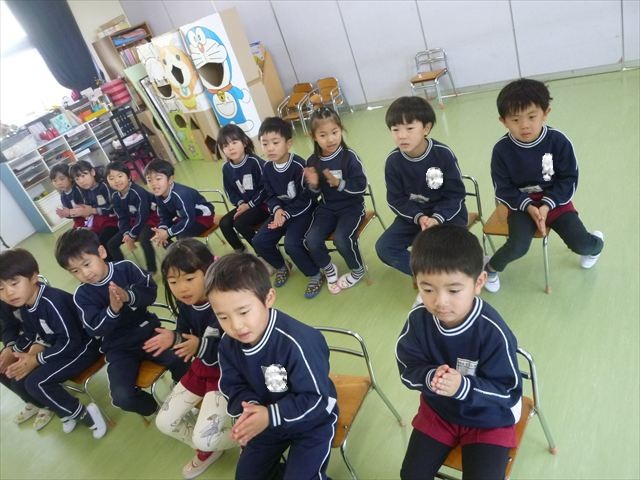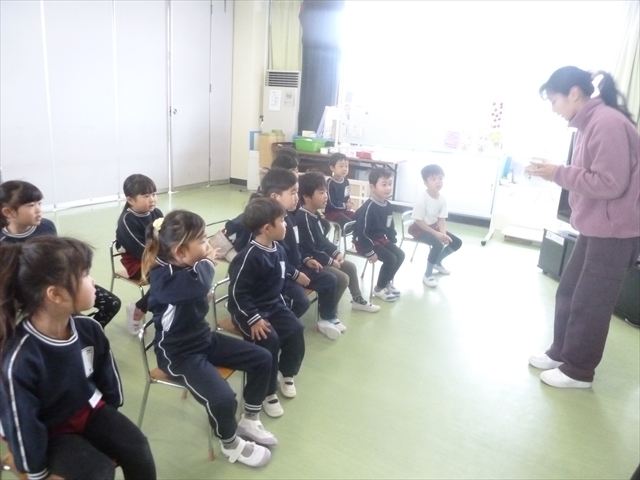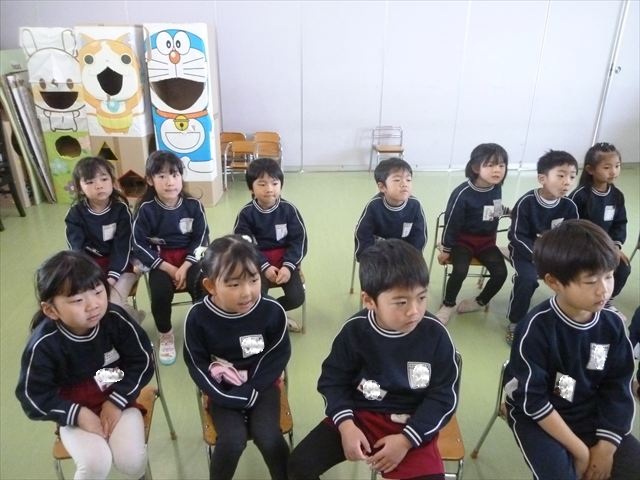今日は朝礼を行いました。園長先生から、「今週からぐっと寒くなるから、マラソンやサーキットや遊ぶときは身体をいっぱい動かして、からだを暖めてください。これからもっと寒くなって、雪が降って来たら、みんなで雪合戦や雪遊びをするから楽しみにしていてください!」と話がありました。