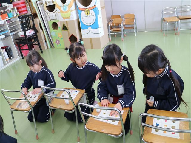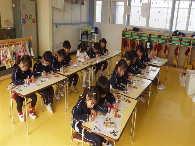 今年度から新たに取り入れた本園の特色の一つで、月に1回程度「自由保育の時間」のカリキュラムを組み込みました。これは、園児主体ではなく、教師主体を重視したカリキュラムです。この時間は、先生たち教師主体・教師の主張の保育・授業であり、担任(各クラスごと)が、園児の成長・教育のために、先生方が指導・保育したい内容・方法・日程・時間等を自由に設定して実施するものです。今までのカリキュラムを無視しても、幼稚園教育要領を逸脱しても、レベルが高すぎても低すぎても問題なく、とにかく先生たちが子どもたちに教えたい、学ばせたい、遊ばせたい、やらせたいものを好きにやる時間です。 今月はビニール袋を使って「フライングアニマル」を作って遊びました(^^)まず、「うさぎ」「ねこ」「くま」の耳を選んで画用紙を切って耳を作りました。その耳を輪っかを付けたビニール袋に 付けて、マジックで動物の顔を描いて完成!!床に置いた得点やマーク目掛けて投げて飛ばして楽しみました(^^)