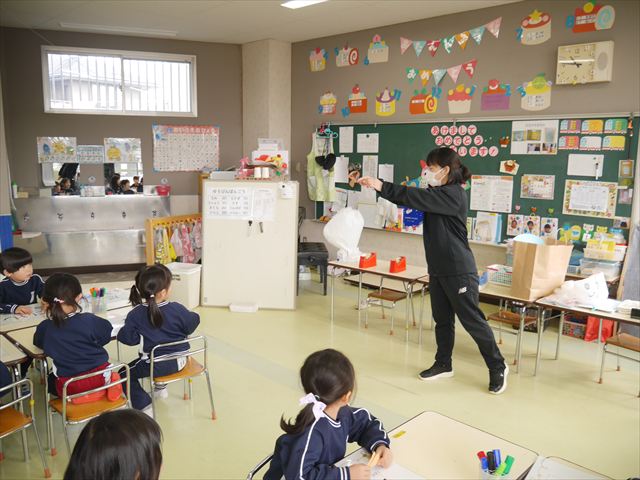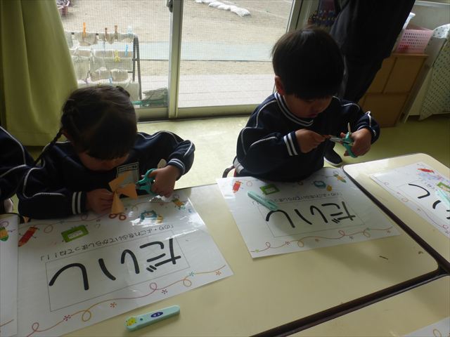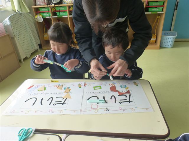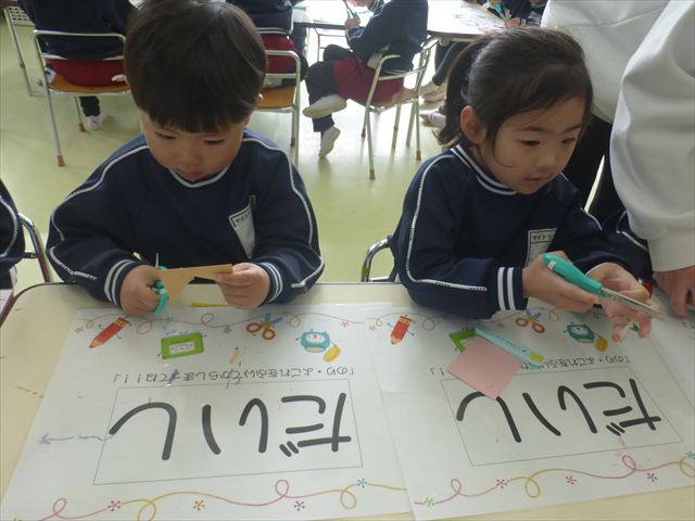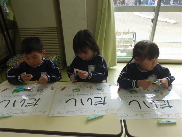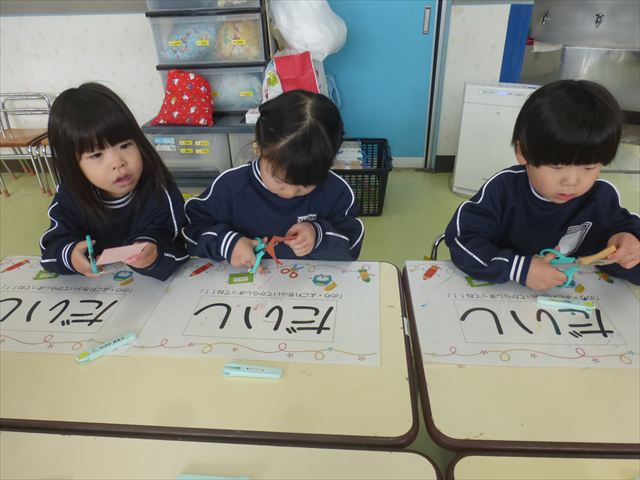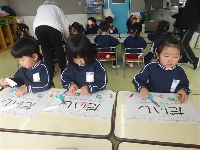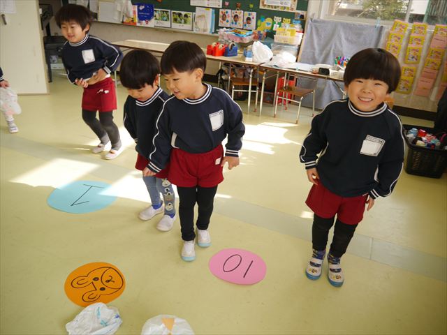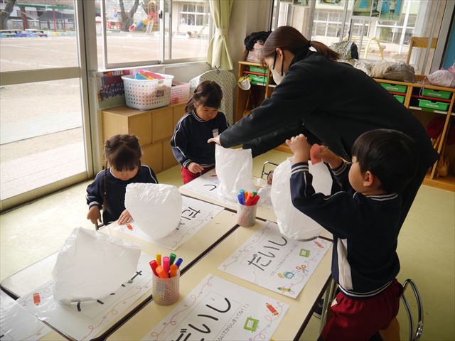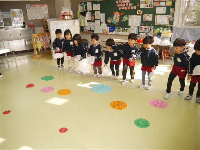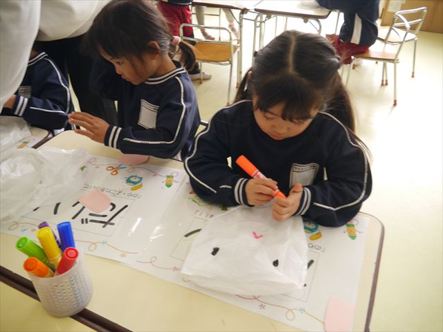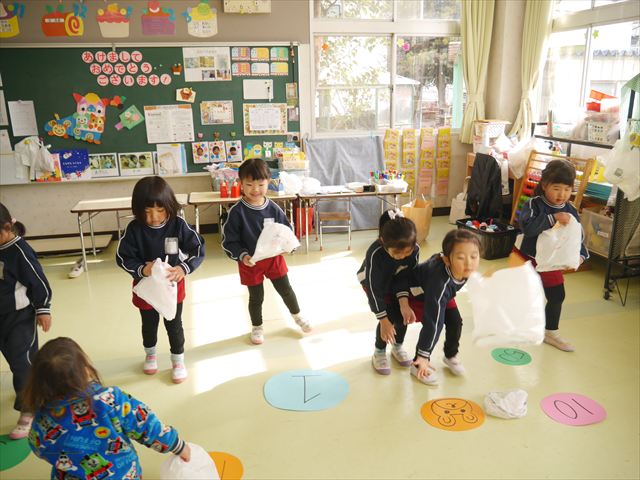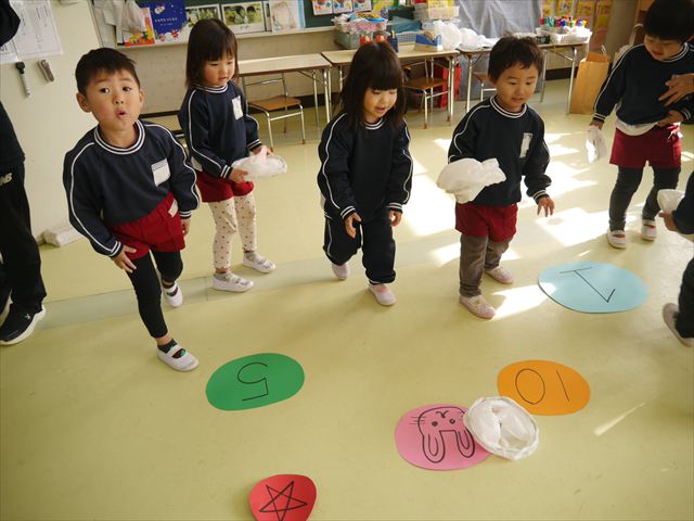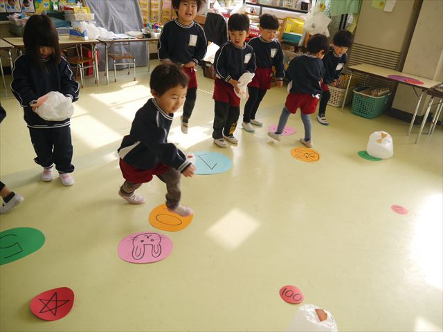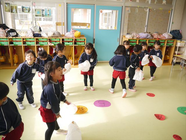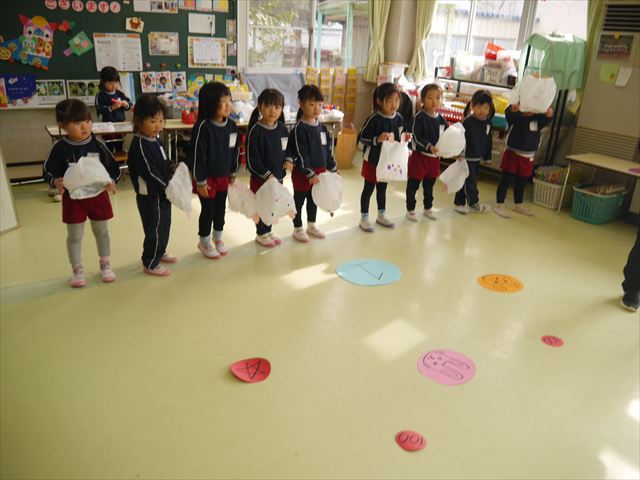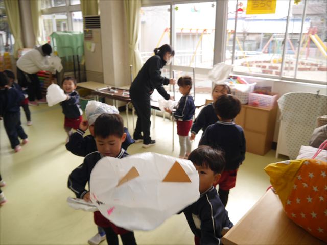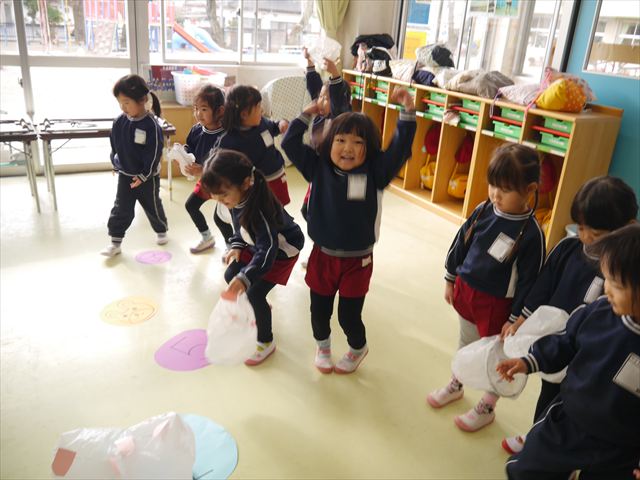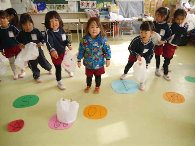 今年度から新たに取り入れた本園の特色の一つで、月に1回程度「自由保育の時間」のカリキュラムを組み込みました。これは、園児主体ではなく、教師主体を重視したカリキュラムです。この時間は、先生たち教師主体・教師の主張の保育・授業であり、担任(各クラスごと)が、園児の成長・教育のために、先生方が指導・保育したい内容・方法・日程・時間等を自由に設定して実施するものです。今までのカリキュラムを無視しても、幼稚園教育要領を逸脱しても、レベルが高すぎても低すぎても問題なく、とにかく先生たちが子どもたちに教えたい、学ばせたい、遊ばせたい、やらせたいものを好きにやる時間です。 今月はビニール袋を使って「フライングアニマル」を作って遊びました(^^)まず、「うさぎ」「ねこ」「くま」の耳を選んで画用紙を切って耳を作りました。その耳を輪っかを付けたビニール袋に 付けて、マジックで動物の顔を描いて完成!!床に置いた得点やマーク目掛けて投げて飛ばして楽しみました(^^)