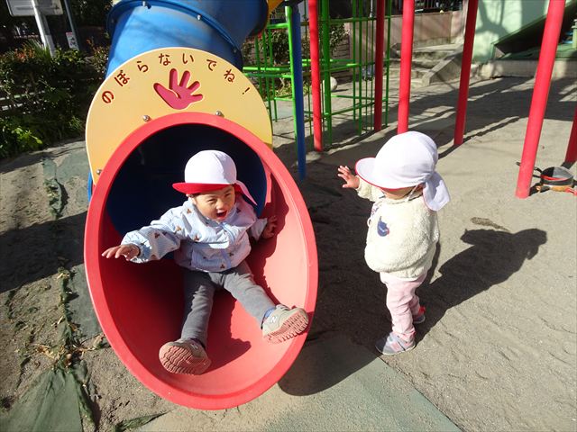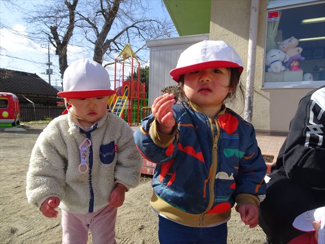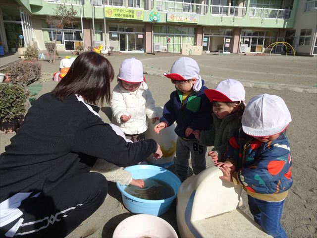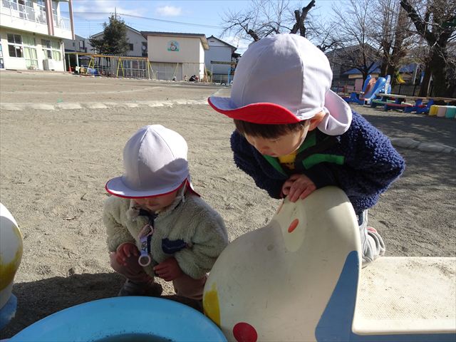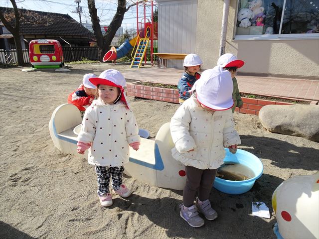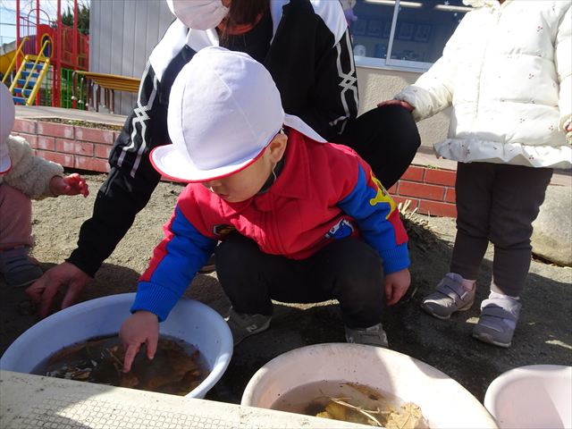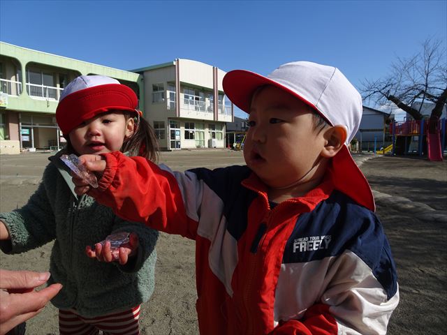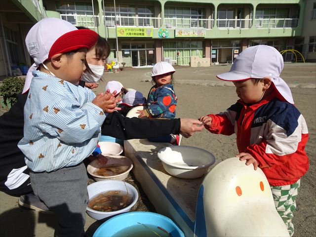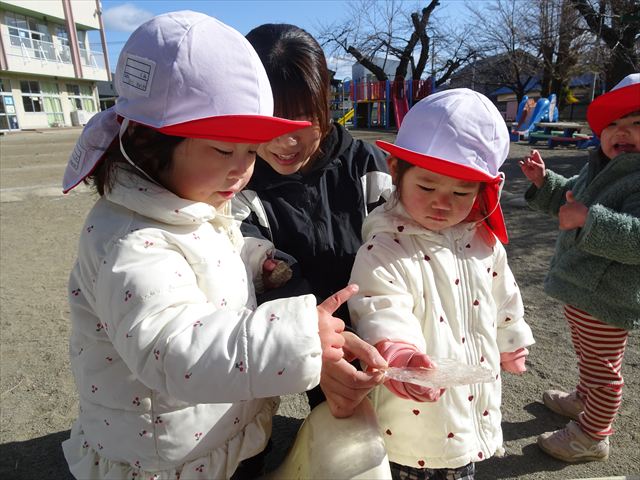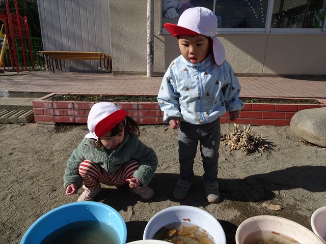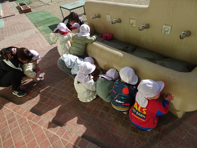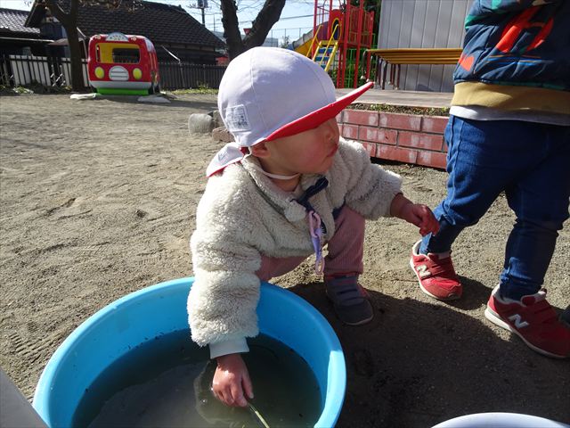 満2歳児さんは、戸外遊びをしました。園庭でいっぱい遊んでいると…あれれ?なんだか冷たいものがあるぞ…?タライの中に氷を発見して、みんなで触っていました!冷たい感触がクセになりそう~!また触れるといいね☆