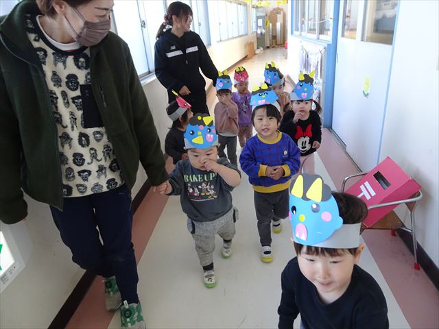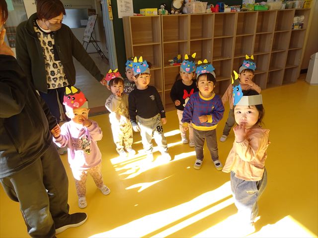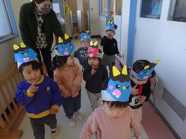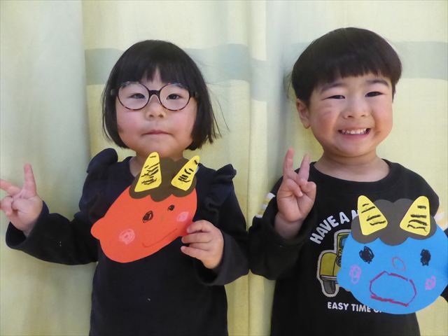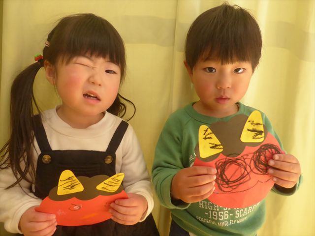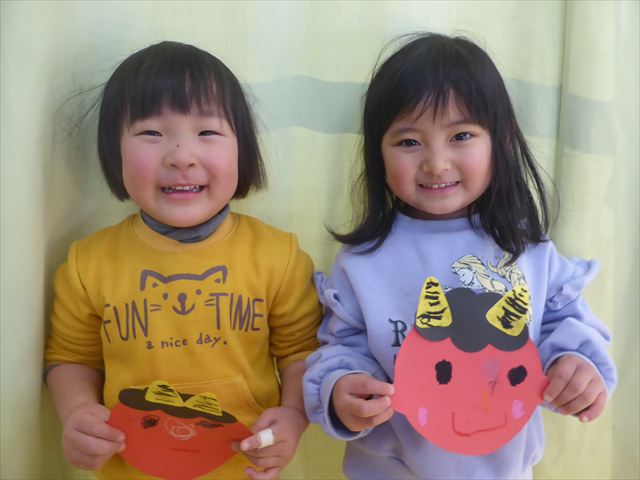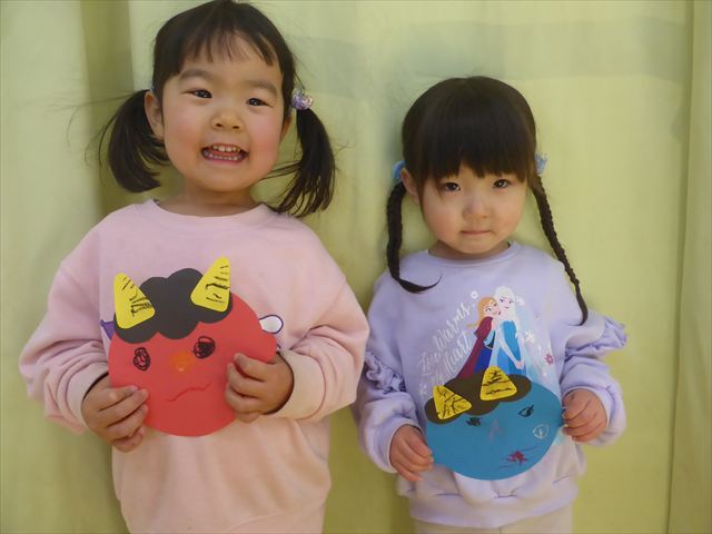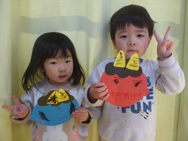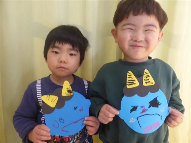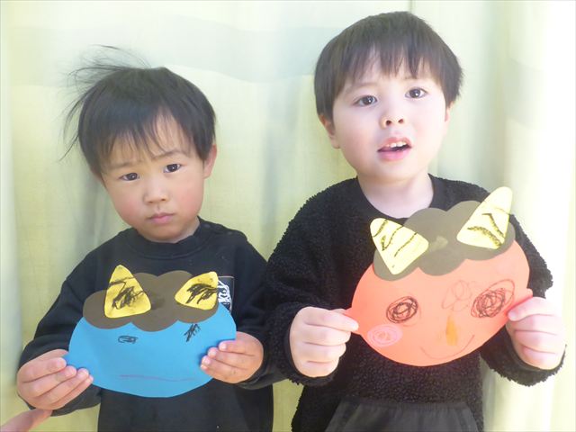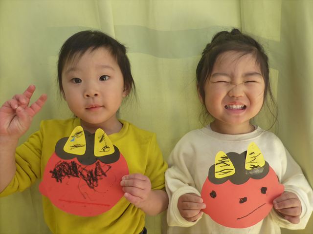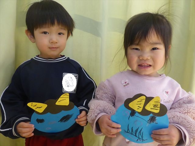 金曜日は、ホームページがアップできず申し訳ありませんでした。金曜日のたんぽぽさんは、鬼のお面作りをしました!満2歳児さんは、顔をシールで貼り、角を両面テープで貼りました。同じシールでも表情豊かな鬼ができて、とても可愛かったです♡その後はお面を被って、幼稚園を散策♪満3歳児さんのお部屋の前を通ると…「おにがきた~!?」と大騒ぎ!びっくり作戦大成功☆
