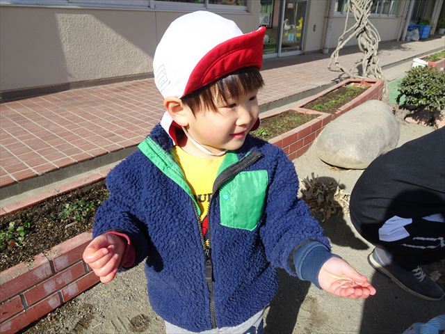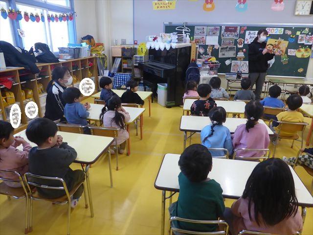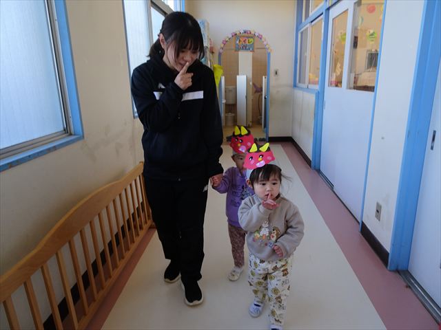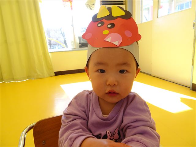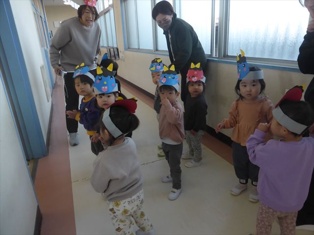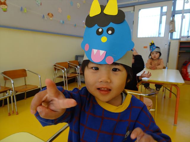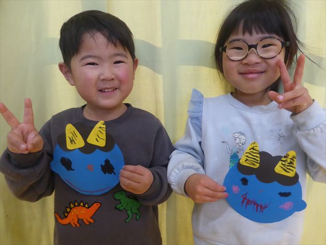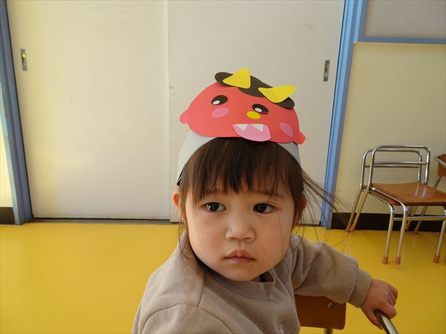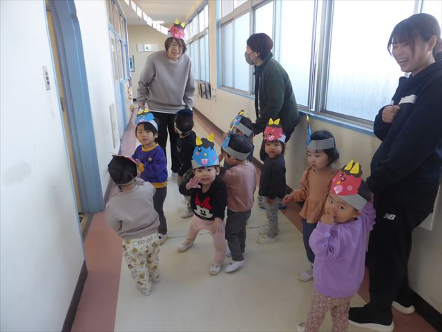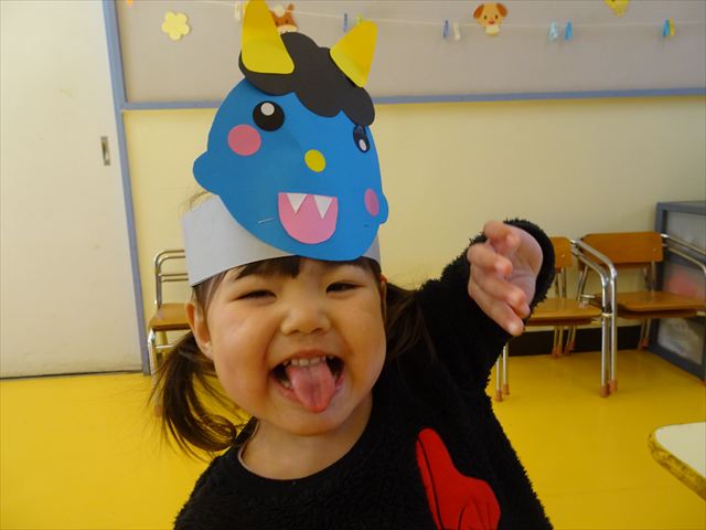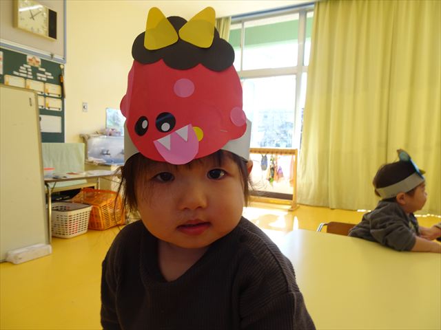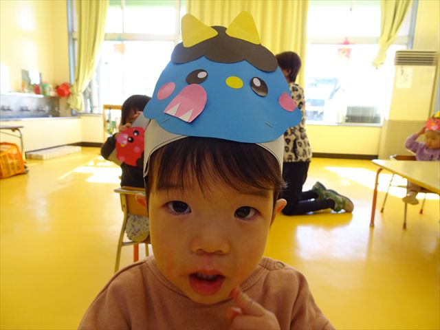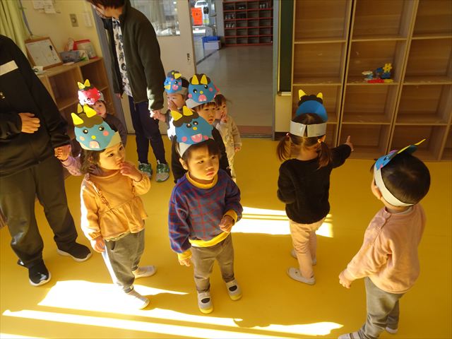 金曜日は、ホームページがアップできず申し訳ありませんでした。金曜日のたんぽぽさんは、鬼のお面作りをしました!満2歳児さんは、顔をシールで貼り、角を両面テープで貼りました。同じシールでも表情豊かな鬼ができて、とても可愛かったです♡その後はお面を被って、幼稚園を散策♪満3歳児さんのお部屋の前を通ると…「おにがきた~!?」と大騒ぎ!びっくり作戦大成功☆