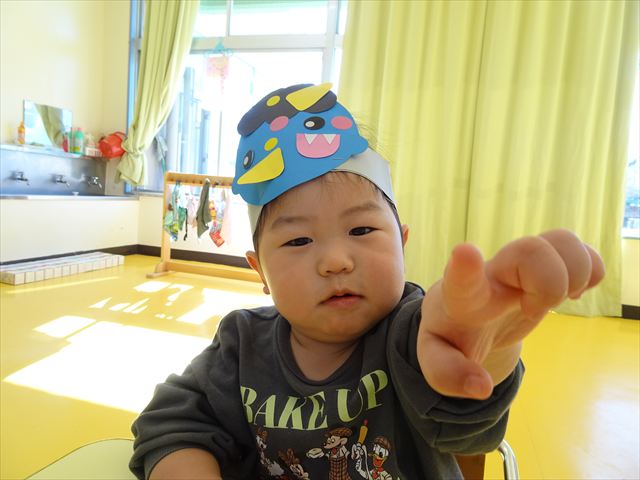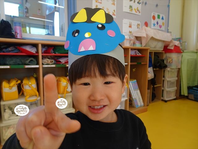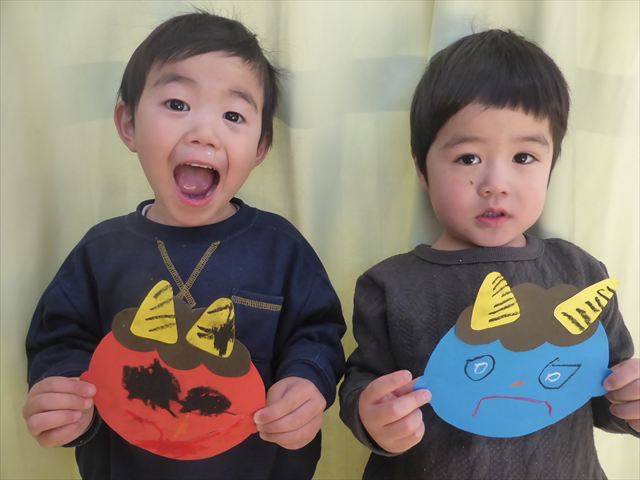 満3歳児さんは、クレパスで顔を描きました。顔を描くのがとても上手になり、こちらも表情豊かな鬼がたくさんできました!そして、今回初めてのりを使って角を付けてみました。「アリさんくらいちょんって付けてみよう」と話をすると、誰一人としてのりをべったり付ける子はいなく、本当にアリさんくらいの量で少しずつ貼りつけてくれました!のりのペタペタする感覚が楽しかったようで、「またやりたい!」と嬉しそうな満3歳児さんでした♪