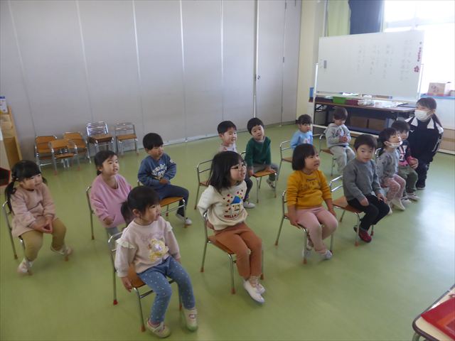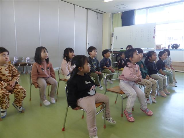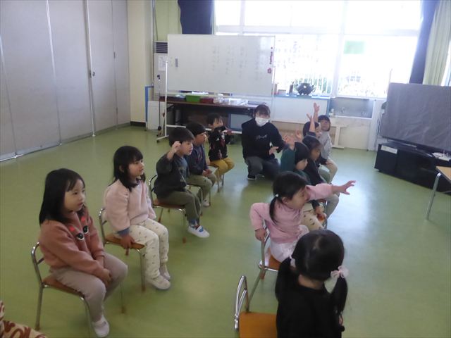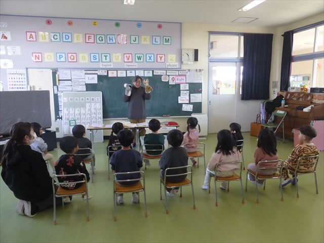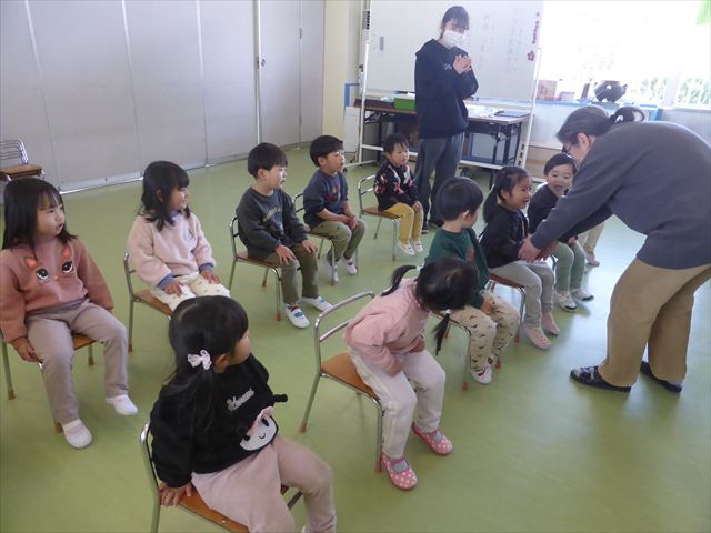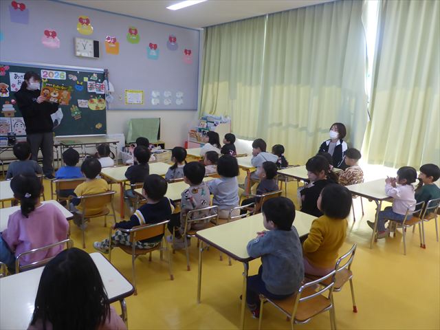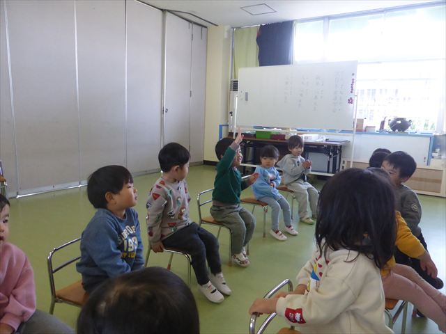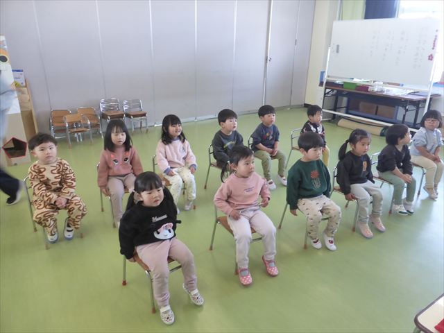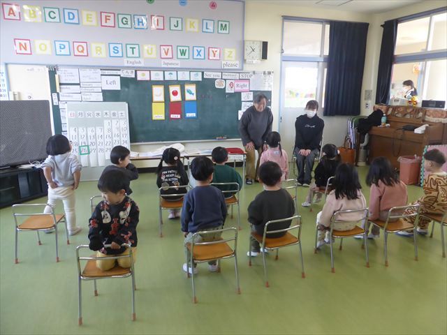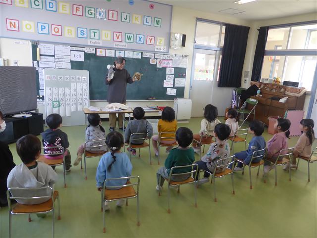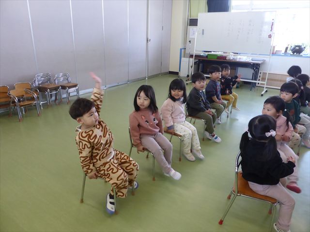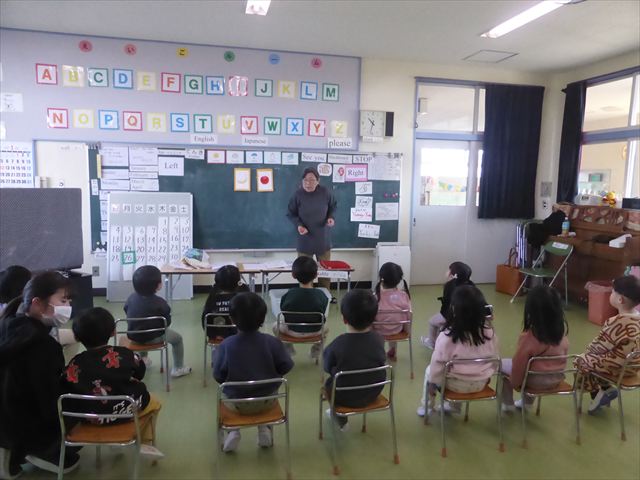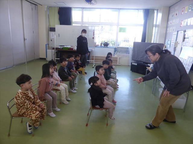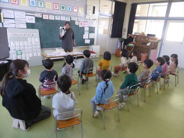 今日の英語教室はさくら組つつじ組合同で行いました。2学期の復習をし、11~20・30までを英語で数えられるように練習しました。年長さんになったら月、日にち、曜日も全て英語で言える様にするよ!とお話があり、子ども達は「わかった!」と頷いていました。