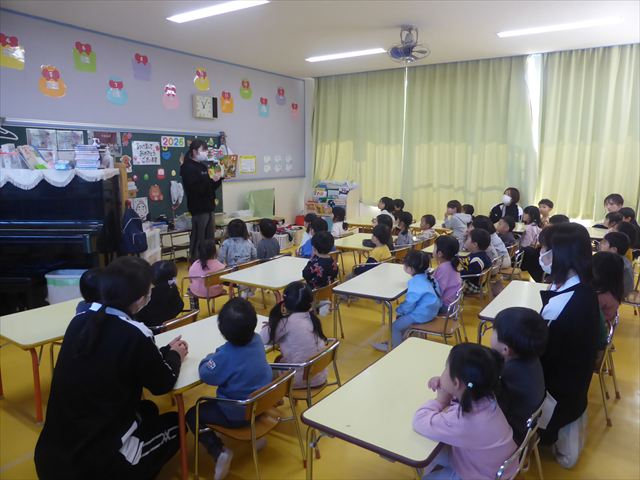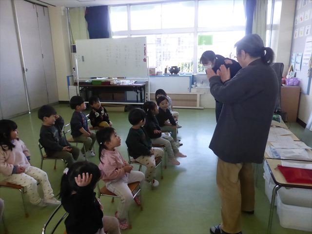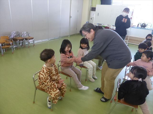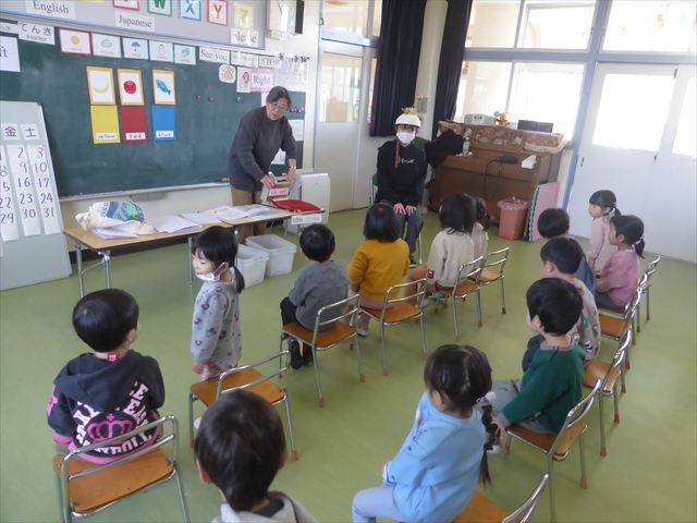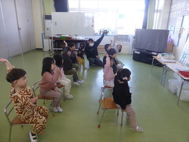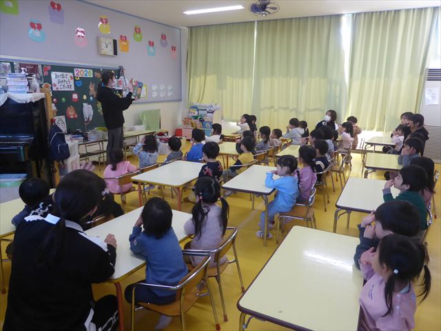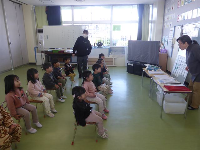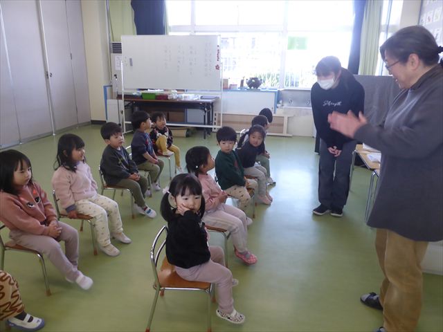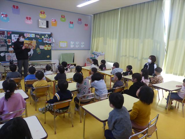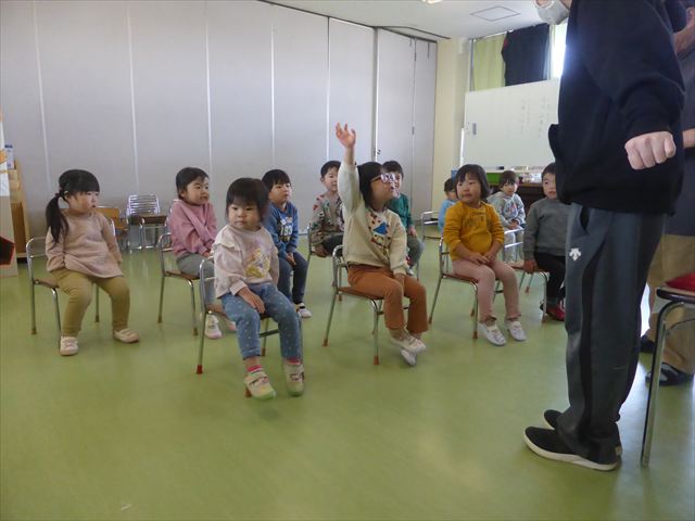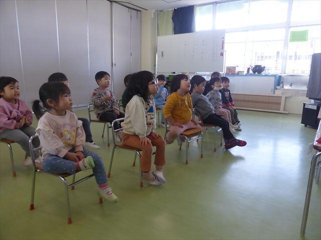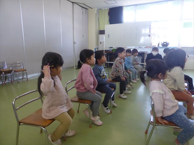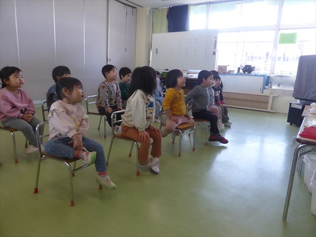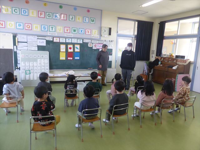 今日の英語教室はさくら組つつじ組合同で行いました。2学期の復習をし、11~20・30までを英語で数えられるように練習しました。年長さんになったら月、日にち、曜日も全て英語で言える様にするよ!とお話があり、子ども達は「わかった!」と頷いていました。