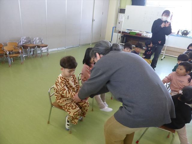 入室前に体育の時間で、来週のなわとび大会に向けて練習を頑張りました。跳べる回数も増えてきて気合が入っていました。またお友だちの回数を数えられるように練習もしました。※写真が無くて申訳ありません。