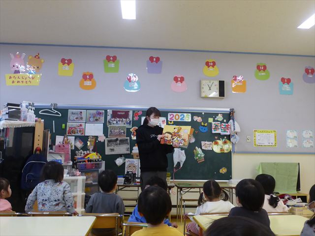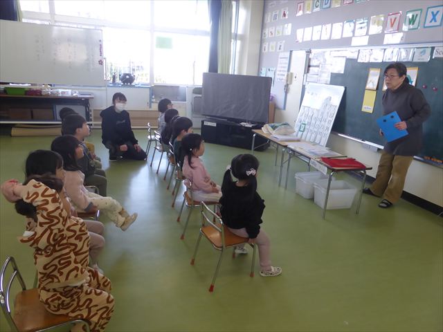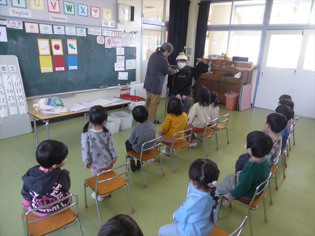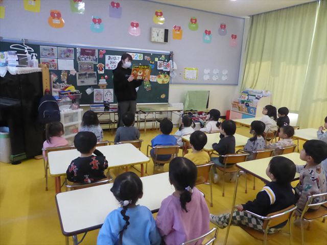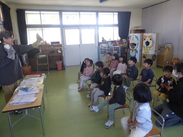 その後は、満2・3歳児さん合同で道徳の時間をしました。今回読んだお話は、紙芝居の「おやおや もったいない」。ライオン王様は、食べる事が大好きな食いしん坊ですが、たくさんの食べ物を頼んでも少し食べたら「もういらない」と残してしまいます。それを見た町のレストランの主人から、「ご飯を作ってみてください」とお願いが。お米を植えて、草刈りをして、稲刈りをしてお米を育てる苦労がよく分かったライオン王様。川の鮭も採ってみて、その大変さに気づきました。そしてお城に帰り、家来たちに鮭おにぎりを作ってあげました。「もったいないから、残さないで食べてね」と、ライオン王様も「もったいない」の心を学ぶことができました!たんぽぽ組のお友だちも、ライオン王様のように「もったいない」の心に気づき、給食花丸を目指して頑張ろう!とお話をしました。おうちでもぜひ「もったいない」のお話をしてみてください(^_^)
