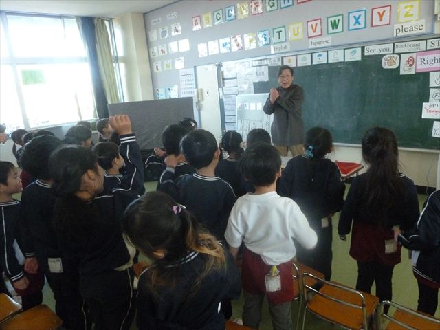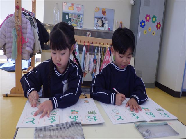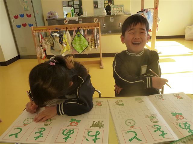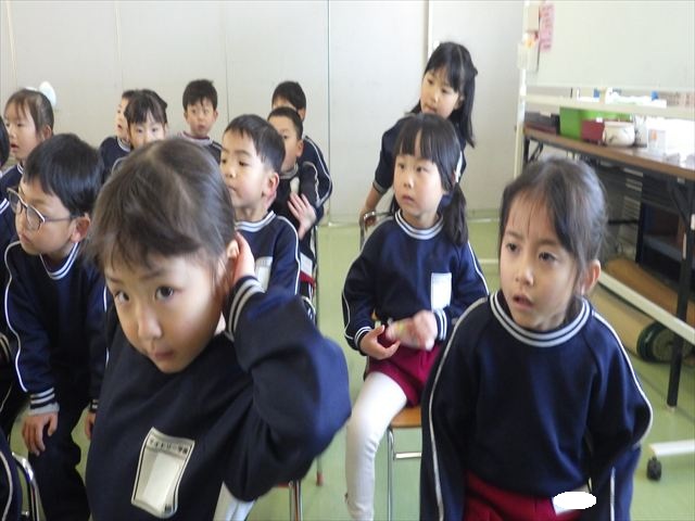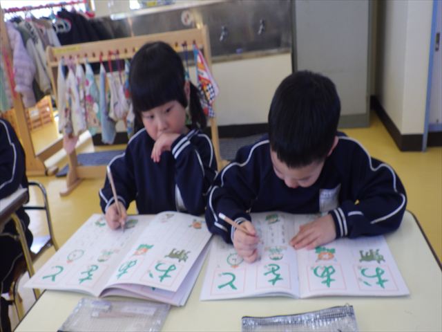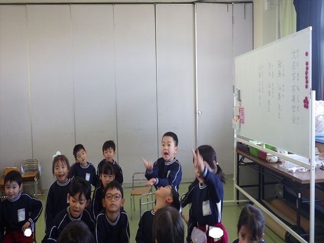 今日の英語教室はさくら組つつじ組合同で行いました。2学期の復習をし、11~20・30までを英語で数えられるように練習しました。年長さんになったら月、日にち、曜日も全て英語で言える様にするよ!とお話があり、子ども達は「わかった!」と頷いていました。 じゃんけんも英語で行い、教室にある物も英語で言ってみたりしました。だんだんと身に付いてきて、楽しみながら取り組むことができました! 英語教室の後は、文字遊びをしました。今日は「と」「を」を書きました。「を」はみんな難しそうに書いていました。久しぶりのもじあそびでしたが頑張りました! 午後は、明日の茶道教室に向けて予習を少しだけしました。みんな、ドキドキワクワクしているようでした。 白い靴下に名前を書いて、袋に入れて持って来てください。