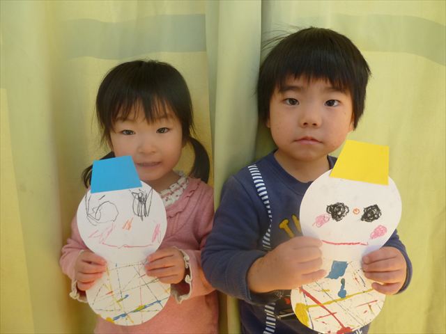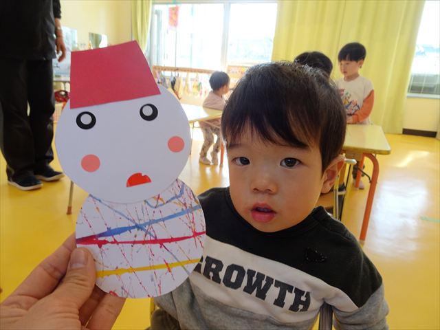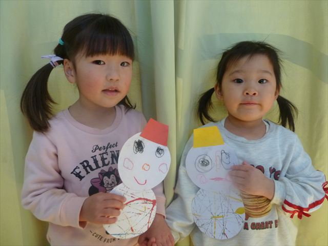 満3歳児さんは、顔をクレパスで描き、体と帽子はのりで貼りました。のりの使い方も慣れてきて、「ぺたぺた!ぎゅっぎゅっぎゅ!」と掛け声も言いながら貼っていました!(^^)!