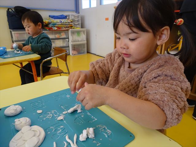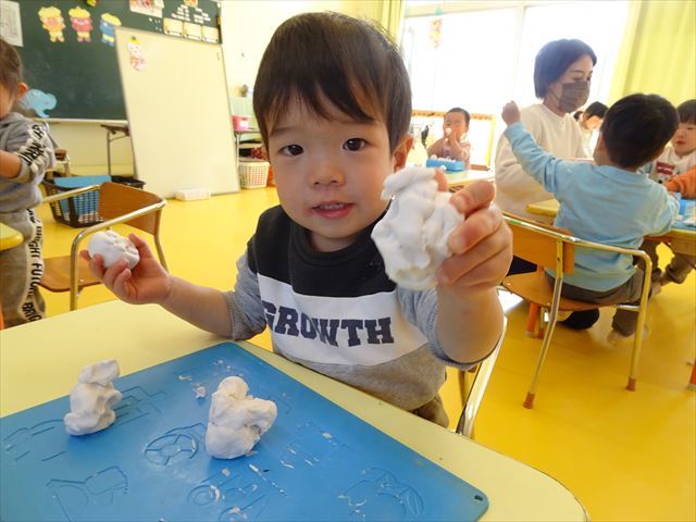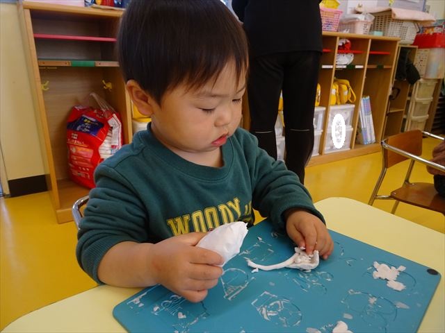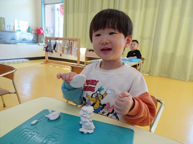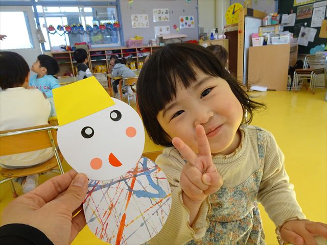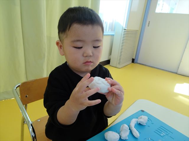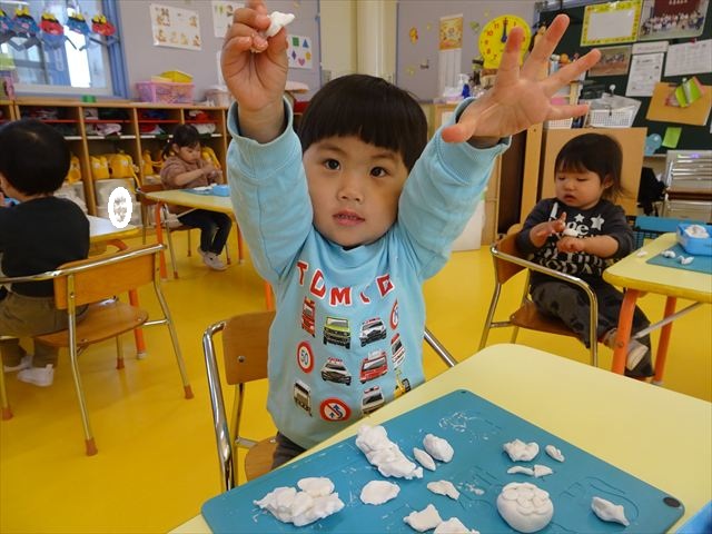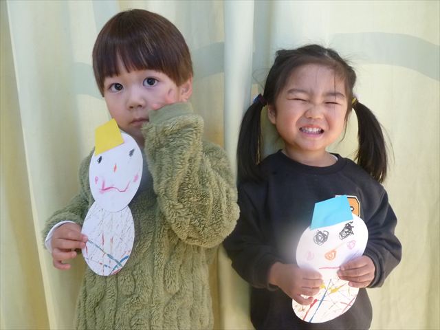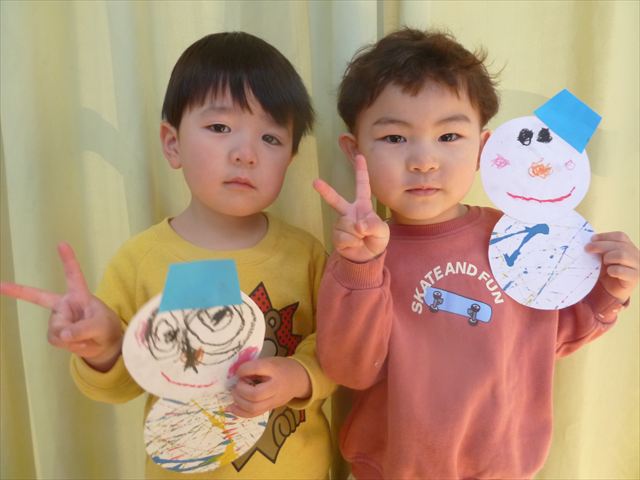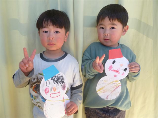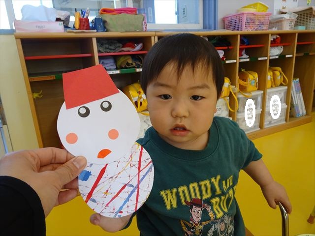 今日は、廊下飾り作りをしました。冬と言えば雪!ということで、まだ雪は降っていませんが、降るといいな~と願いを込めて雪だるまを作りました(^^)/体は、先日行なった絵の具遊びの画用紙を使い、色鮮やかなお洋服にしました♪満2歳児さんは、顔をシールで貼り、体と帽子を両面テープで貼りました。シールも両面テープもお手の物!上手にペタペタ貼ってくれました。上手すぎて早く終わってしまったので、粘土遊びもしました☆