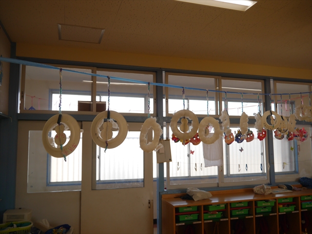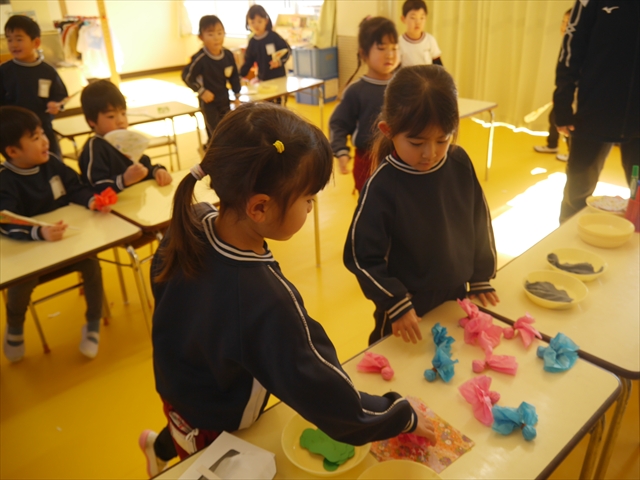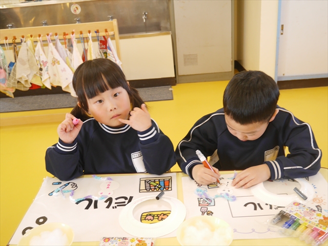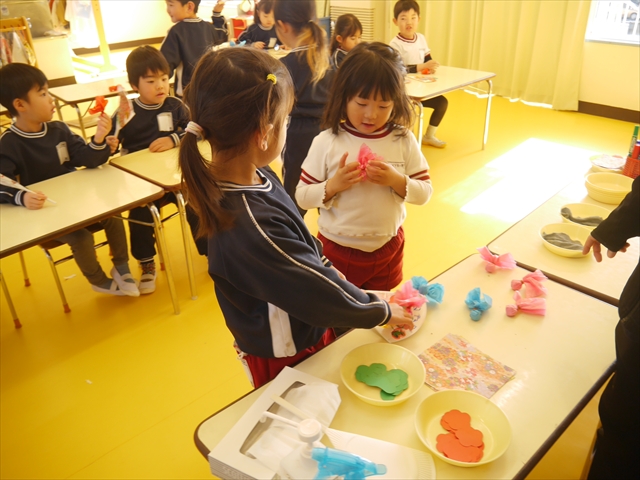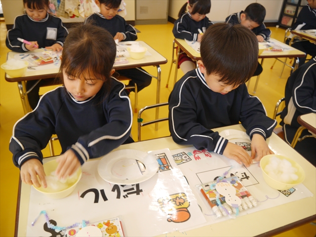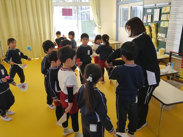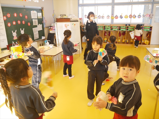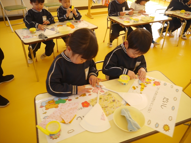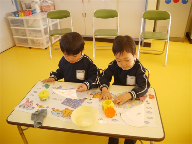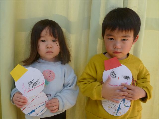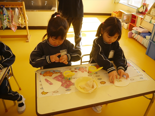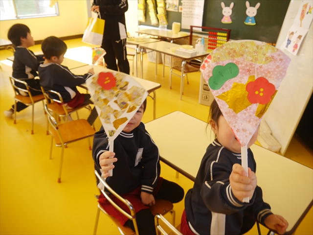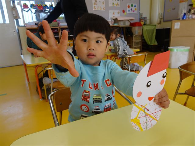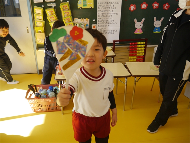 つつじ組は、羽子板製作をしました。あらかじめ用意した紙皿の板に好きな折り紙を破いて貼りました。世界に一つだけの素敵な羽子板ができました!その後は、完成した羽子板で遊びました♪お家でも遊んでみて下さい☆