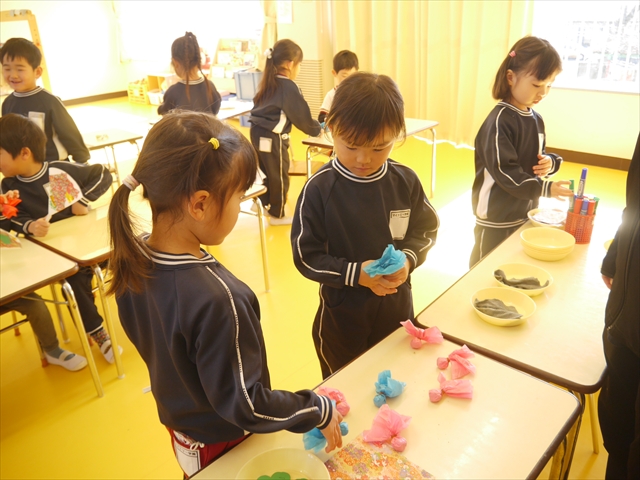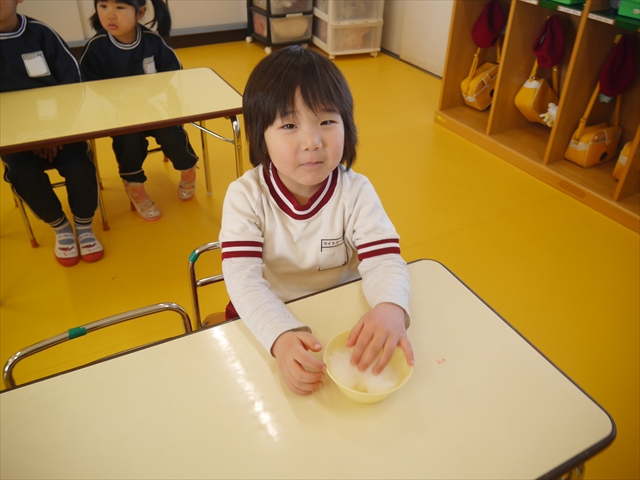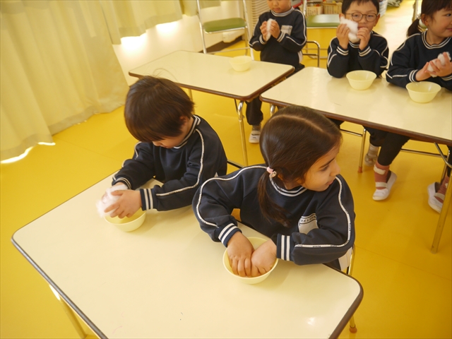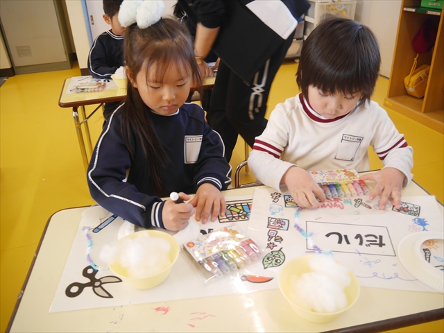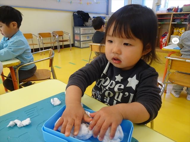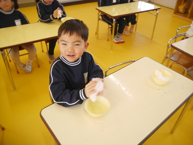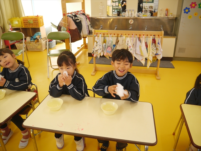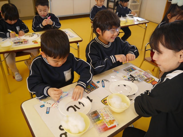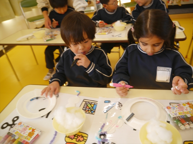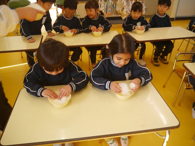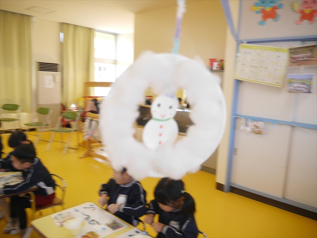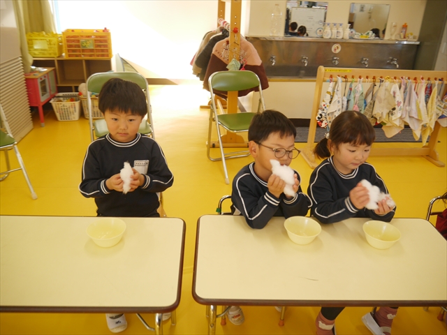 さくら組は、4月から色々なことを経験してきたことを写真を見ながら振り返り、みんながさくら組さんでこれからやりたい願い事は何かな?と話し合いました。日ごろから雪が降ることを心待ちにしている子どもたちは「雪遊びがしたい!」と。そこで今日は、わたを使って雪だるま飾り作りをしました。わたを優しく扱って可愛らしい飾りができ上りました。今シーズン雪が降って、子どもたちは雪遊びが出来るでしょうか!?