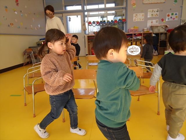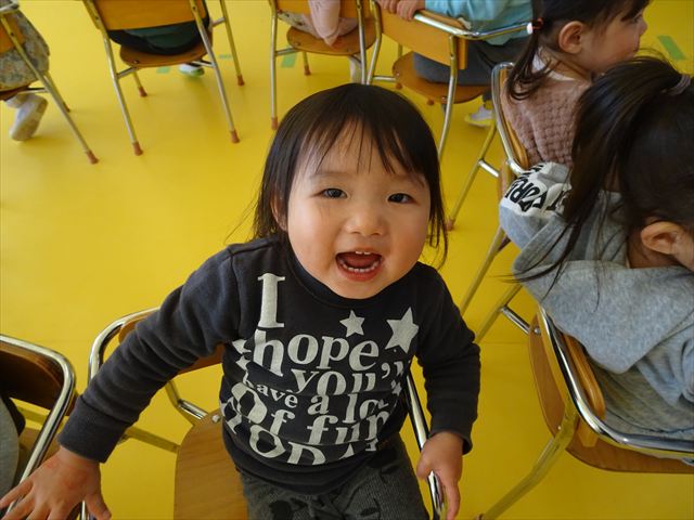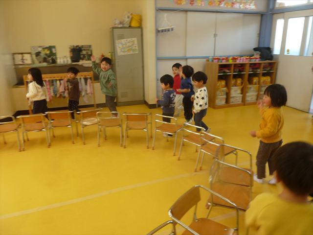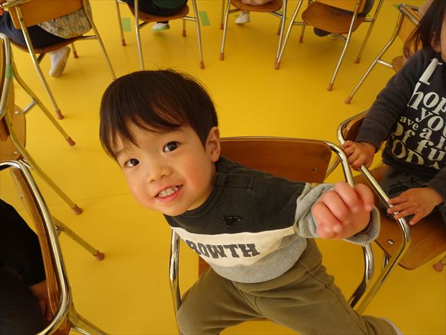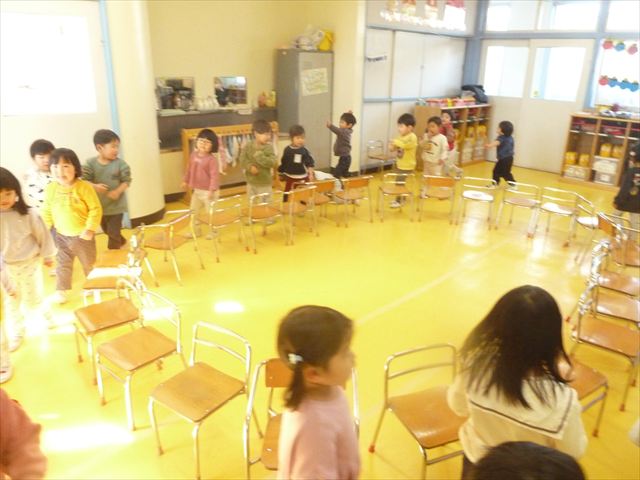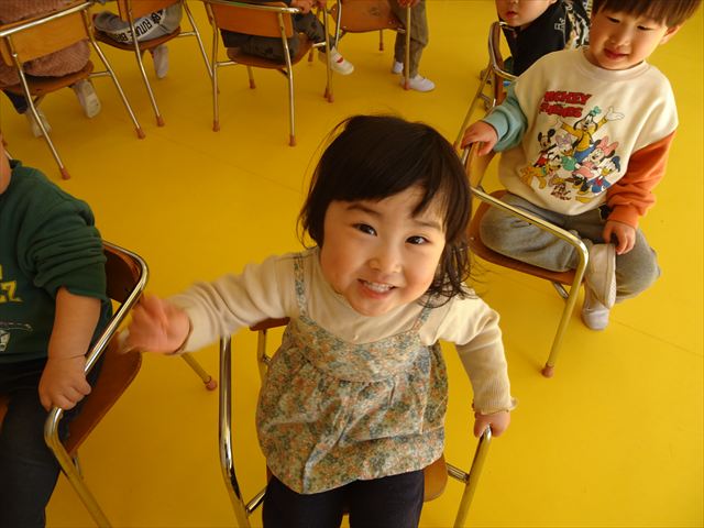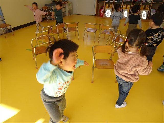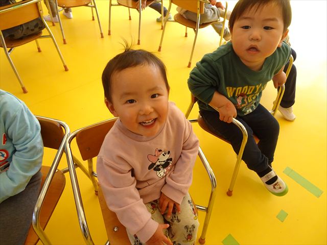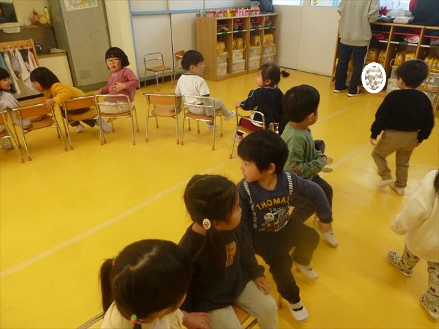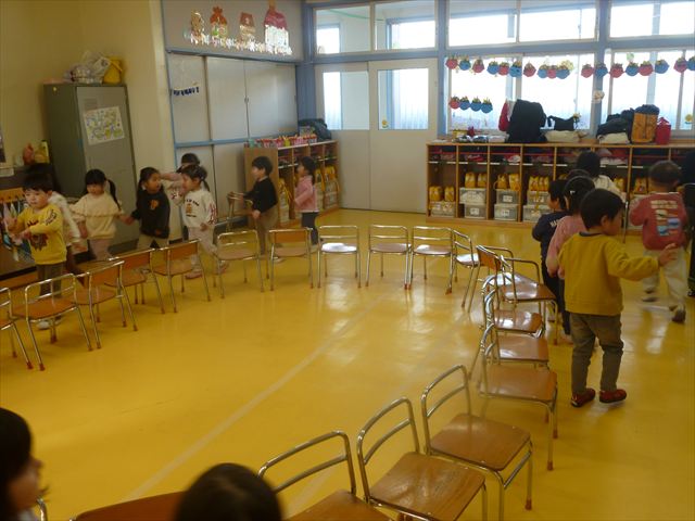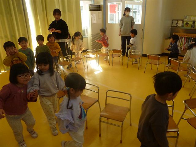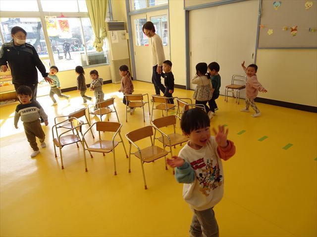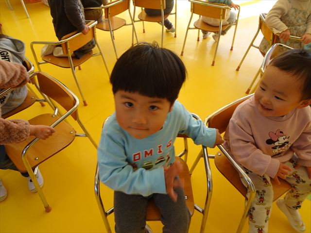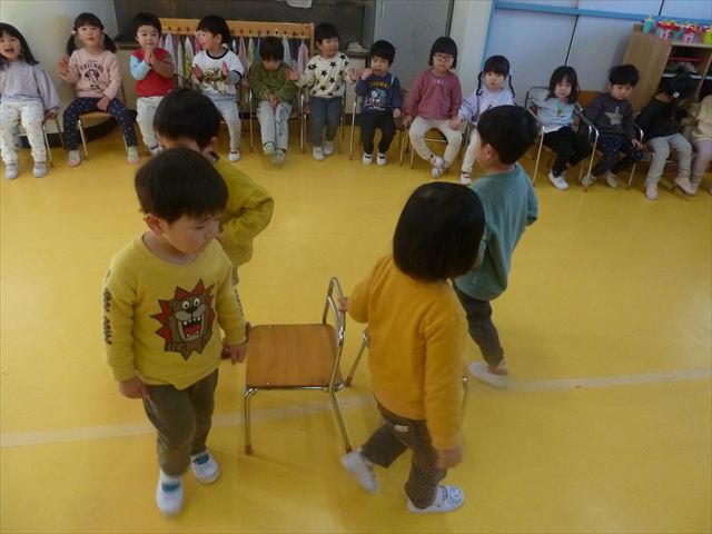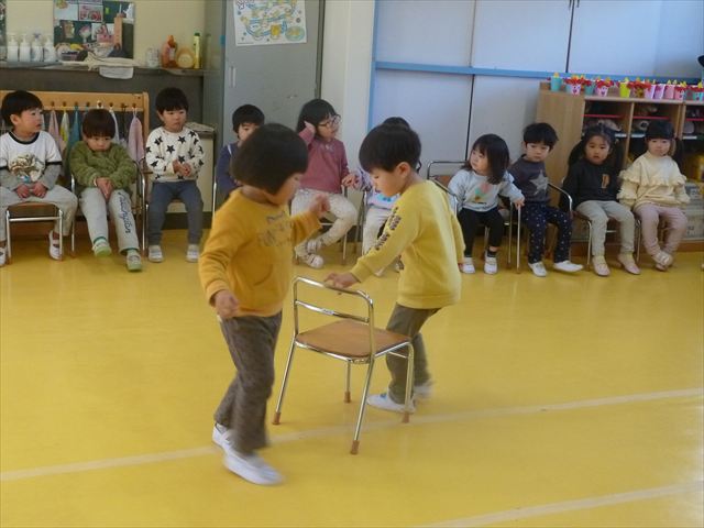 午後は、集団遊びで椅子取りゲームをしました。初めにみんなでルールを確認。音楽が止まったら座る!が身についてきました。そして、椅子を少しずつ減らしてチャンピオンを決定!途中で負けてしまったお友だちも応援隊となり、「がんばれ~!」とお友だちを応援してくれました(