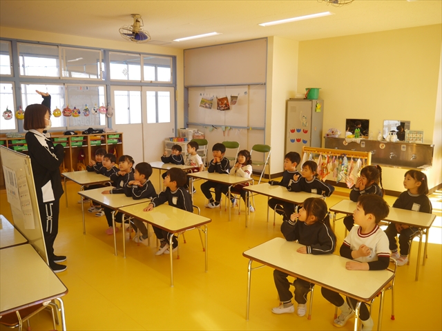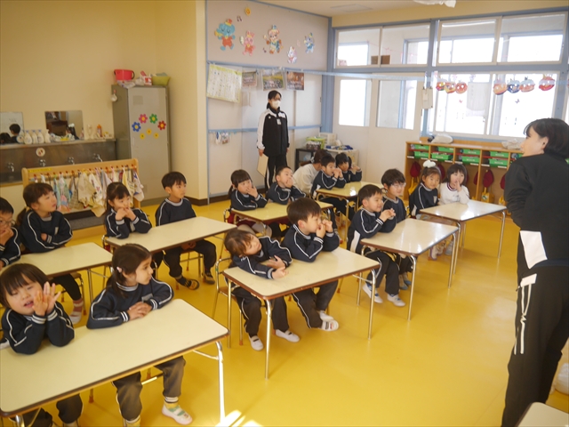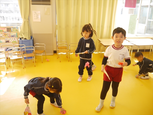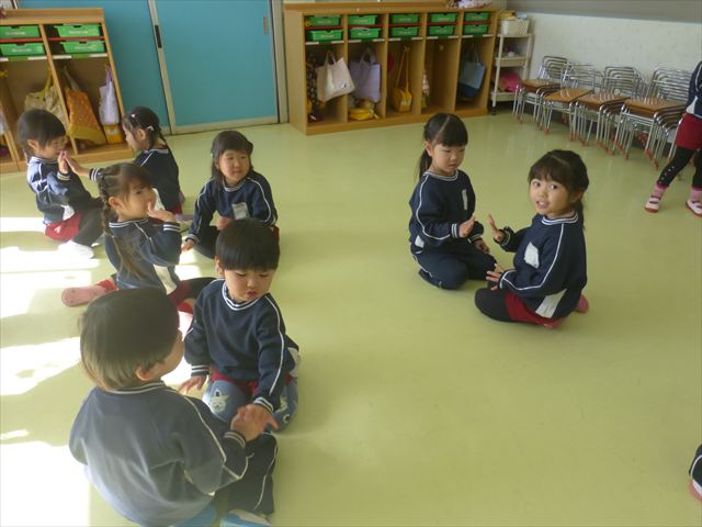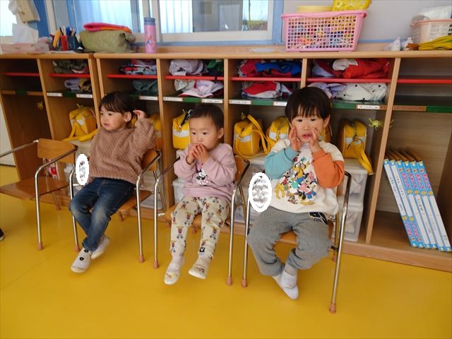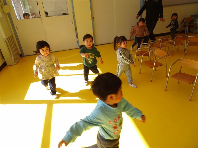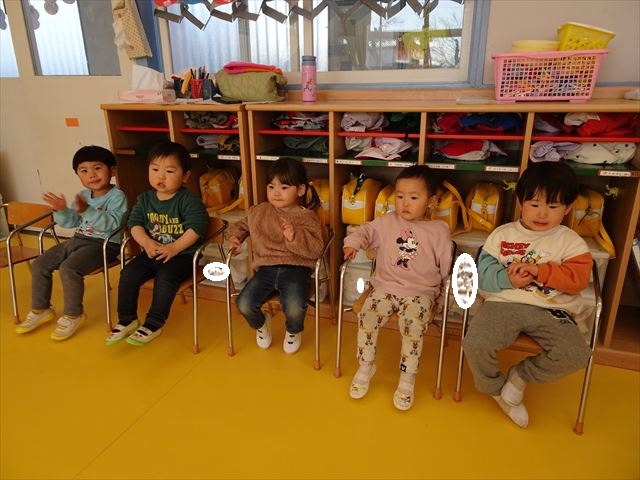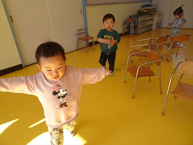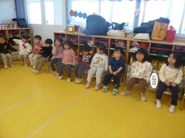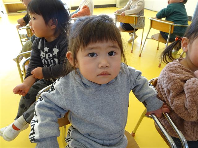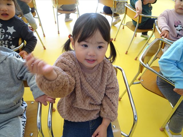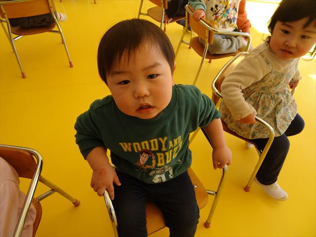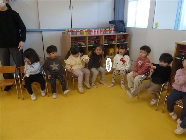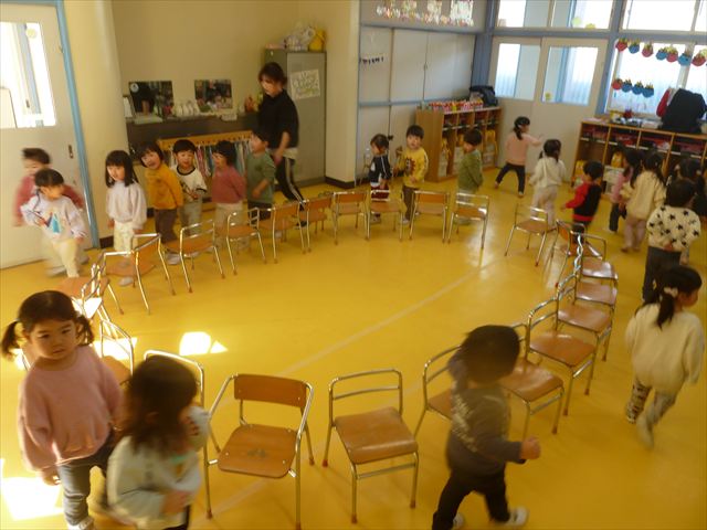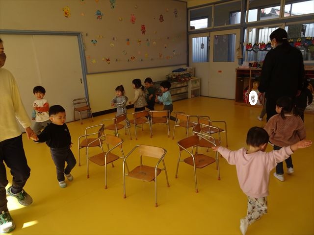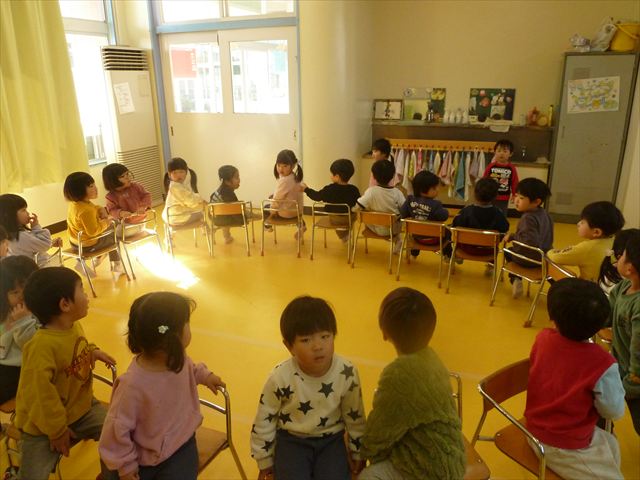 午後は、集団遊びで椅子取りゲームをしました。初めにみんなでルールを確認。音楽が止まったら座る!が身についてきました。そして、椅子を少しずつ減らしてチャンピオンを決定!途中で負けてしまったお友だちも応援隊となり、「がんばれ~!」とお友だちを応援してくれました(
