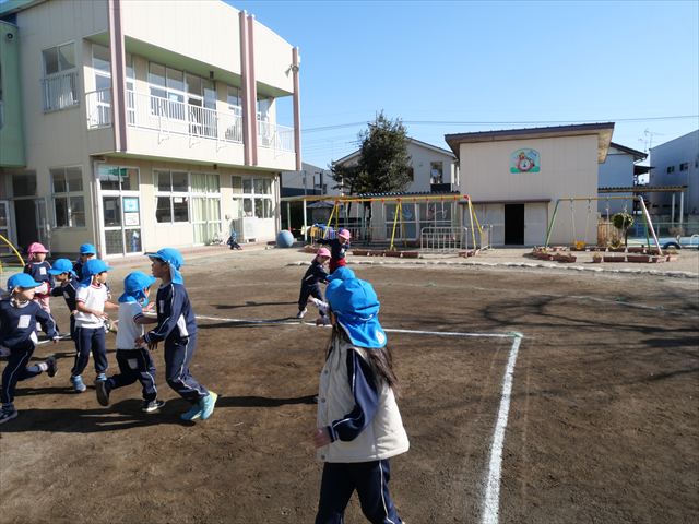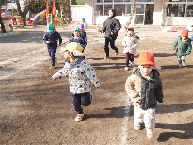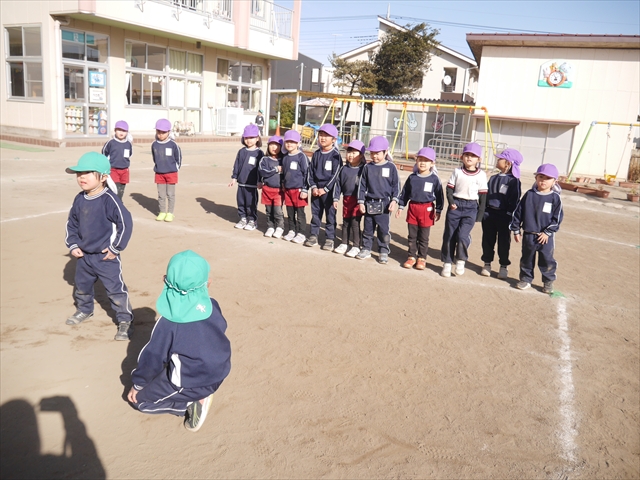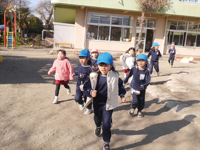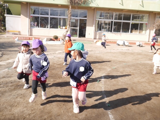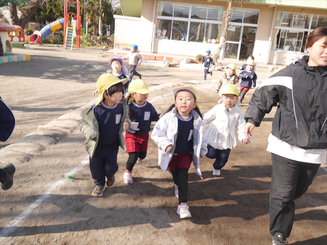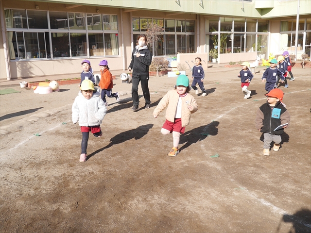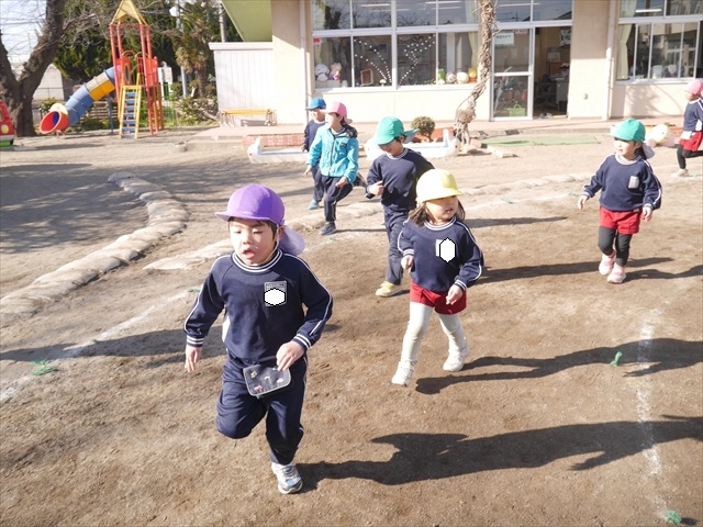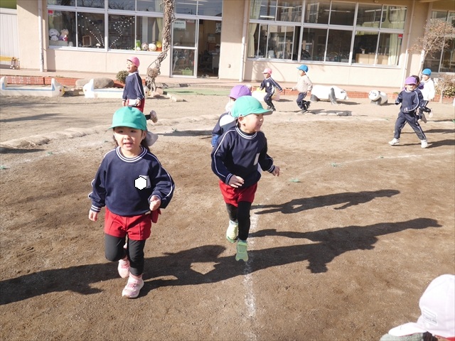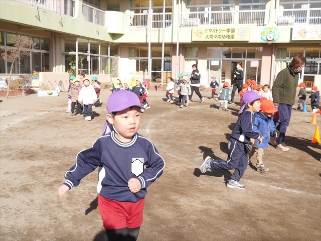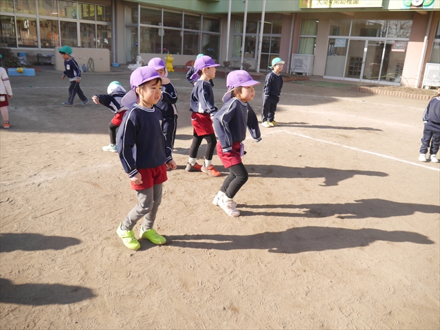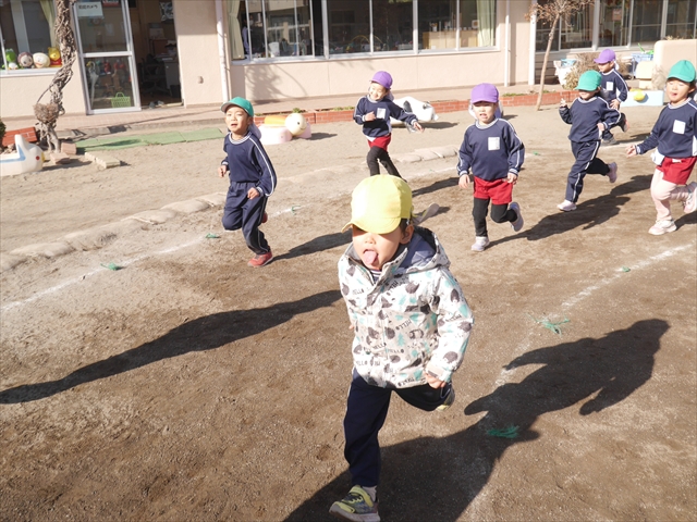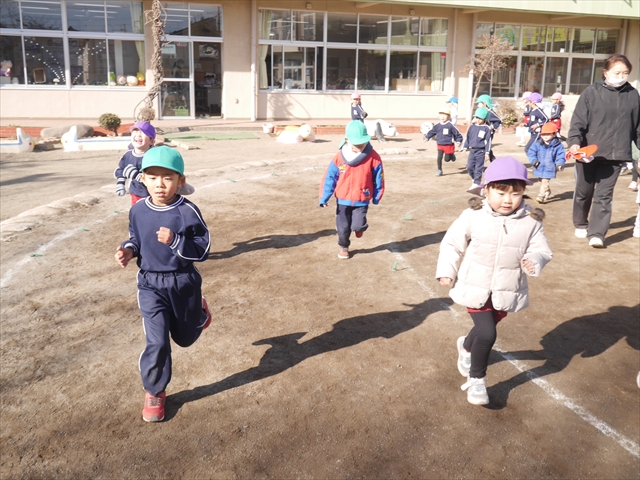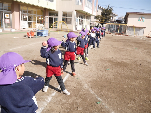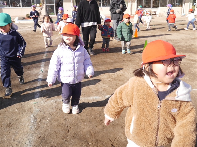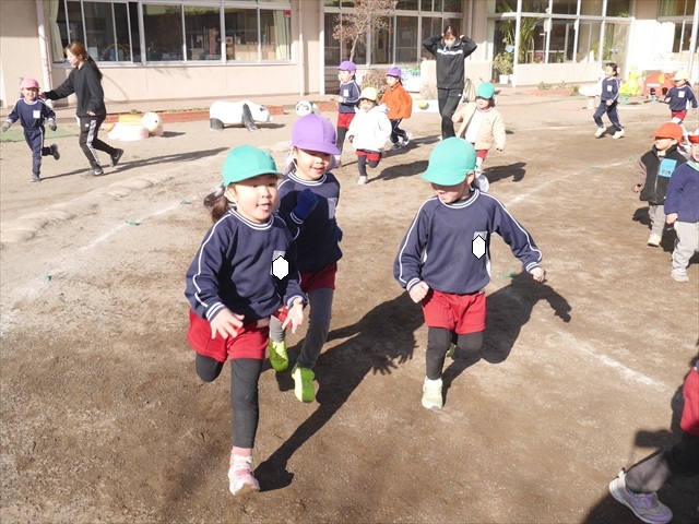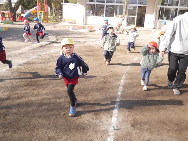 今日も朝から寒かったですが、子どもたちは元気です!スタートと同時に元気いっぱい走り出し、「はいよろこんで」の音楽に合わせ、2分35秒間、全力で最後まで頑張り、走り抜けました!えらい!えらい! 子どもたち体力・持久力が大分ついてきました!(^_^)v \(^_^)/