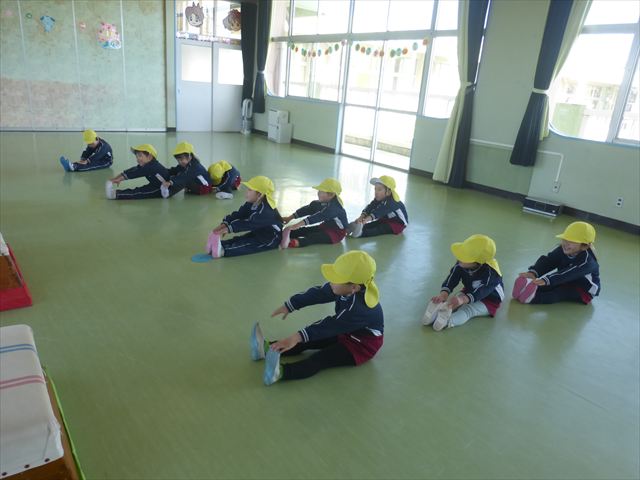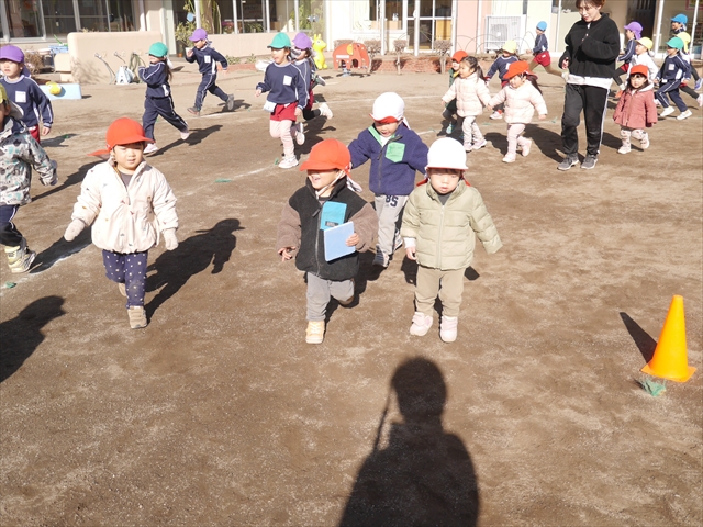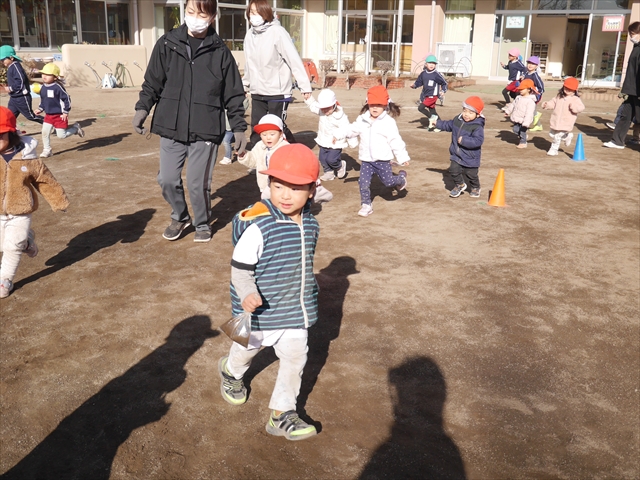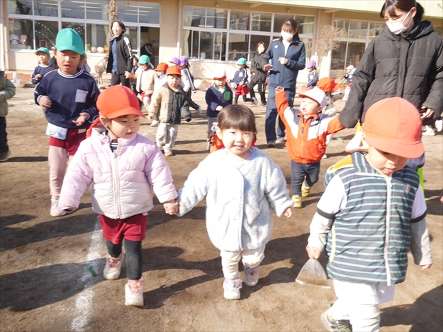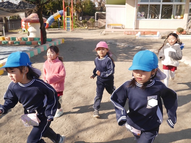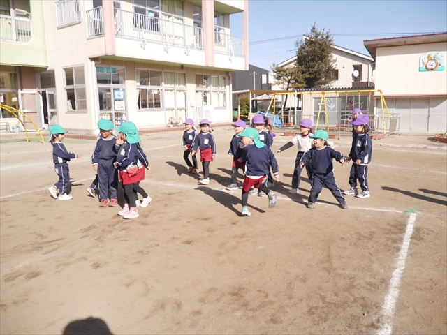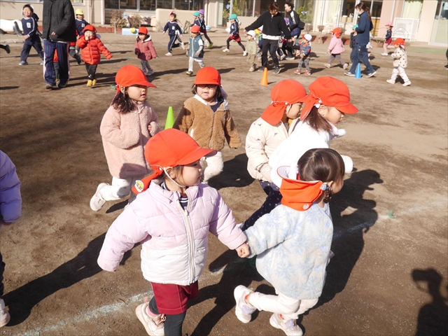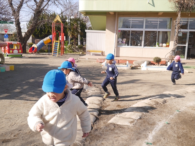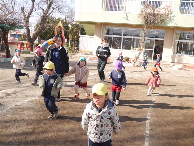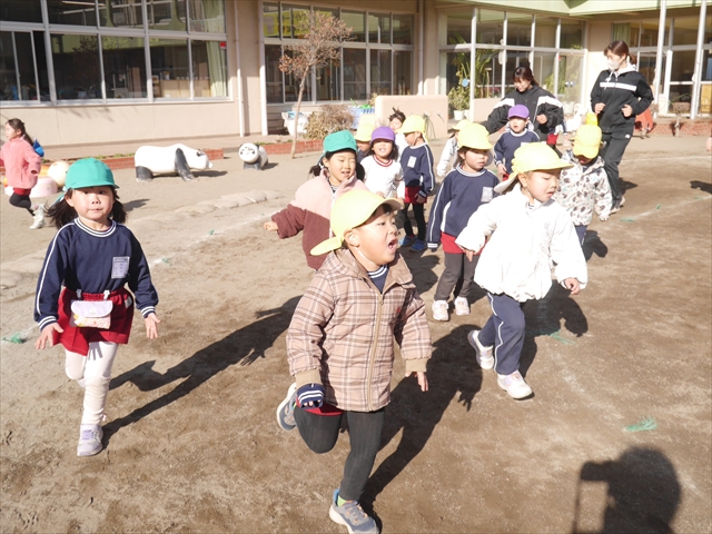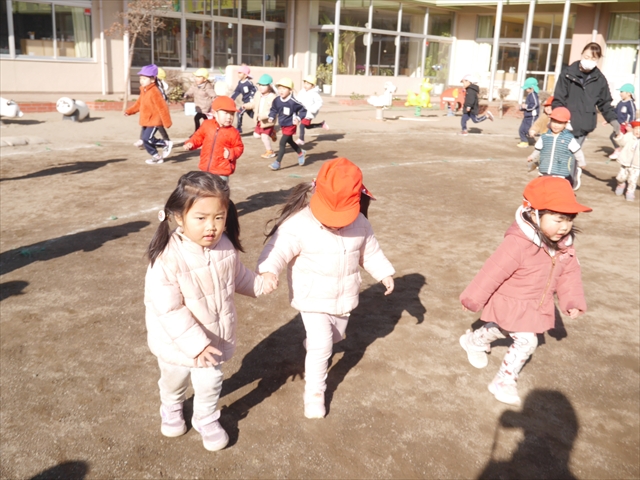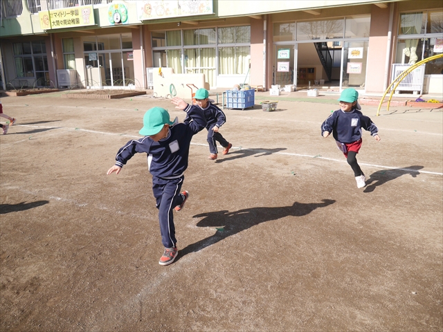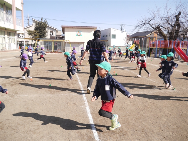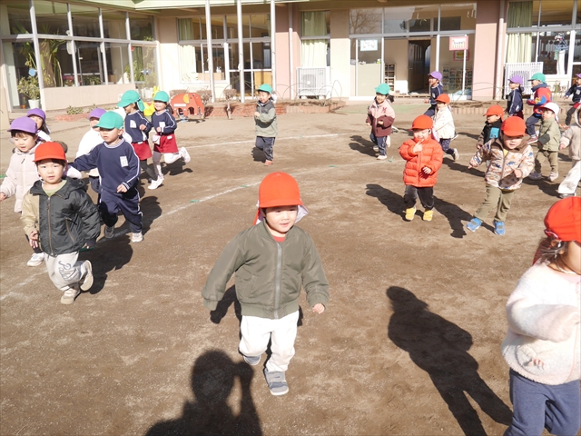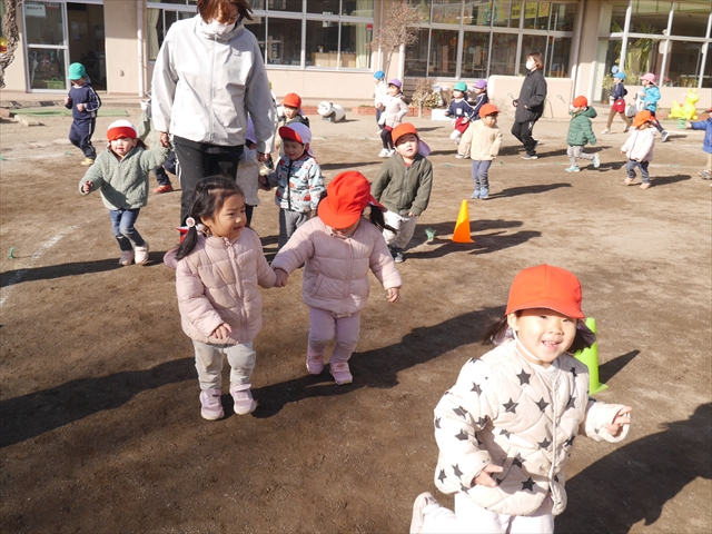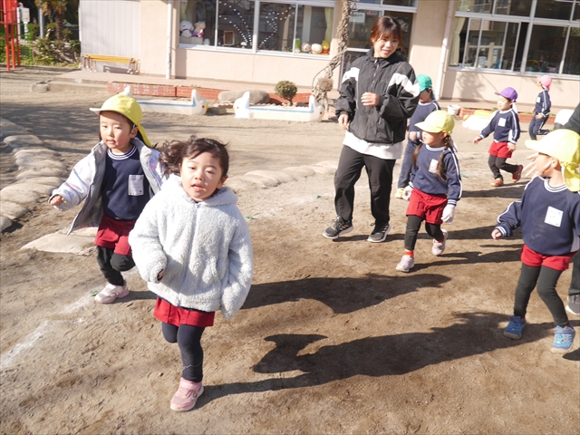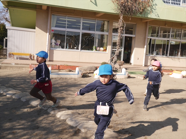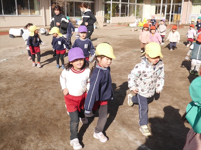 今日も朝から寒かったですが、子どもたちは元気です!スタートと同時に元気いっぱい走り出し、「はいよろこんで」の音楽に合わせ、2分35秒間、全力で最後まで頑張り、走り抜けました!えらい!えらい! 子どもたち体力・持久力が大分ついてきました!(^_^)v \(^_^)/