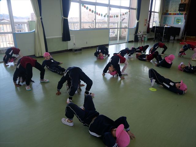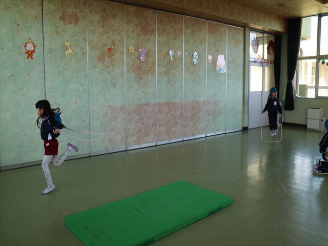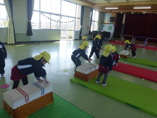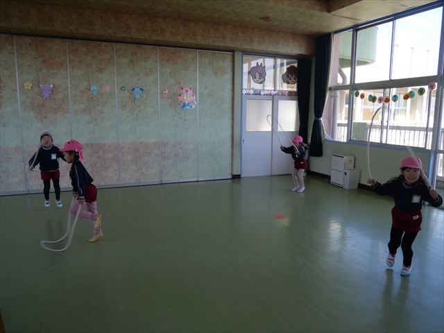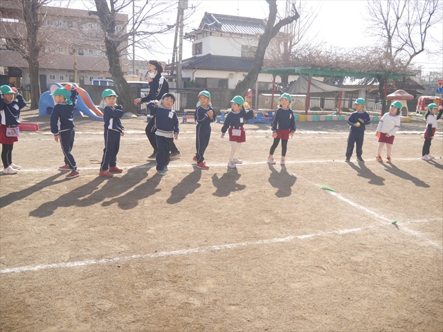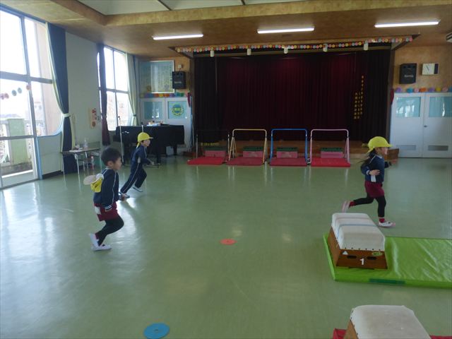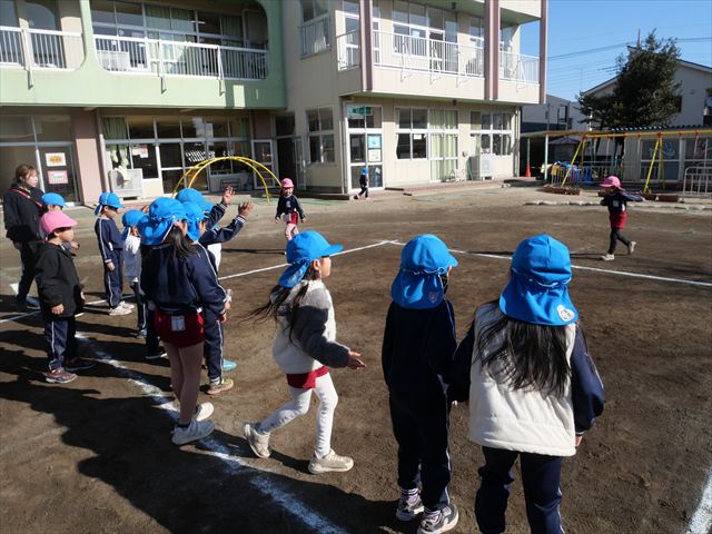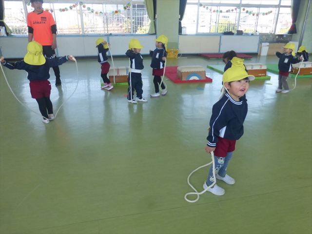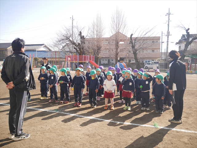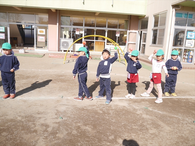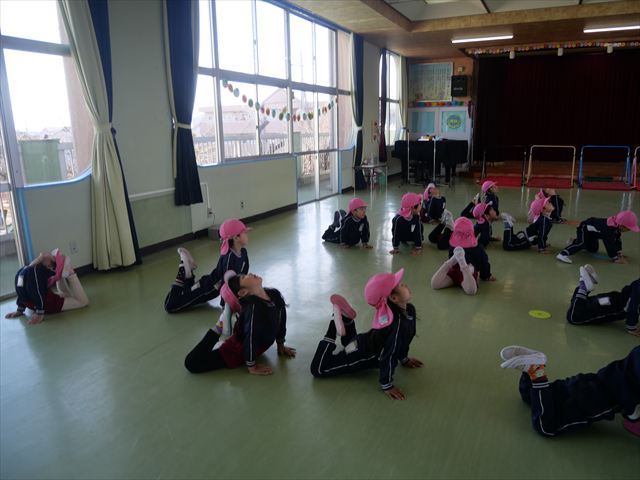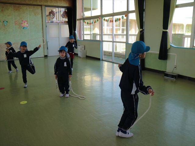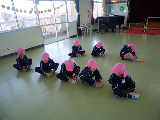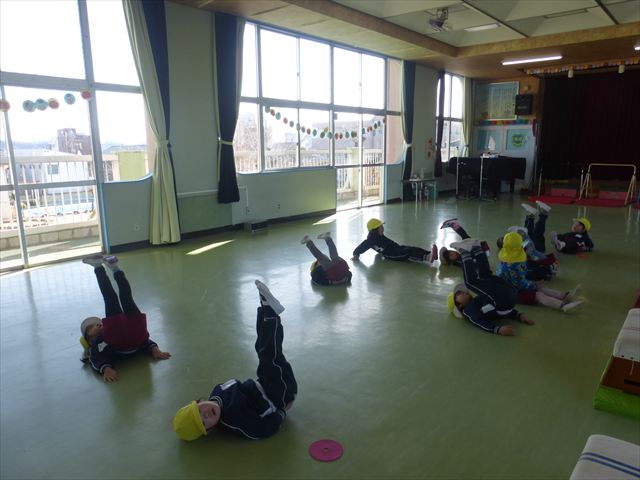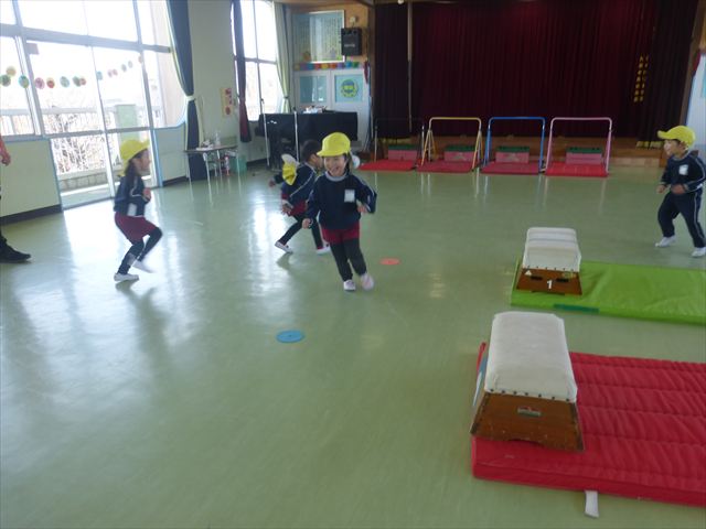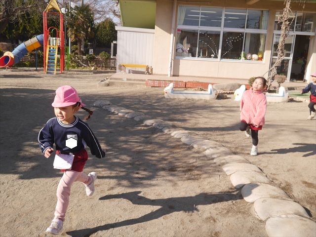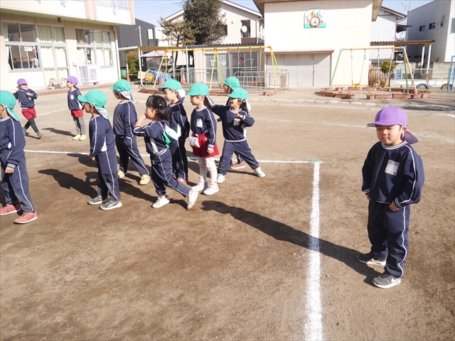 今日も朝から寒かったですが、子どもたちは元気です!スタートと同時に元気いっぱい走り出し、「はいよろこんで」の音楽に合わせ、2分35秒間、全力で最後まで頑張り、走り抜けました!えらい!えらい! 子どもたち体力・持久力が大分ついてきました!(^_^)v \(^_^)/