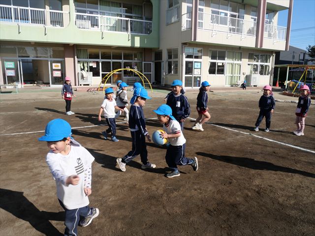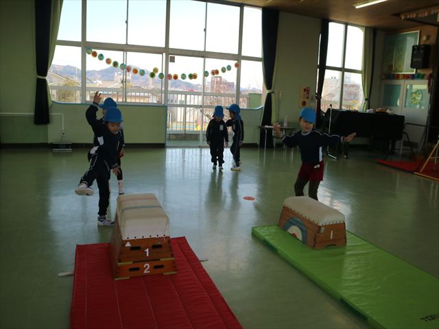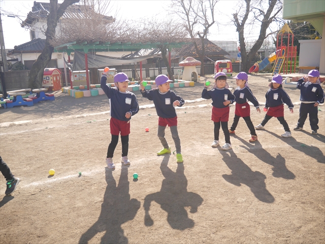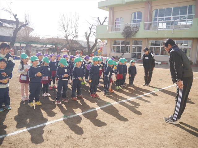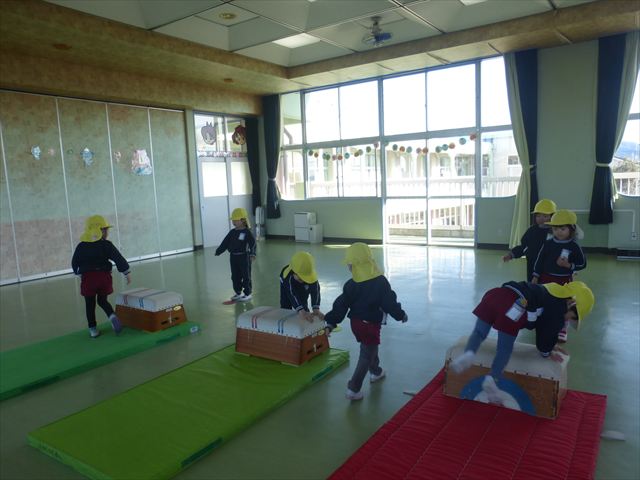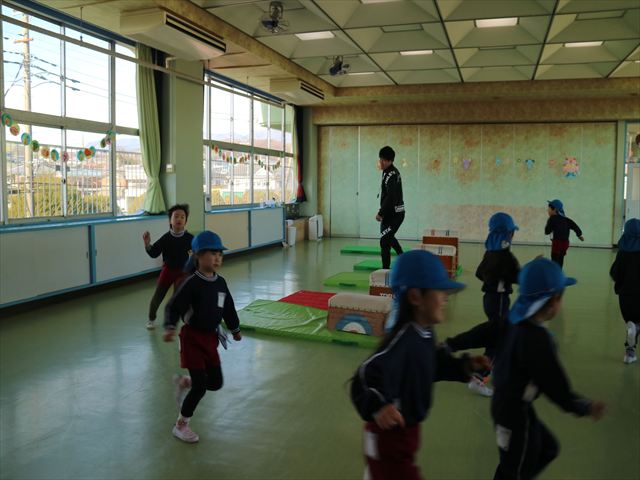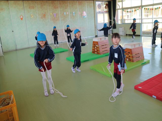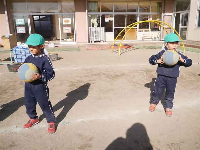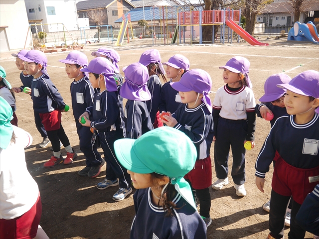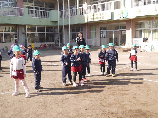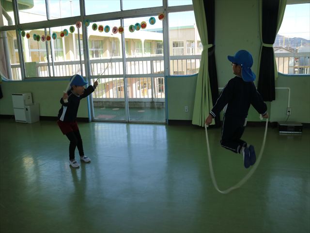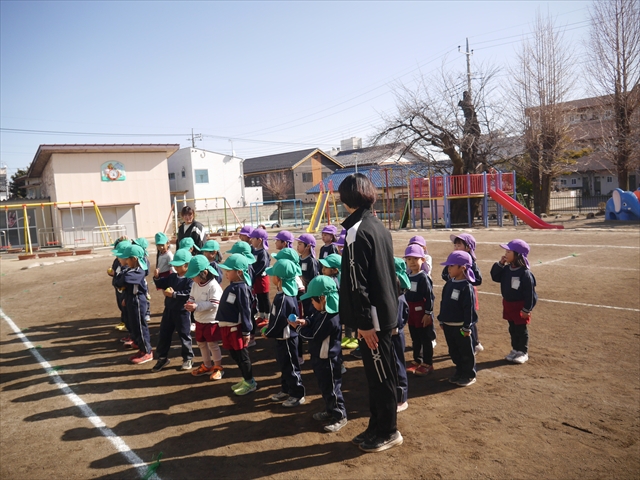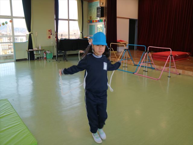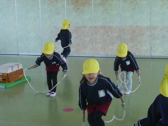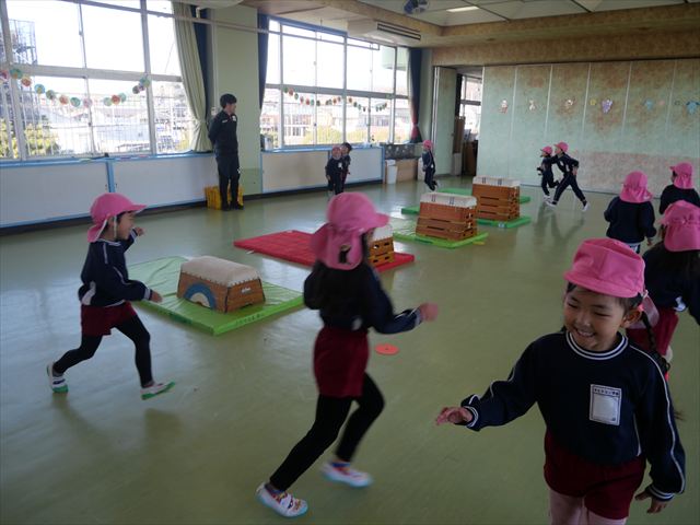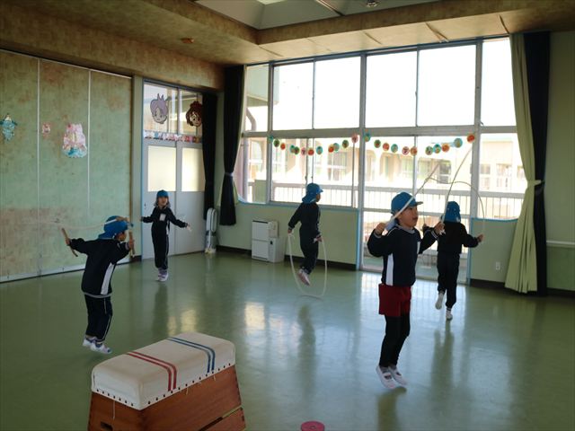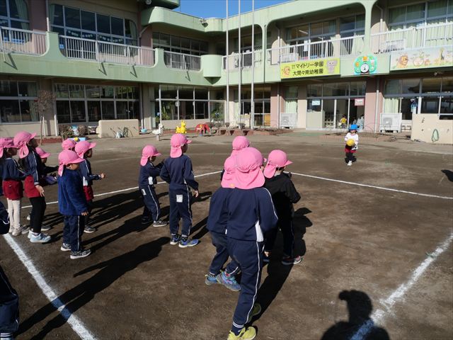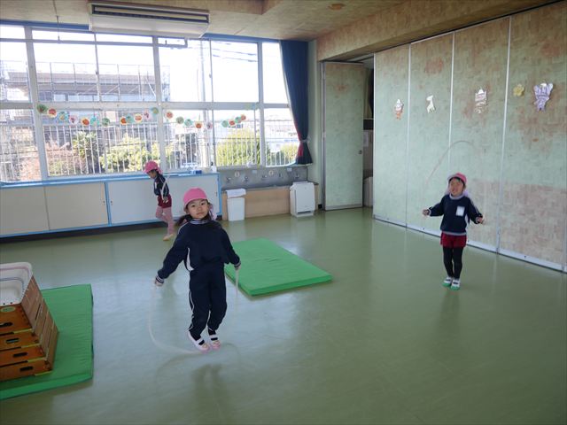 今日も朝から寒かったですが、子どもたちは元気です!スタートと同時に元気いっぱい走り出し、「はいよろこんで」の音楽に合わせ、2分35秒間、全力で最後まで頑張り、走り抜けました!えらい!えらい! 子どもたち体力・持久力が大分ついてきました!(^_^)v \(^_^)/