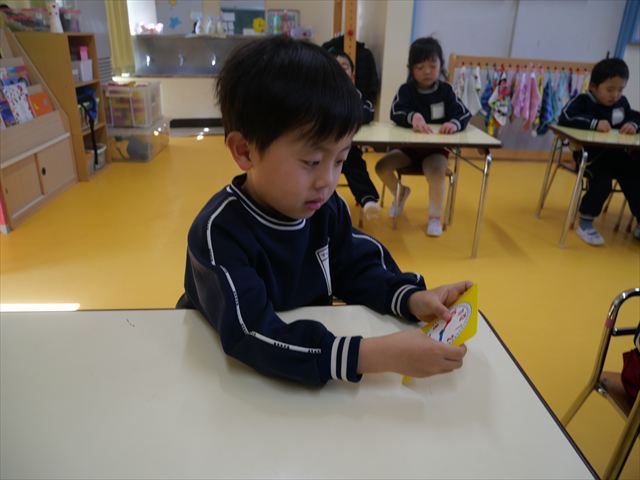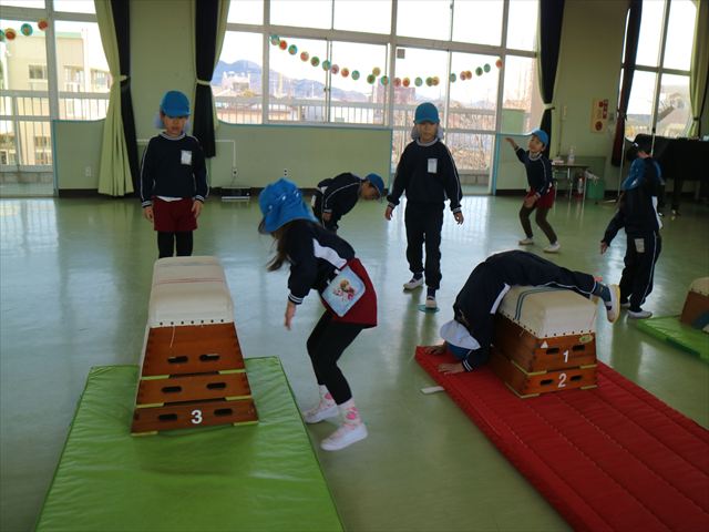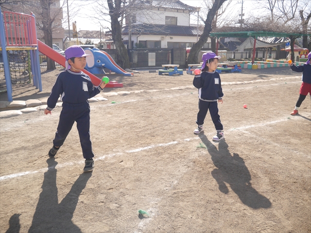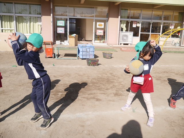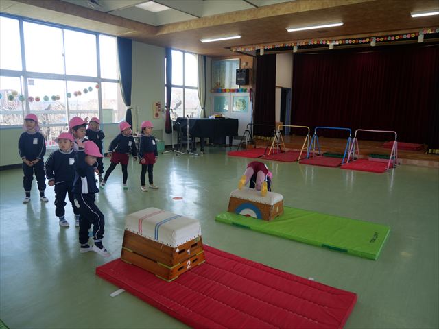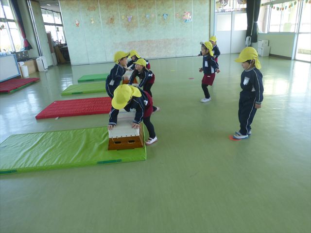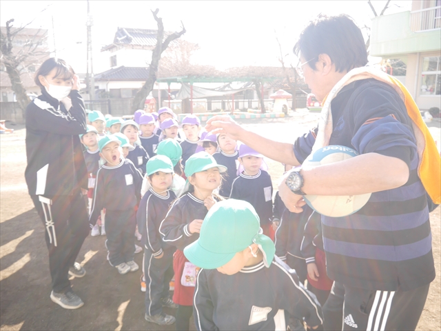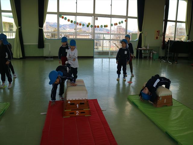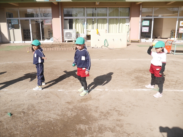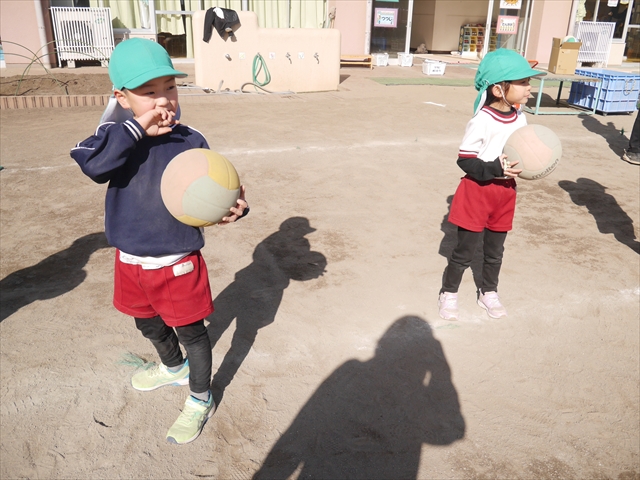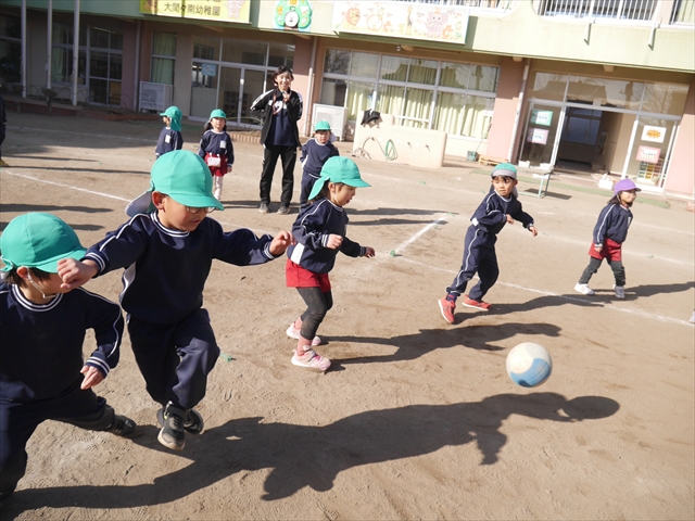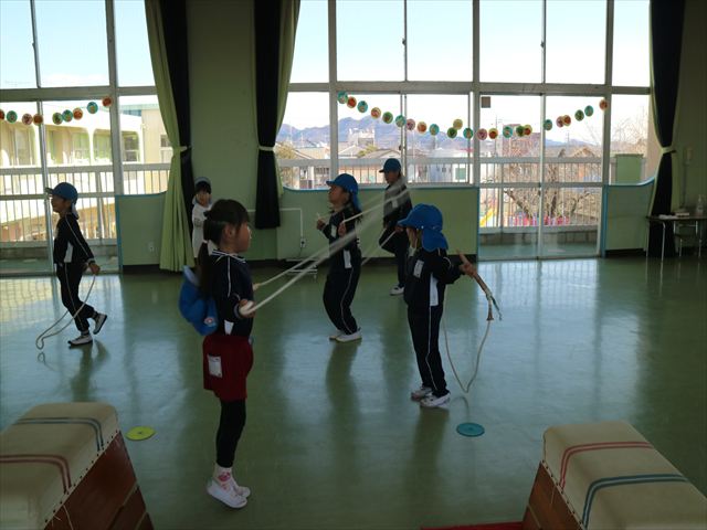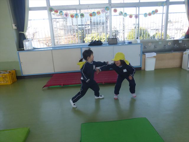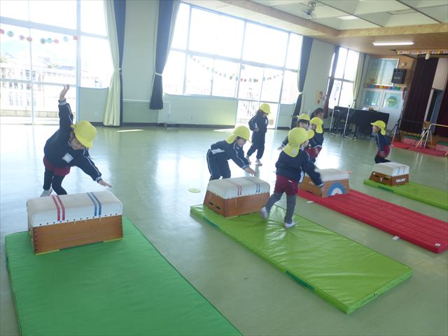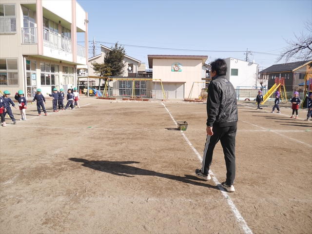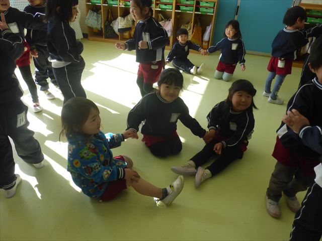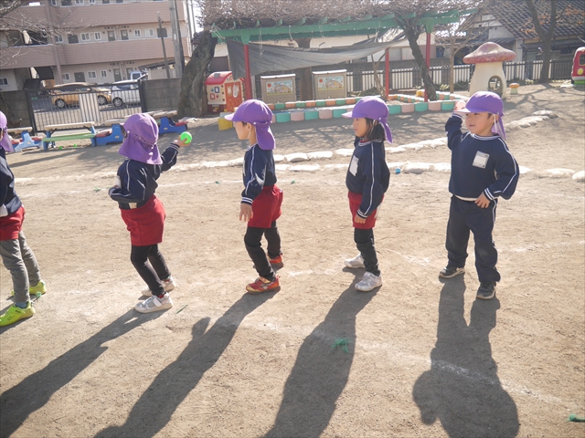 今日も朝から寒かったですが、子どもたちは元気です!スタートと同時に元気いっぱい走り出し、「はいよろこんで」の音楽に合わせ、2分35秒間、全力で最後まで頑張り、走り抜けました!えらい!えらい! 子どもたち体力・持久力が大分ついてきました!(^_^)v \(^_^)/